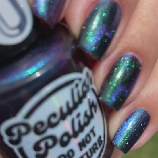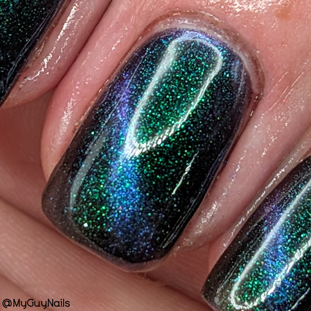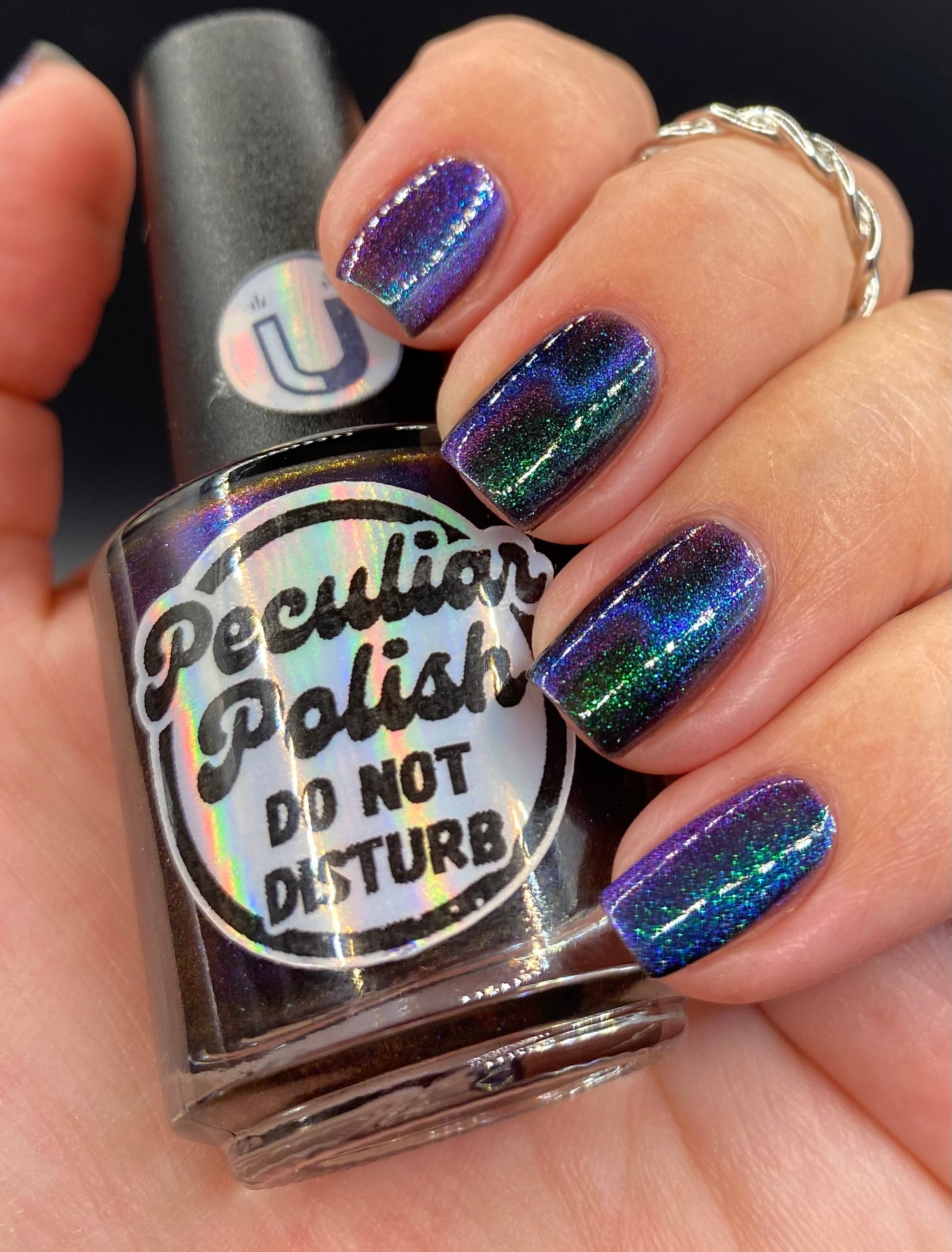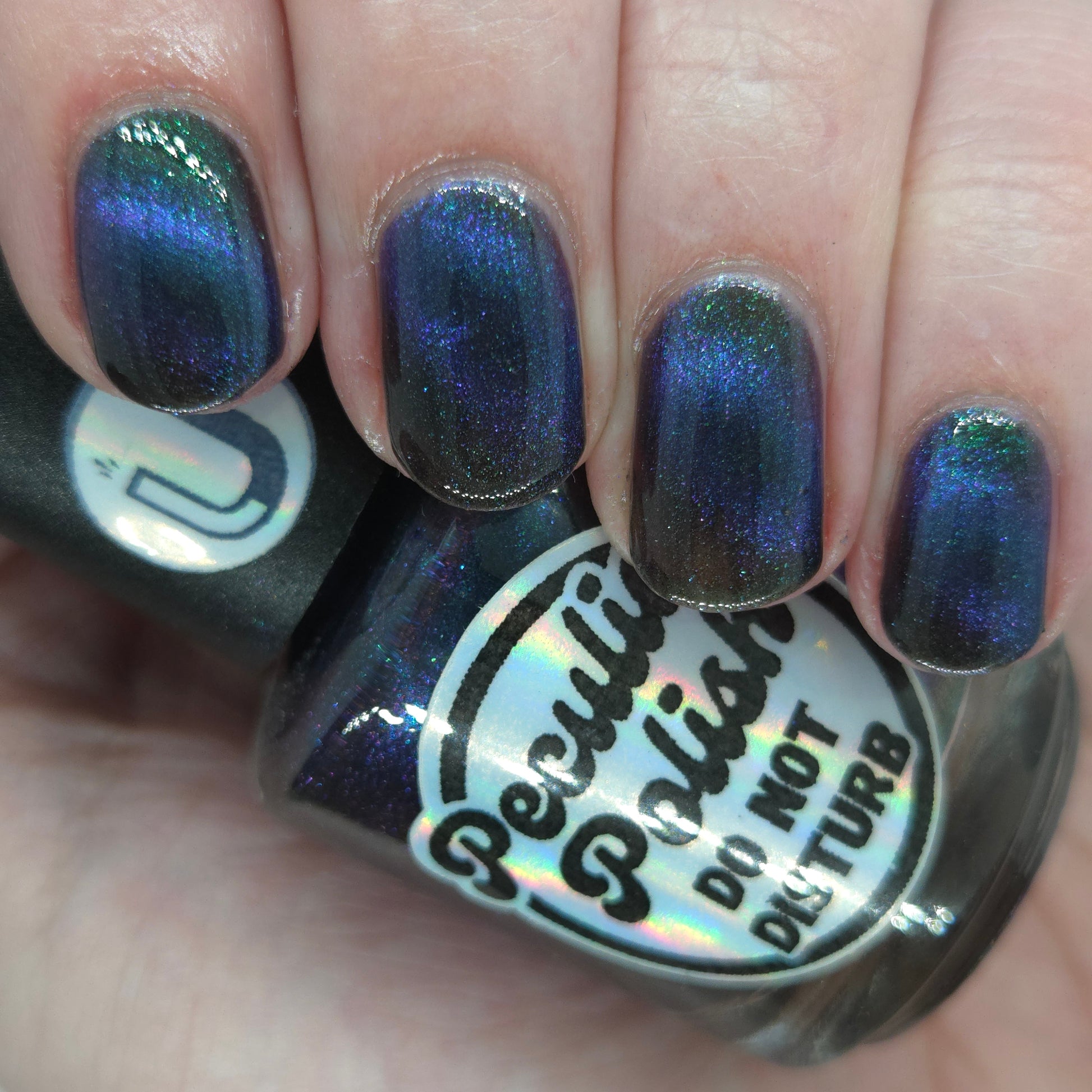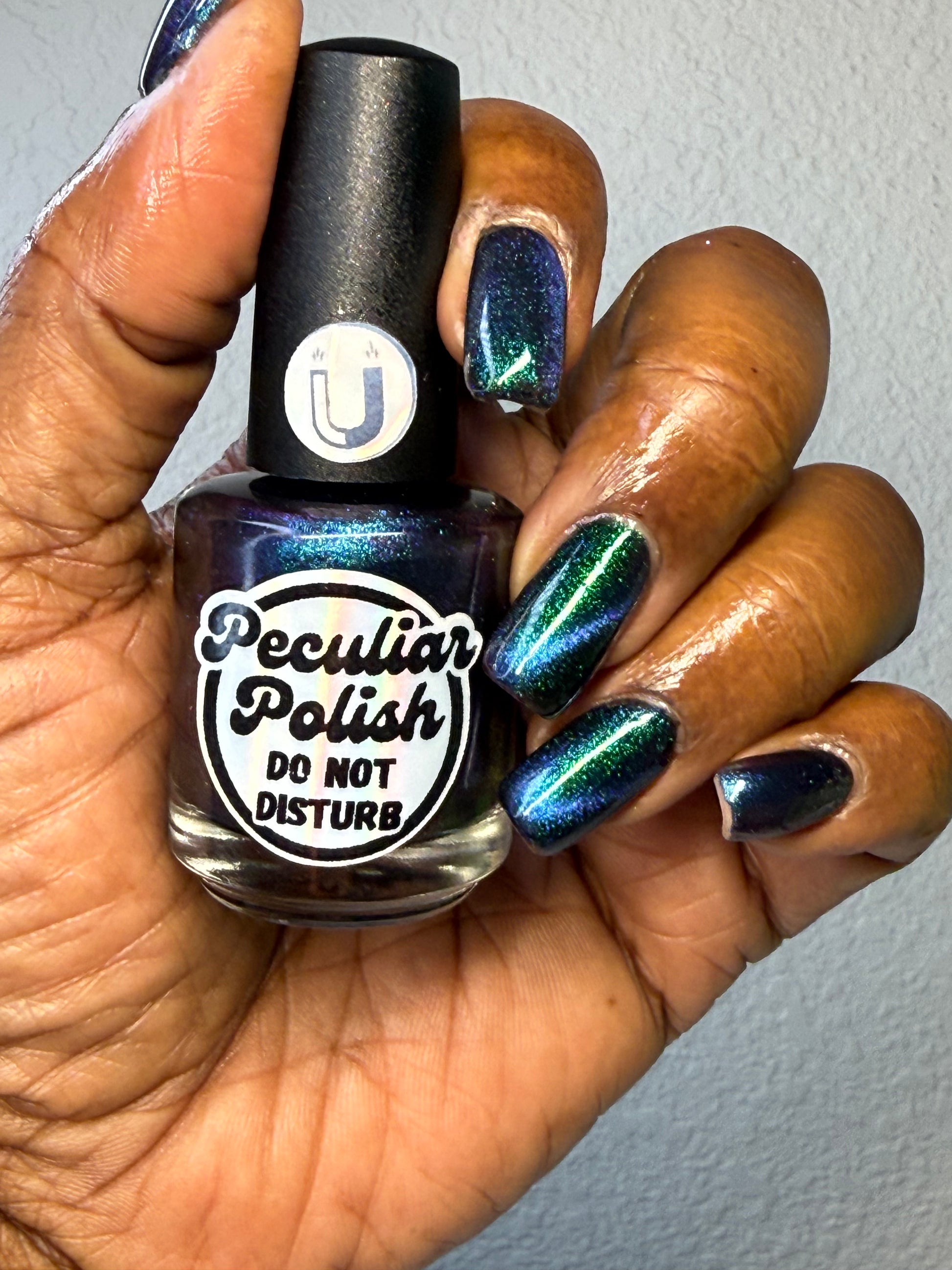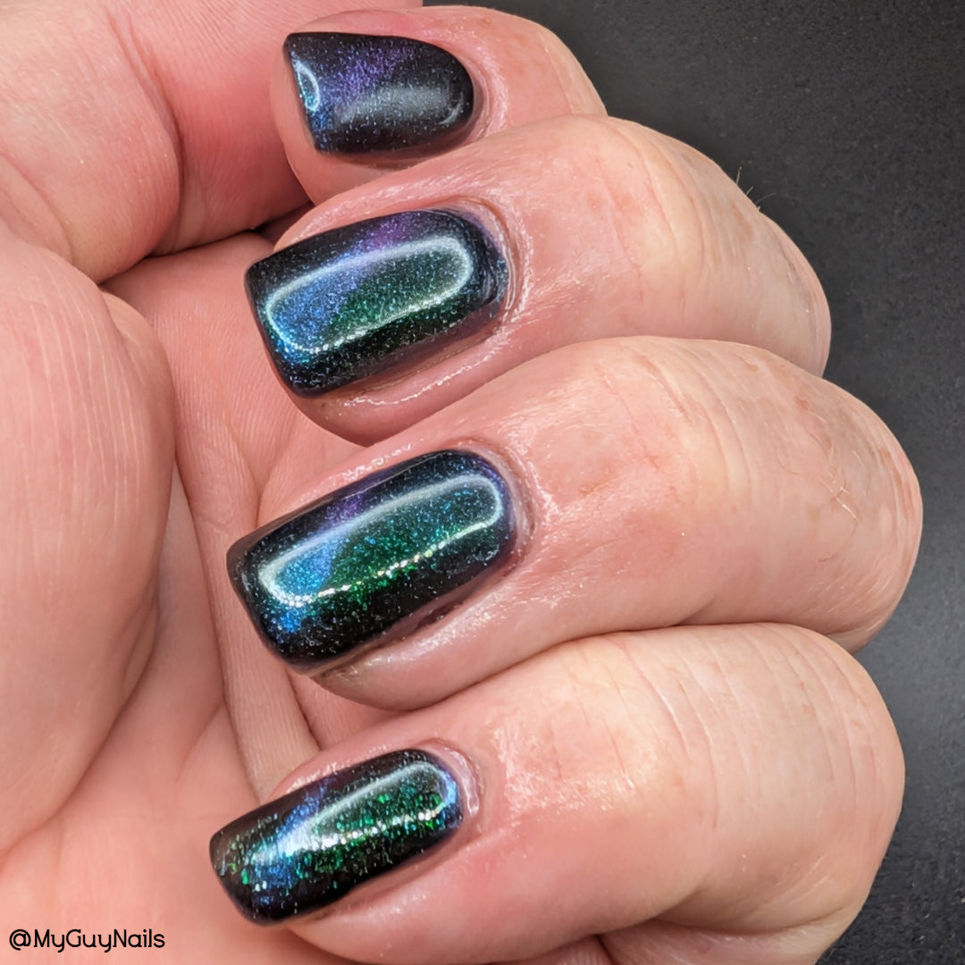 Do not disturb is a beautiful teal green shimmer floating in a black crelly base with an electrifying purple to blue magnetic.