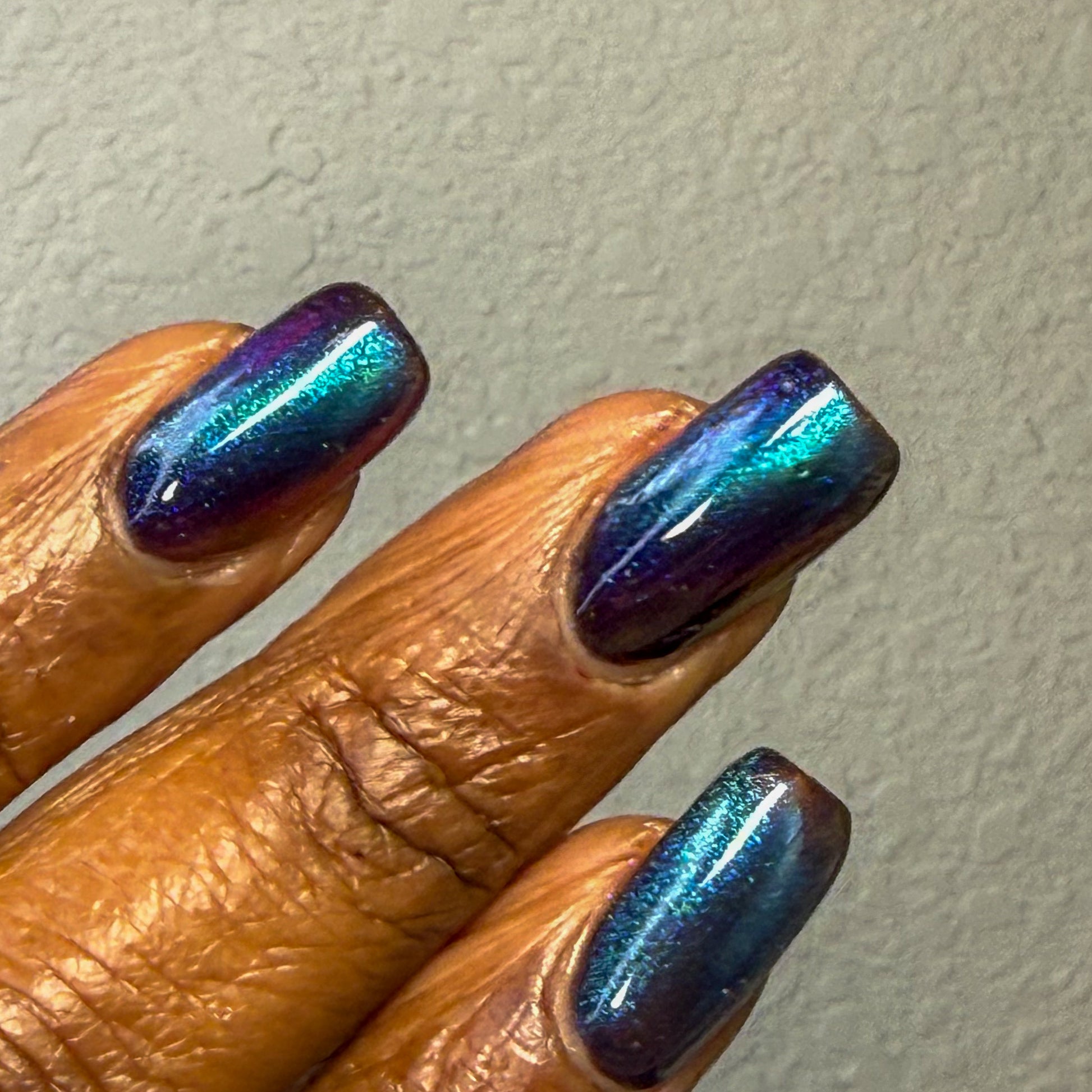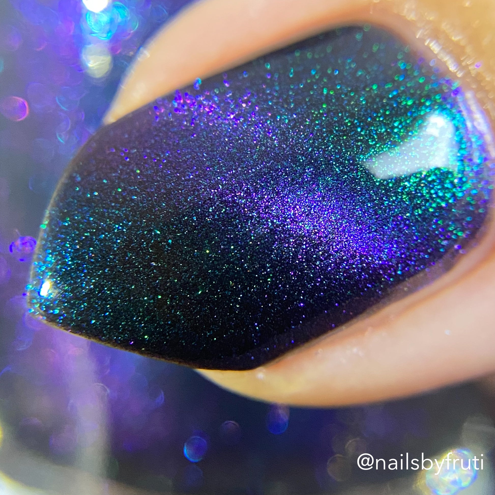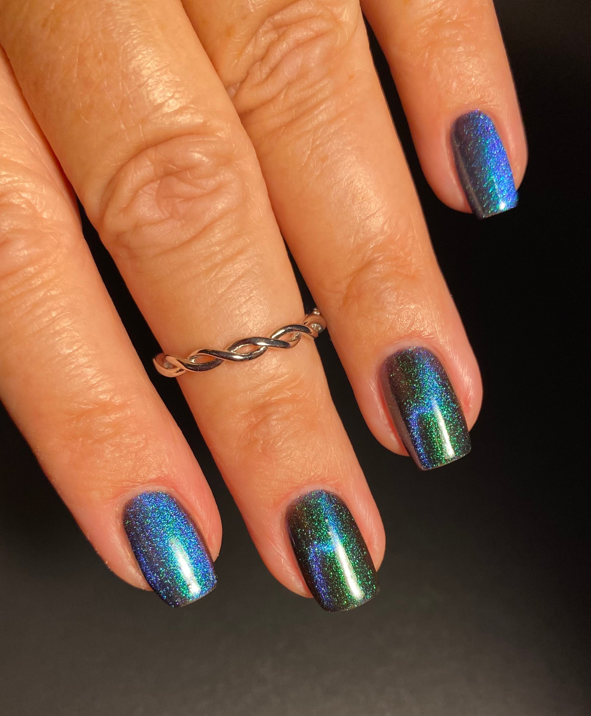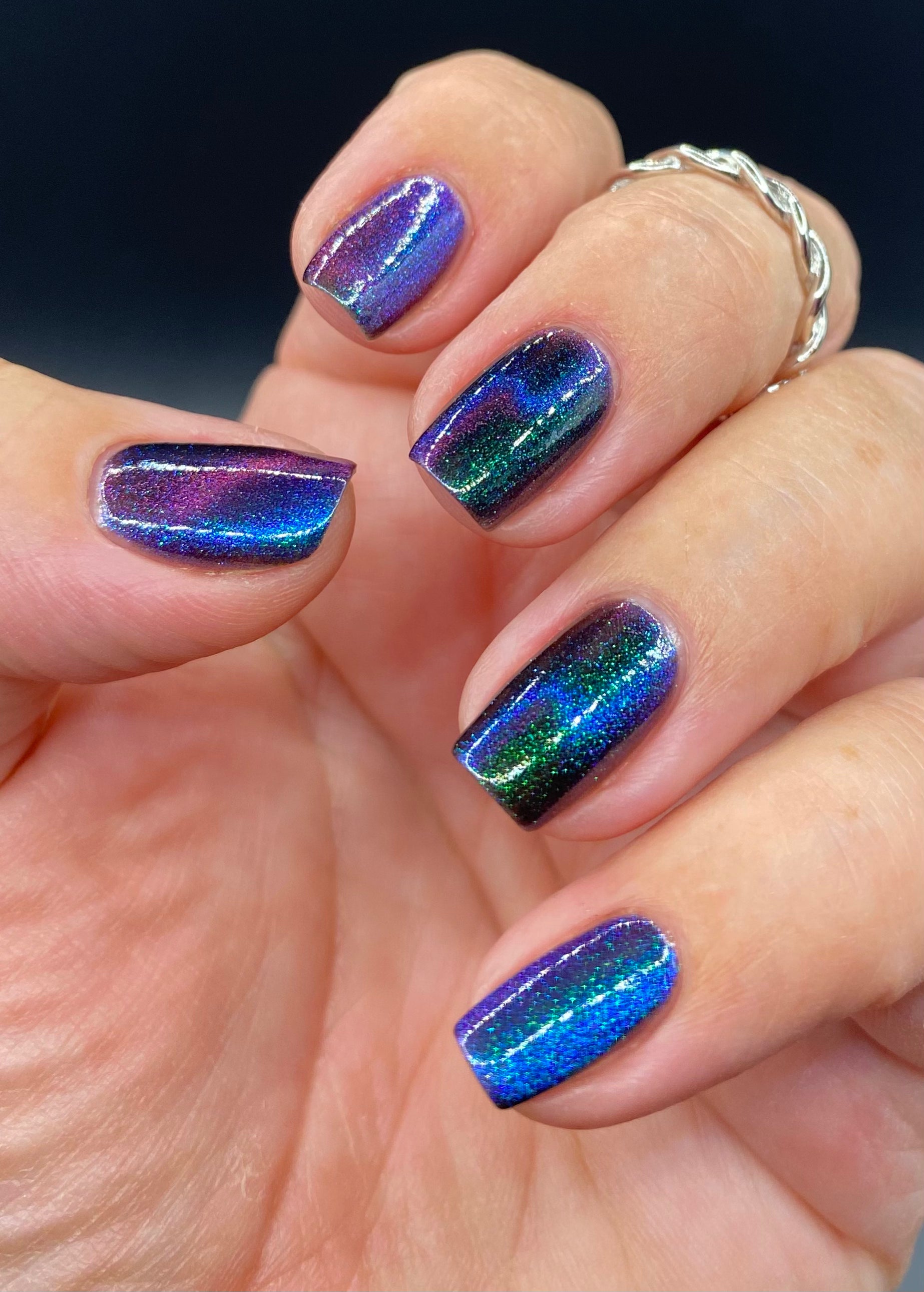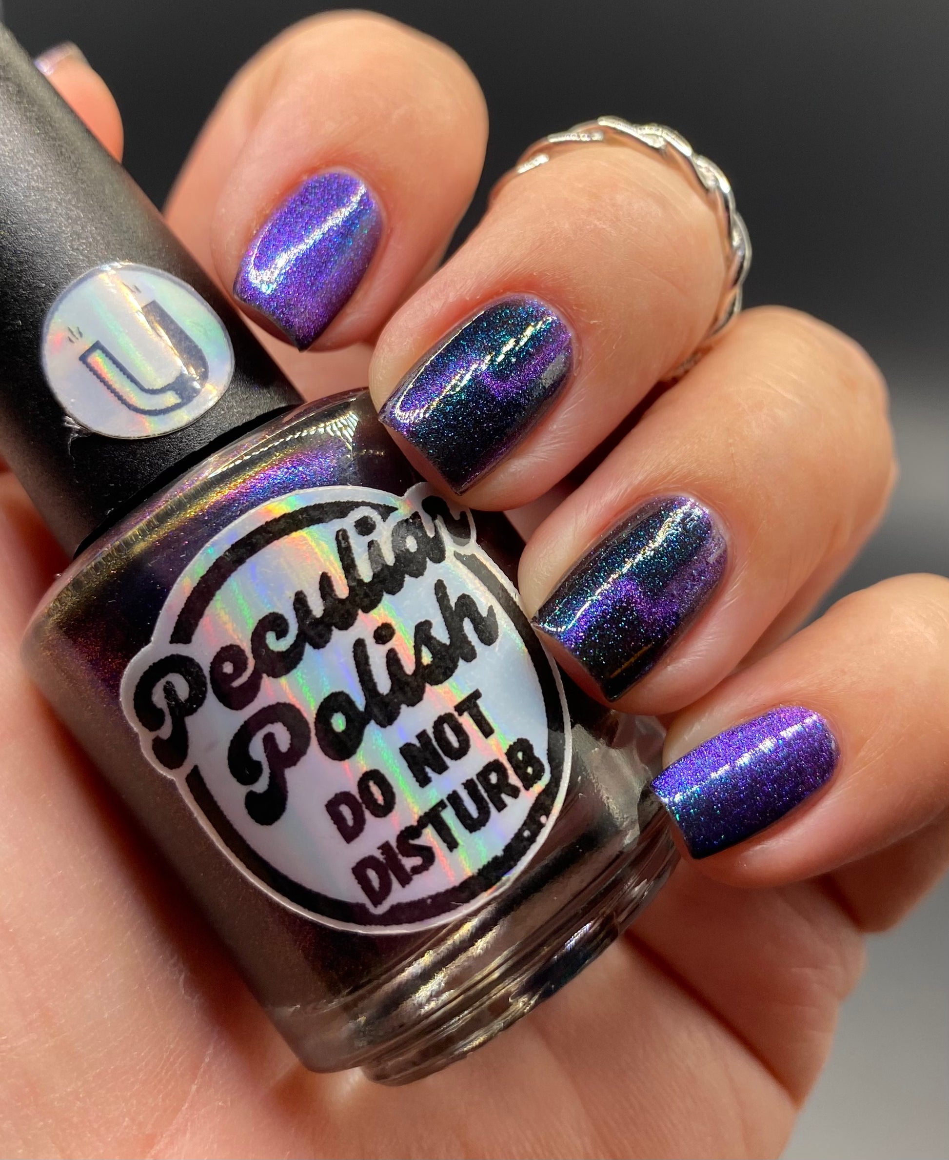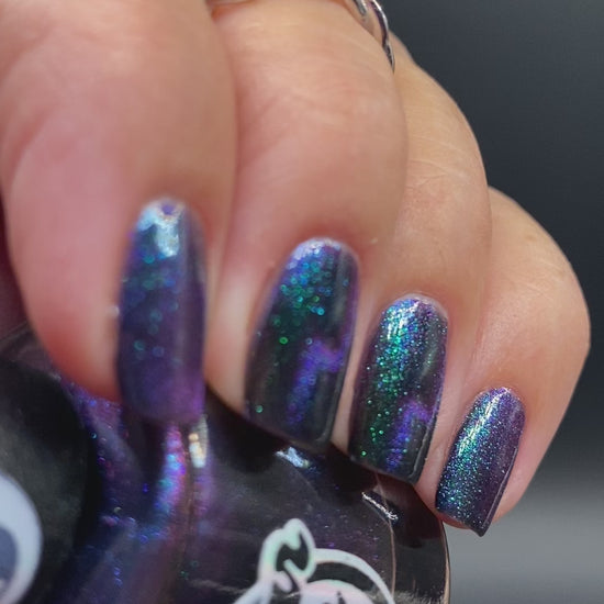 Do not disturb is a beautiful teal green shimmer floating in a black crelly base with an electrifying purple to blue magnetic.