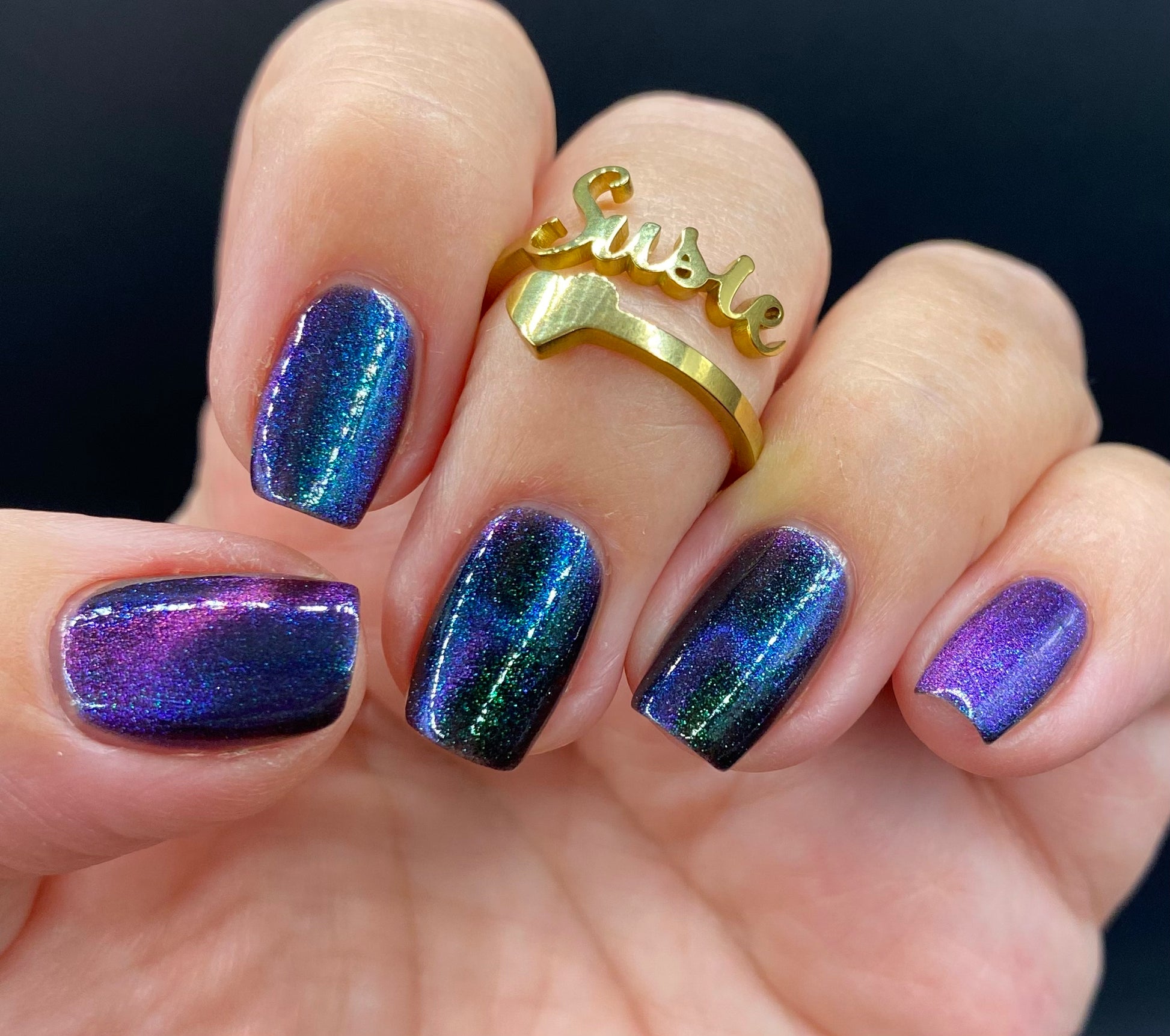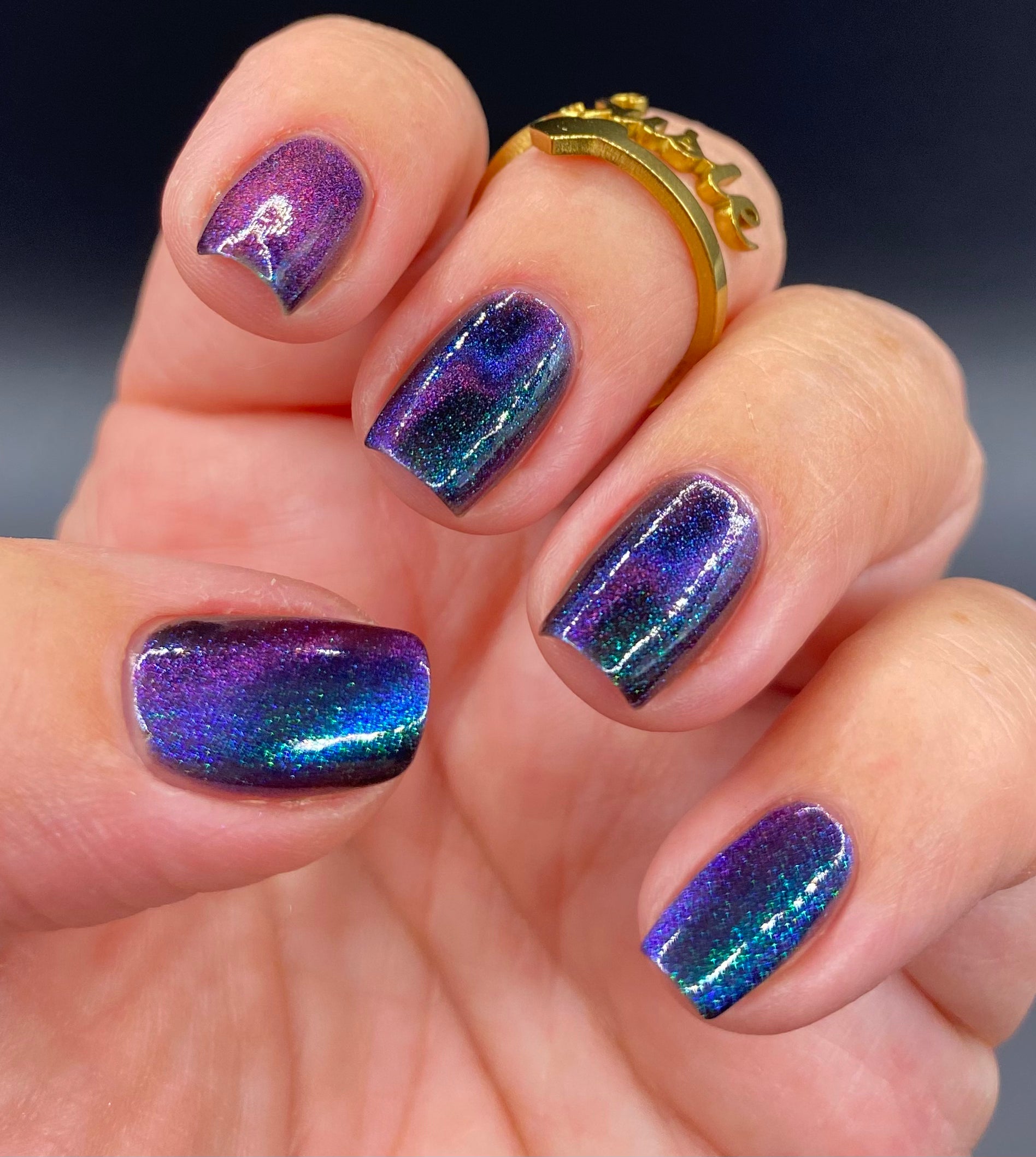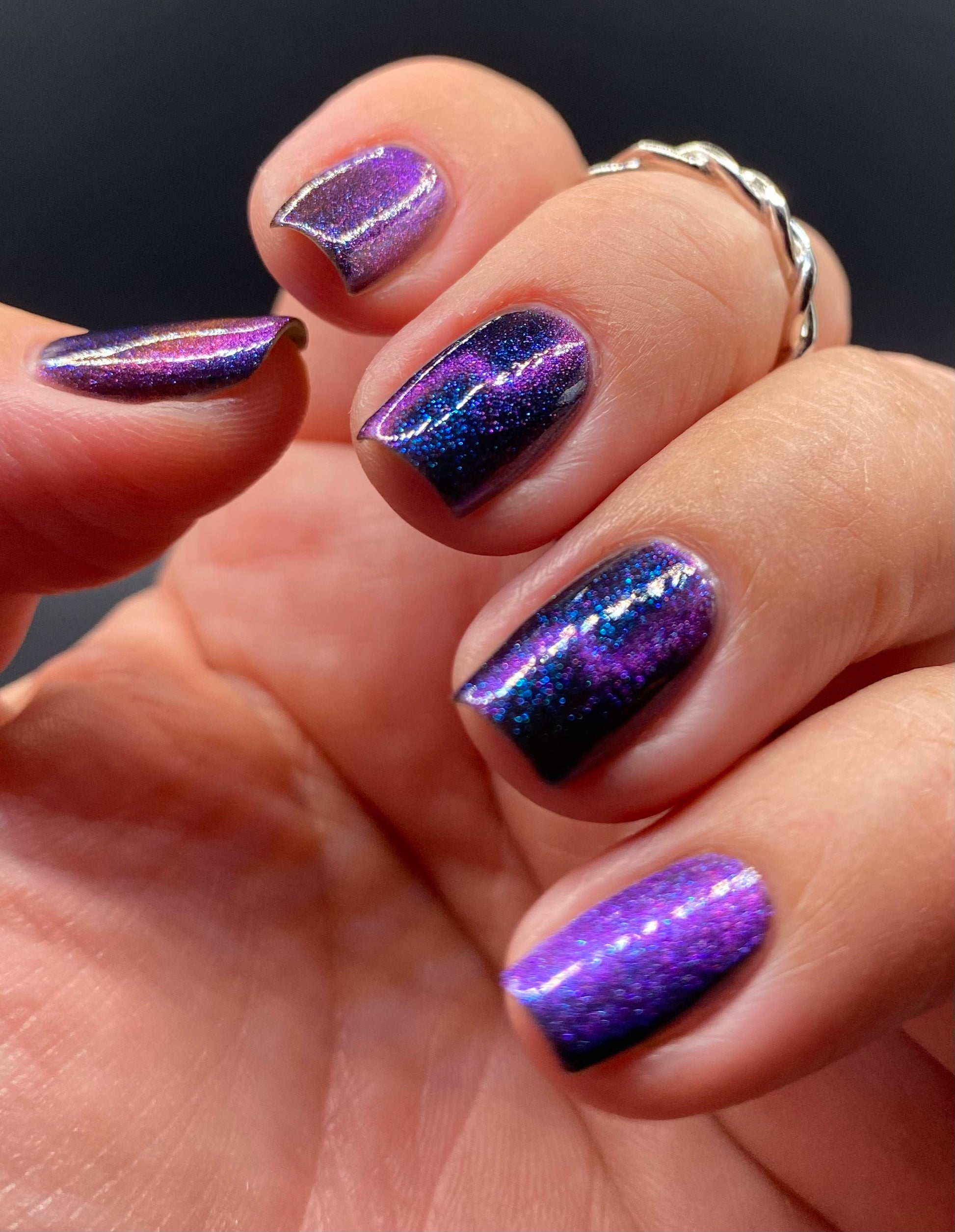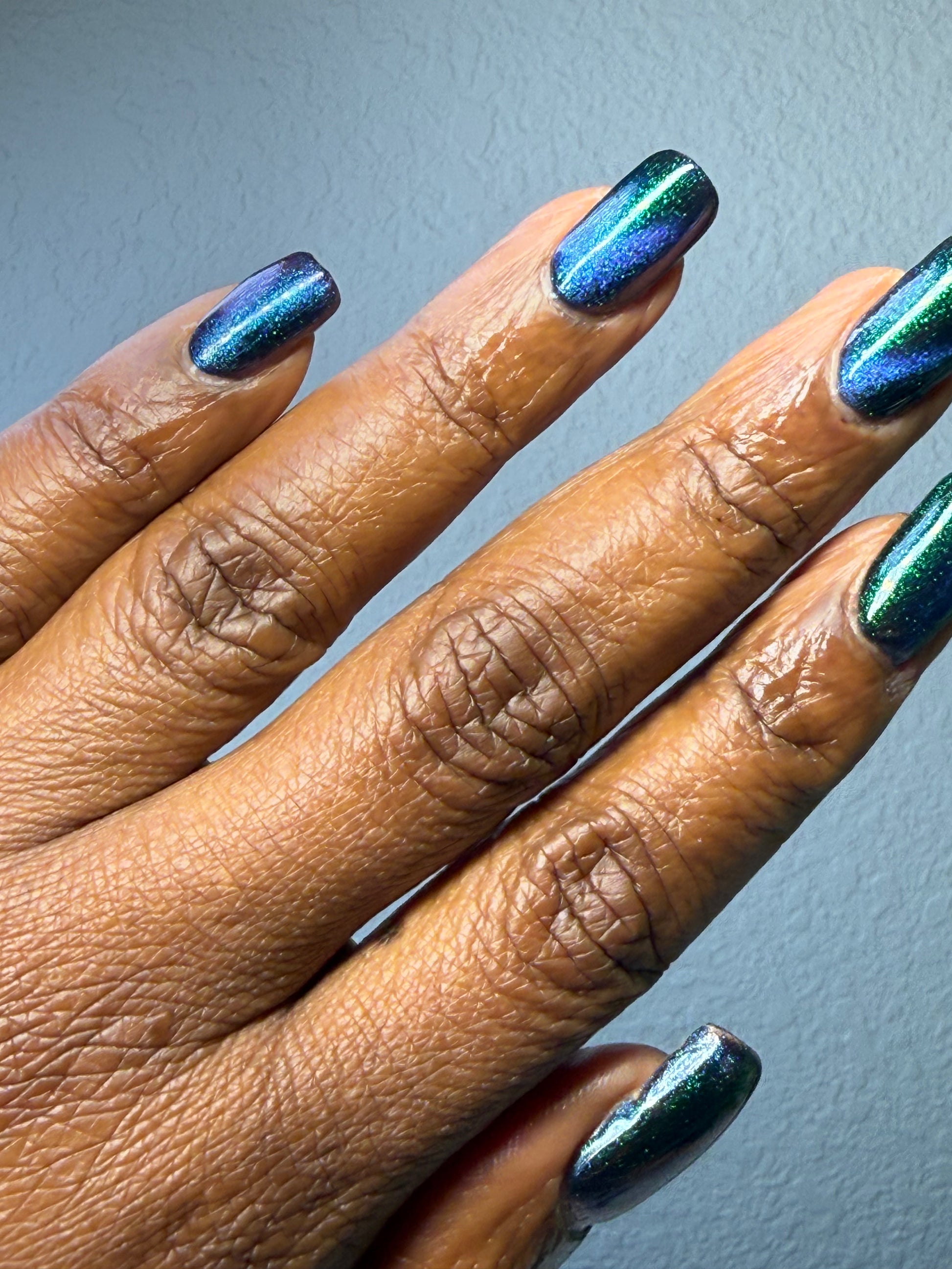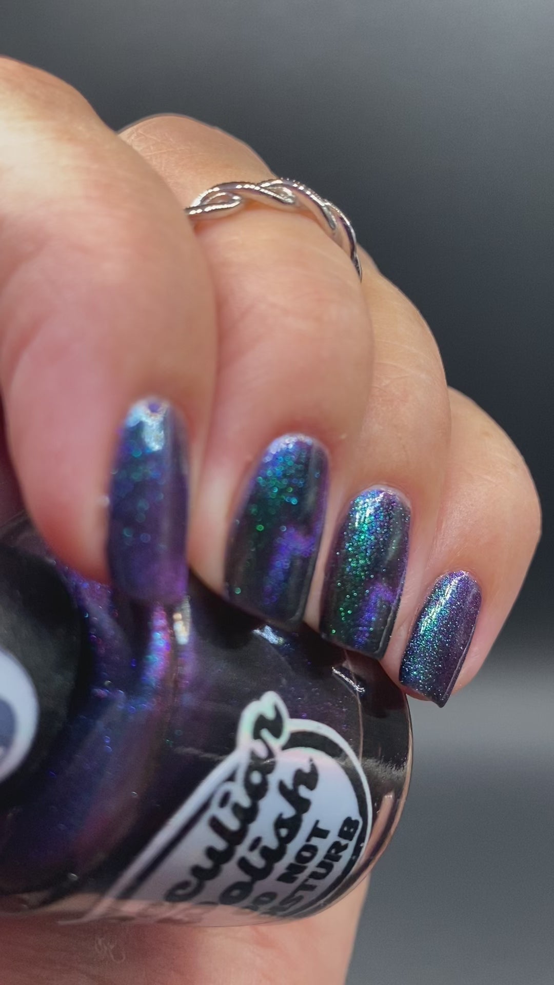 Do not disturb is a beautiful teal green shimmer floating in a black crelly base with an electrifying purple to blue magnetic.