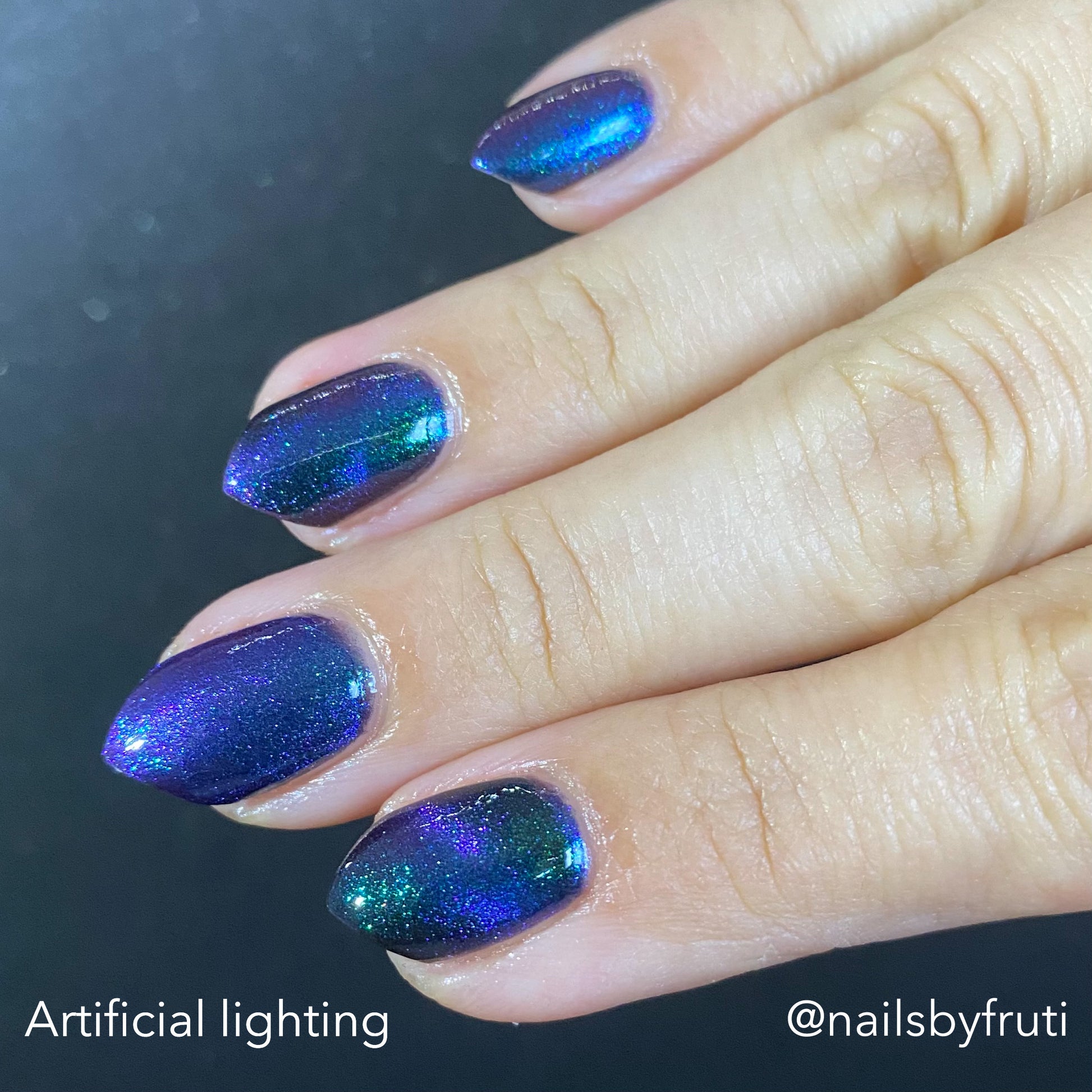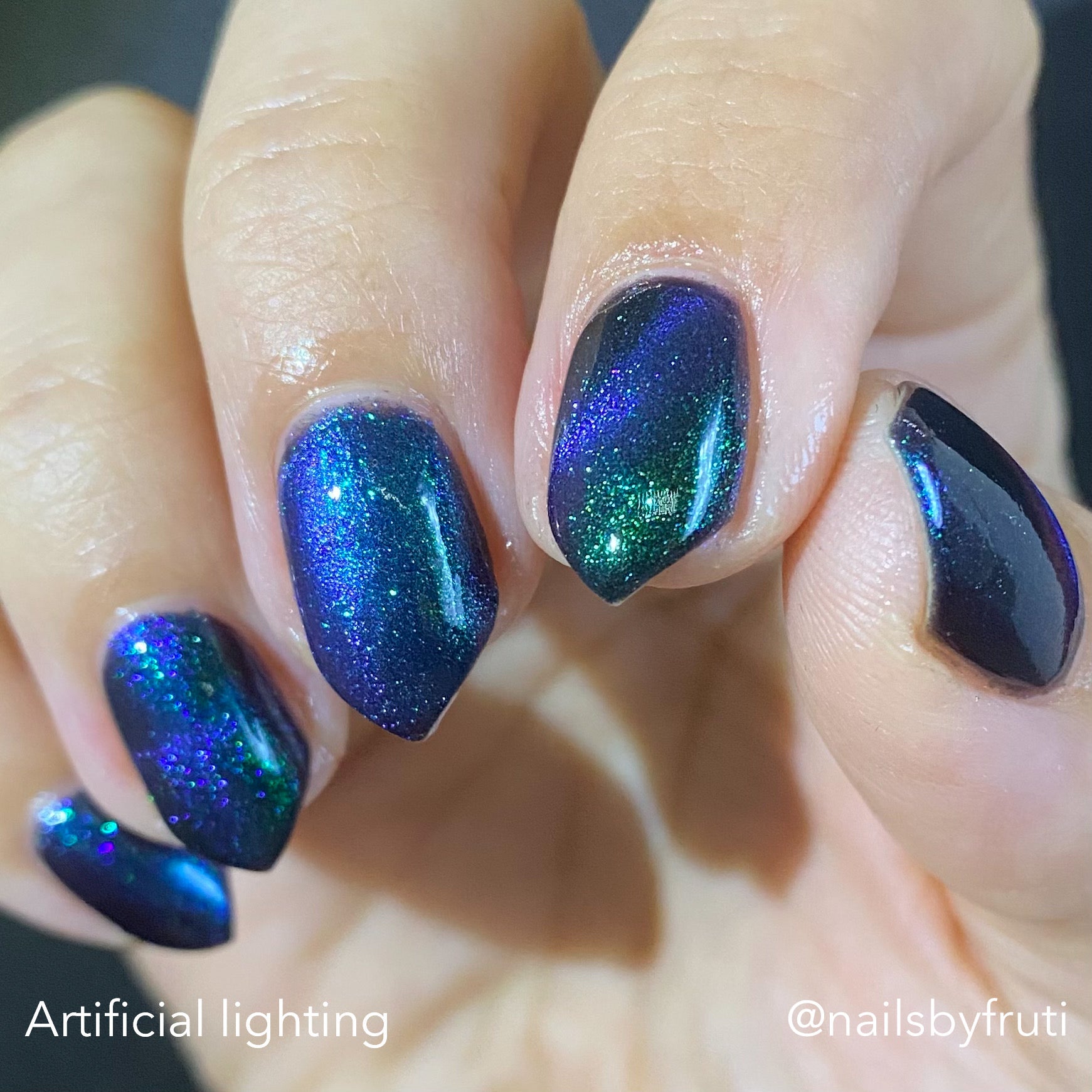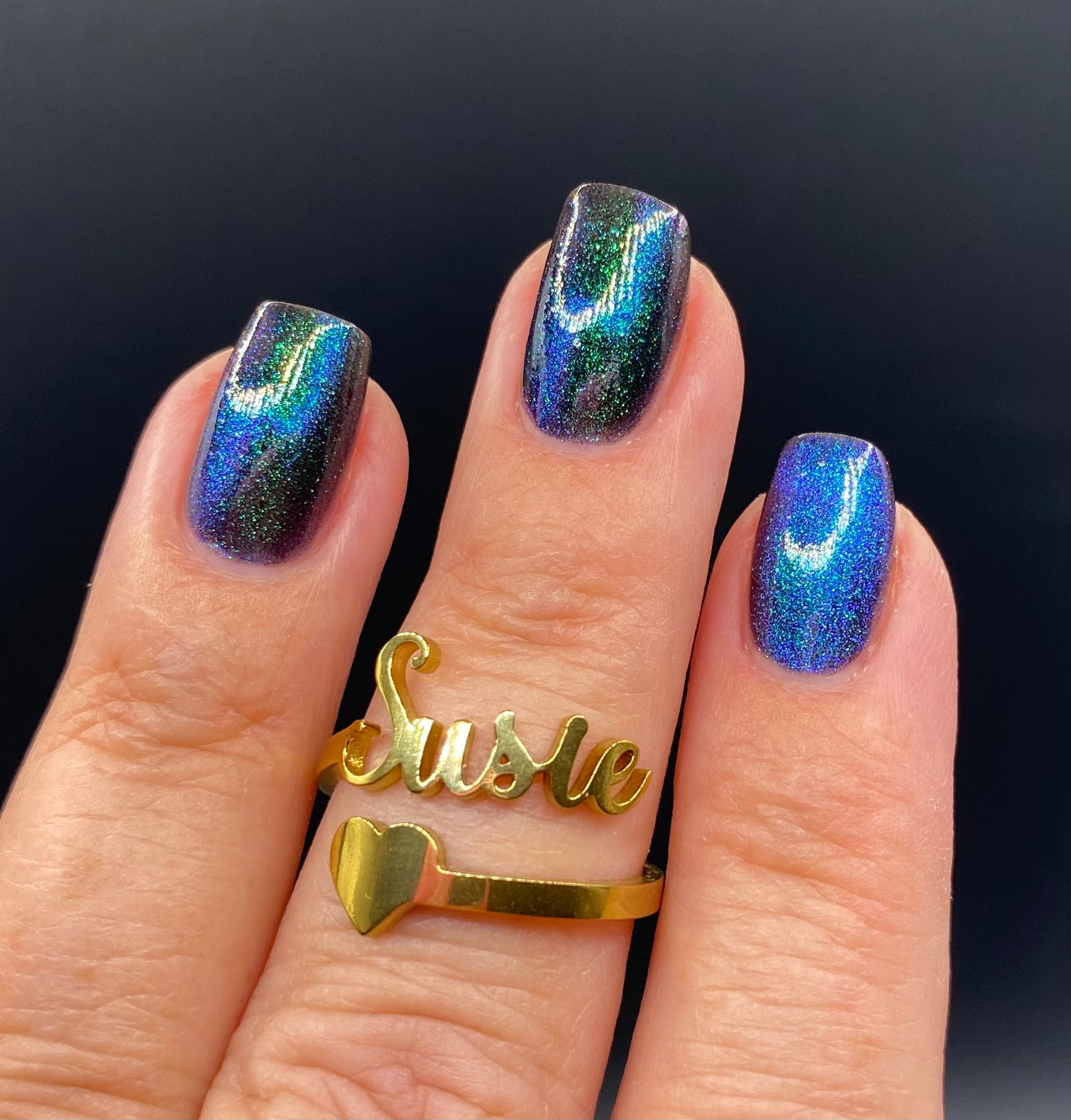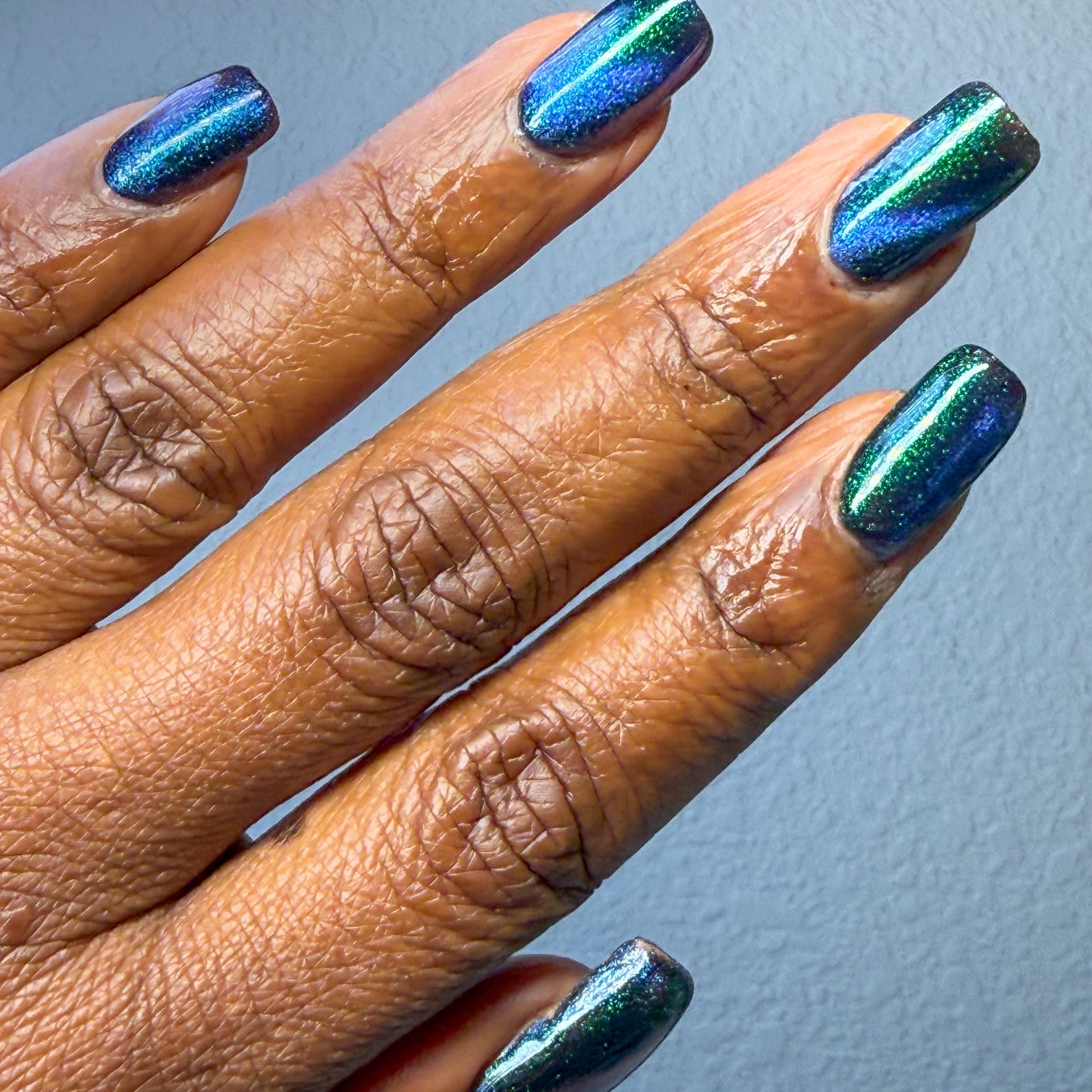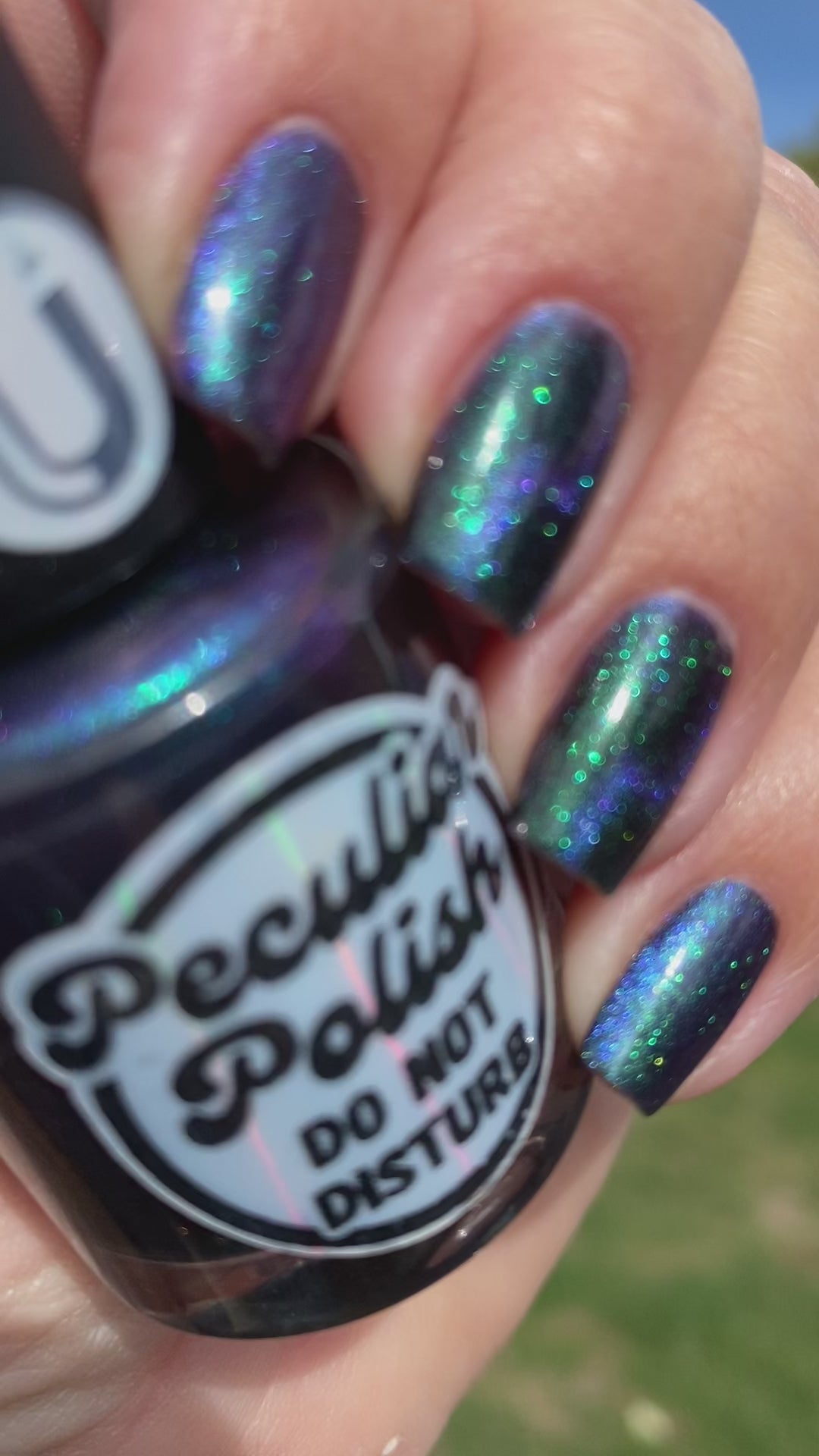Do not disturb is a beautiful teal green shimmer floating in a black crelly base with an electrifying purple to blue magnetic.