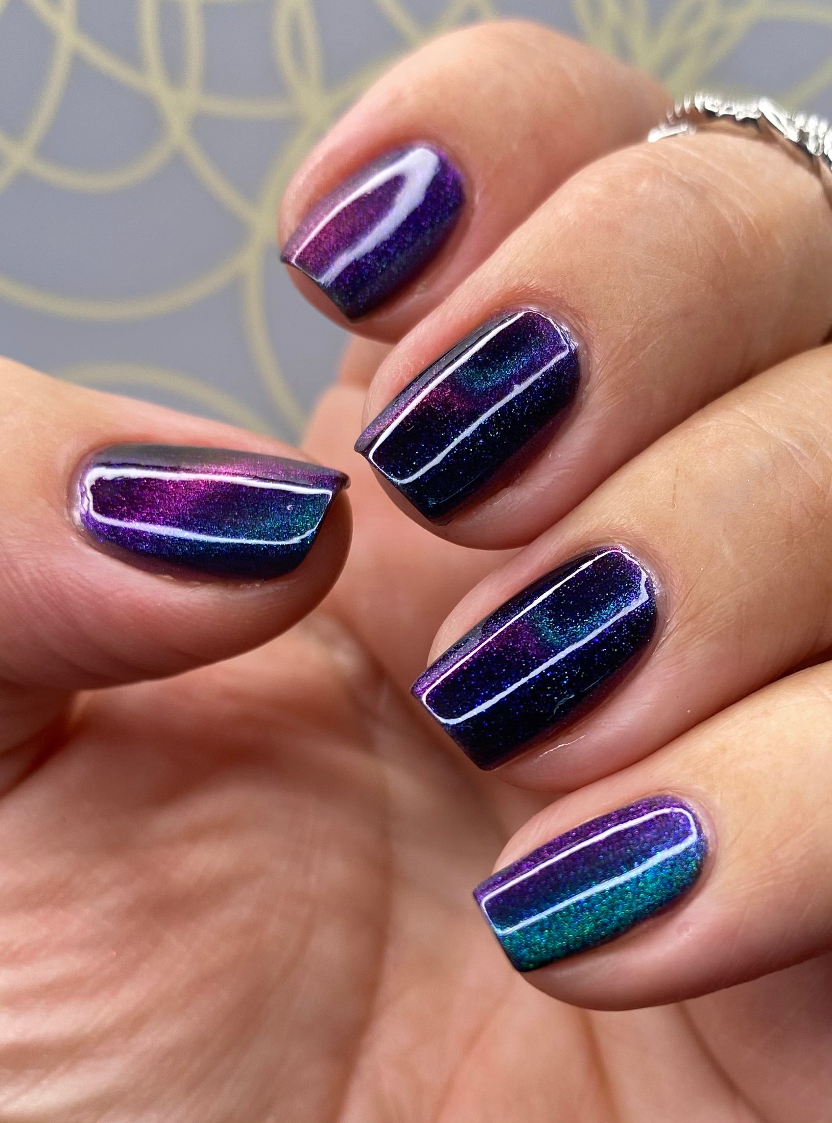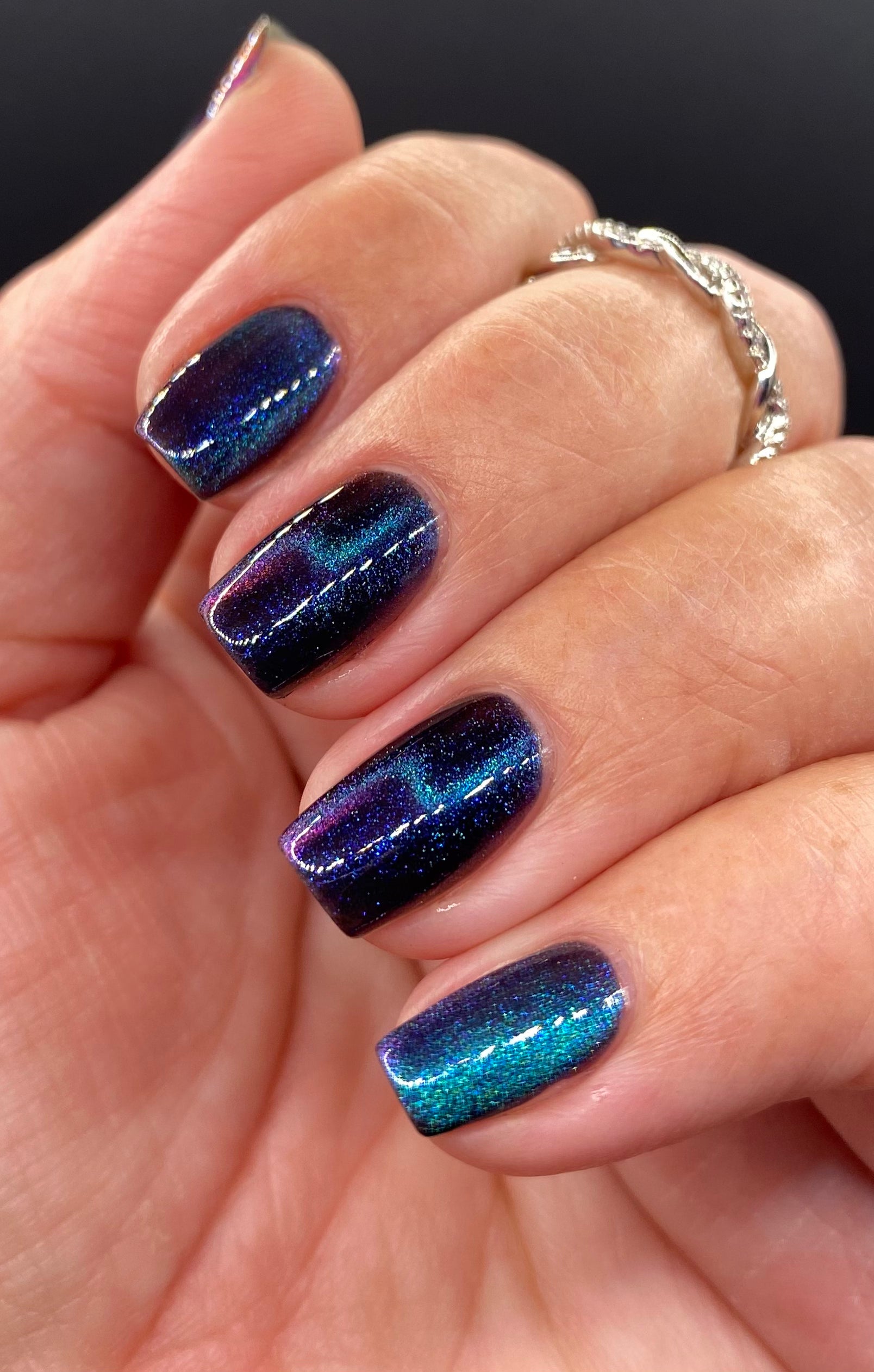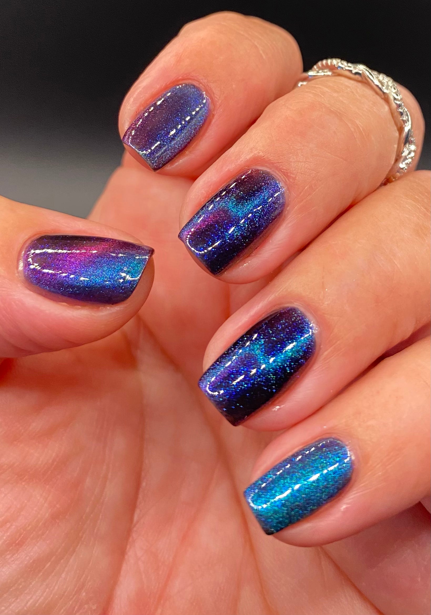 This entire collection is designed with a quick dry formula. Thin coats will dry quickly so have your magnet situated before you begin and work one finger at a time.