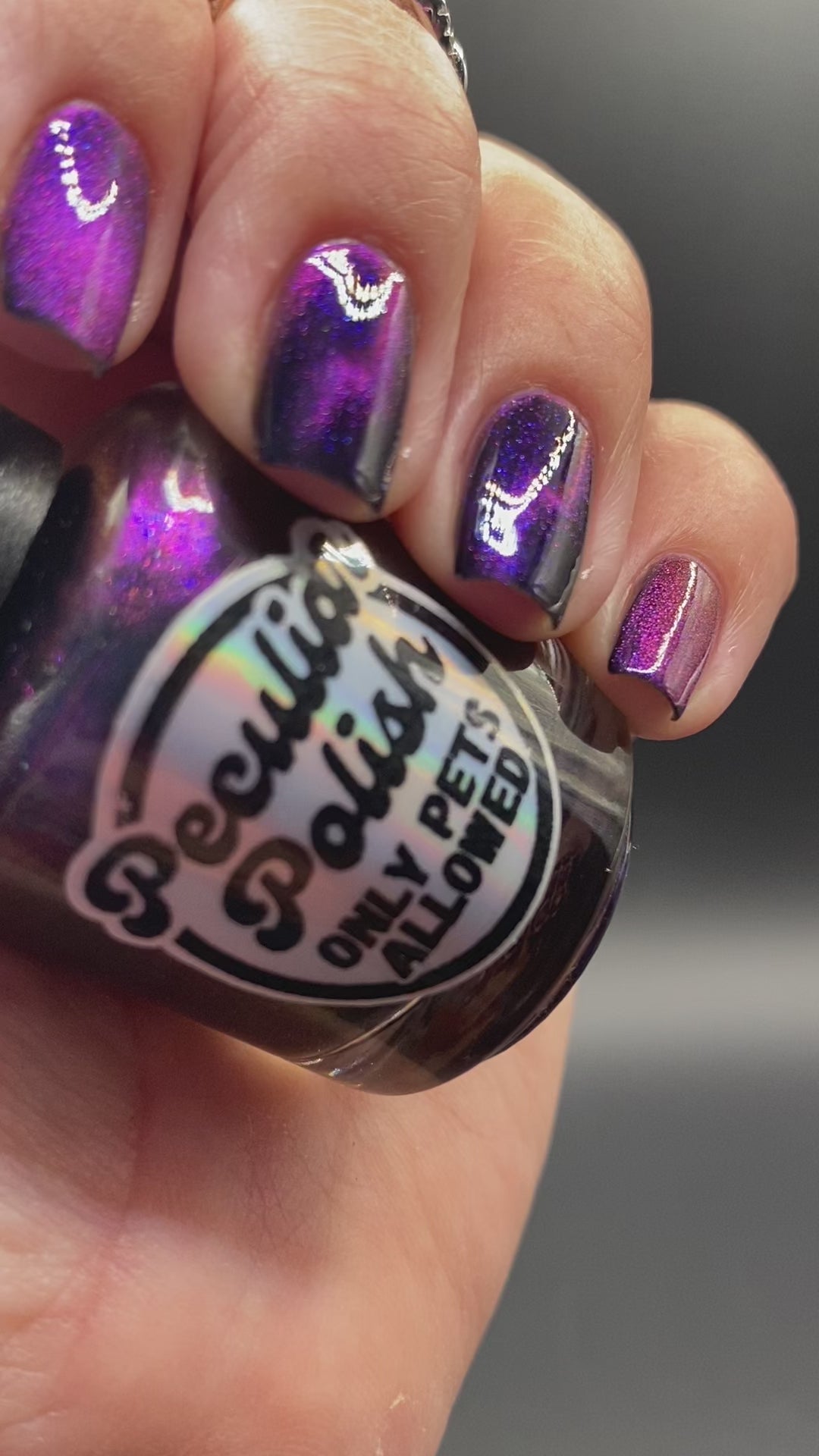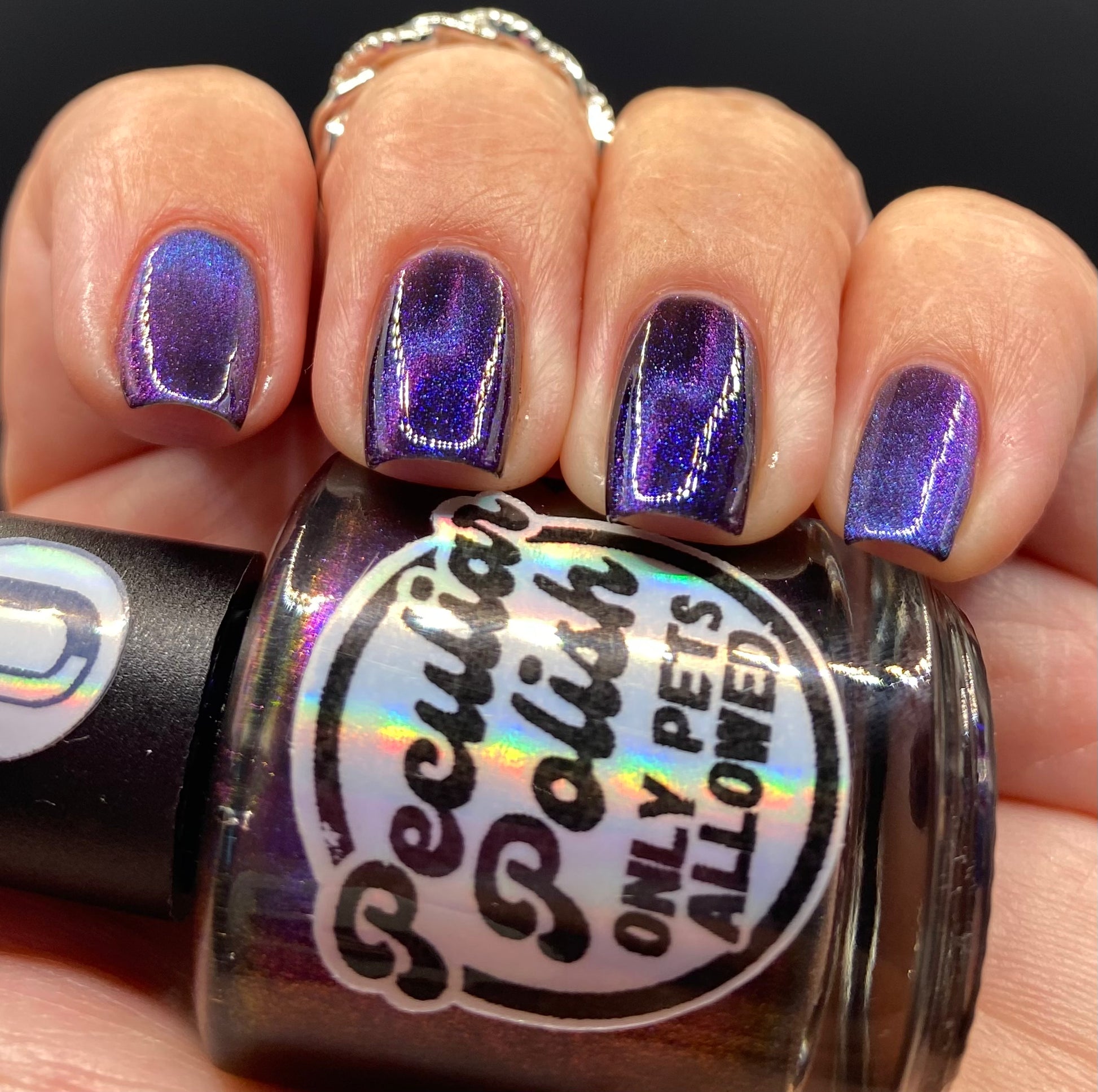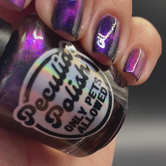 Only pets allowed is a purple to pink shimmer swimming in a black crelly base with a Purple to teal blue magnetic.