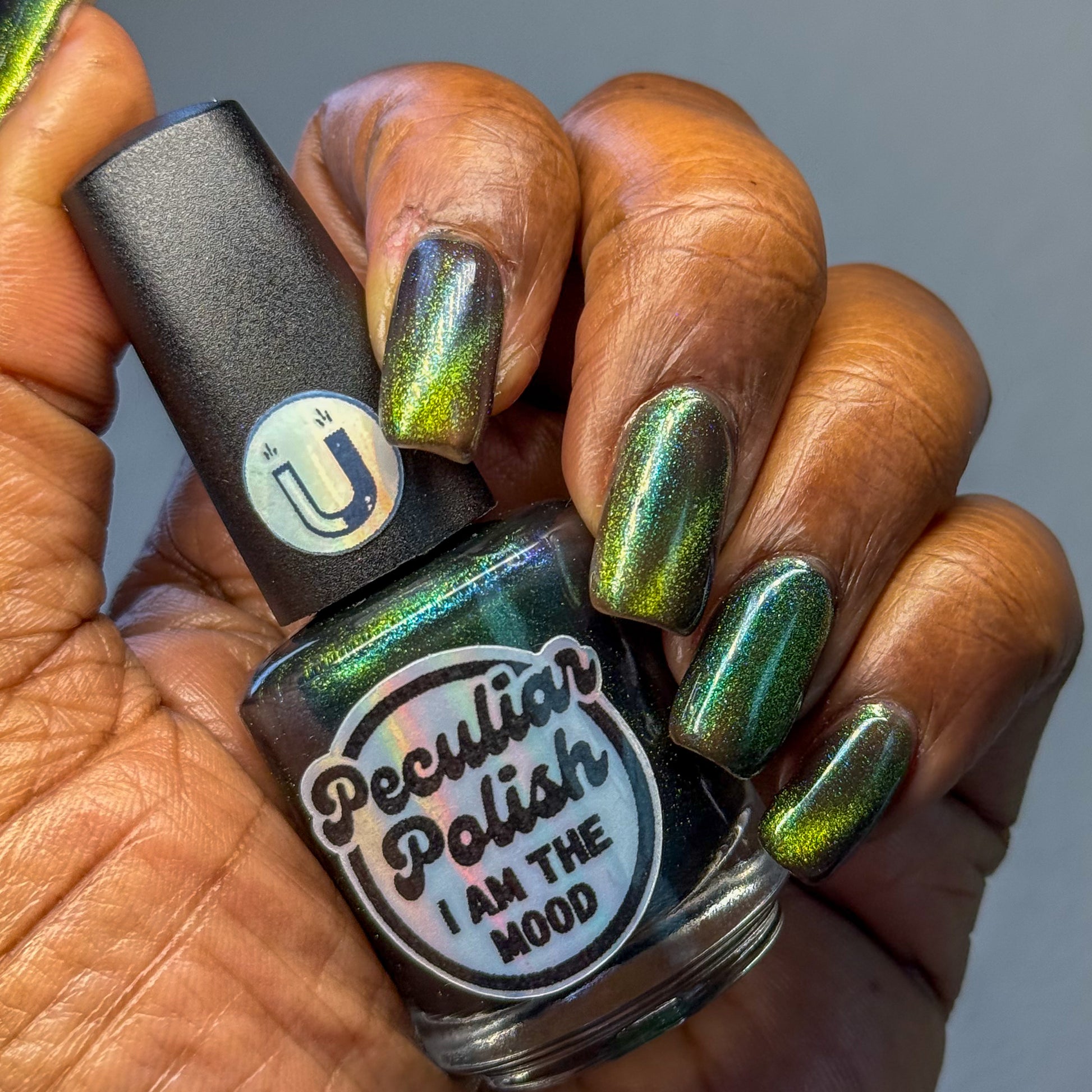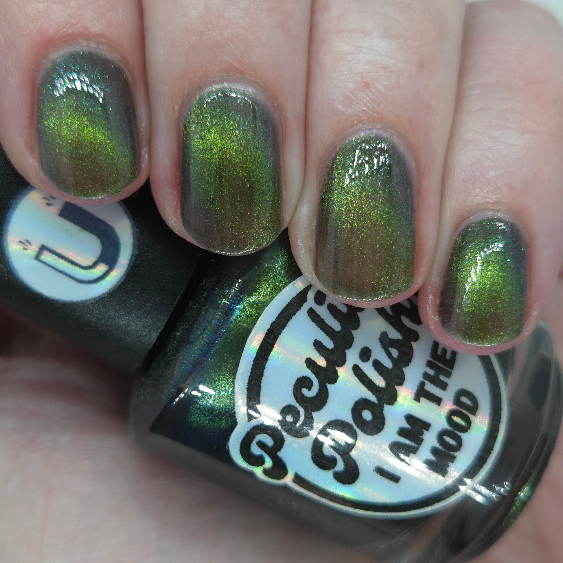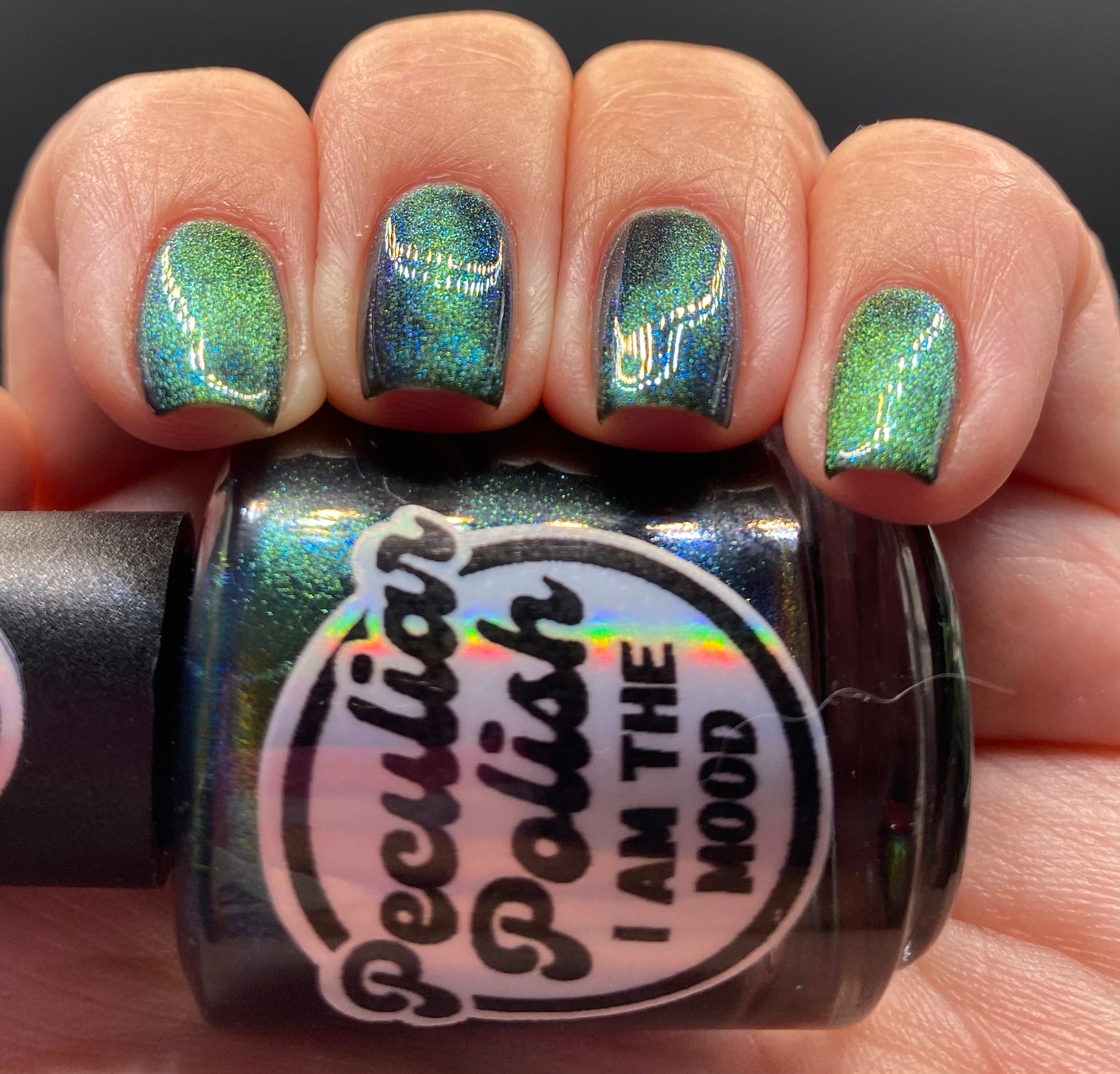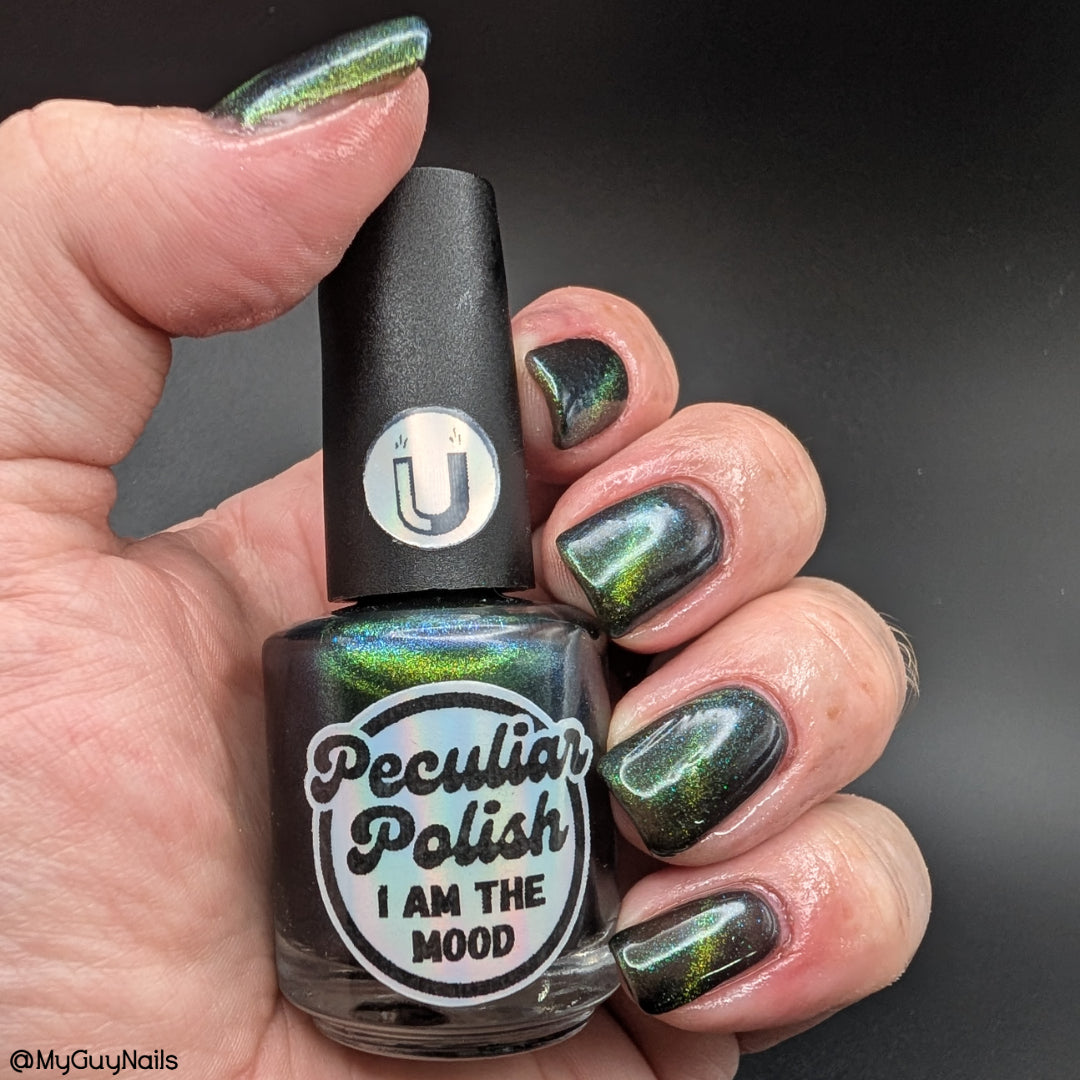 I am the mood is a dark green to blue teal shimmer swimming in a black JELLY base with a bright green magnetic. This is the only one of the collection that is a moody Jelly base. If jelly polishes aren't your thing do not worry a black base coat will fix that and you can still wear this beautiful polish without nail line.