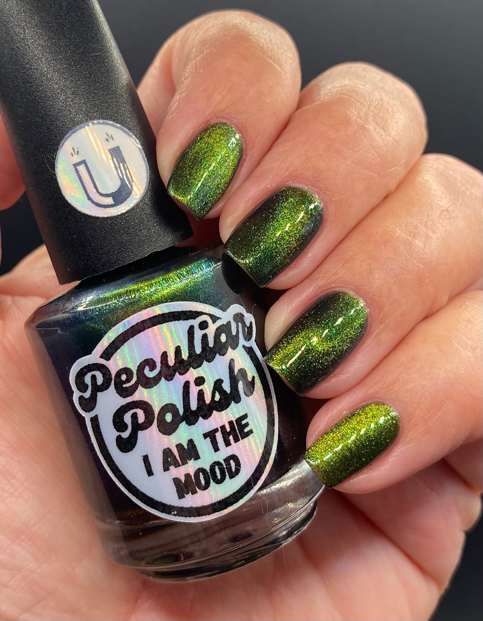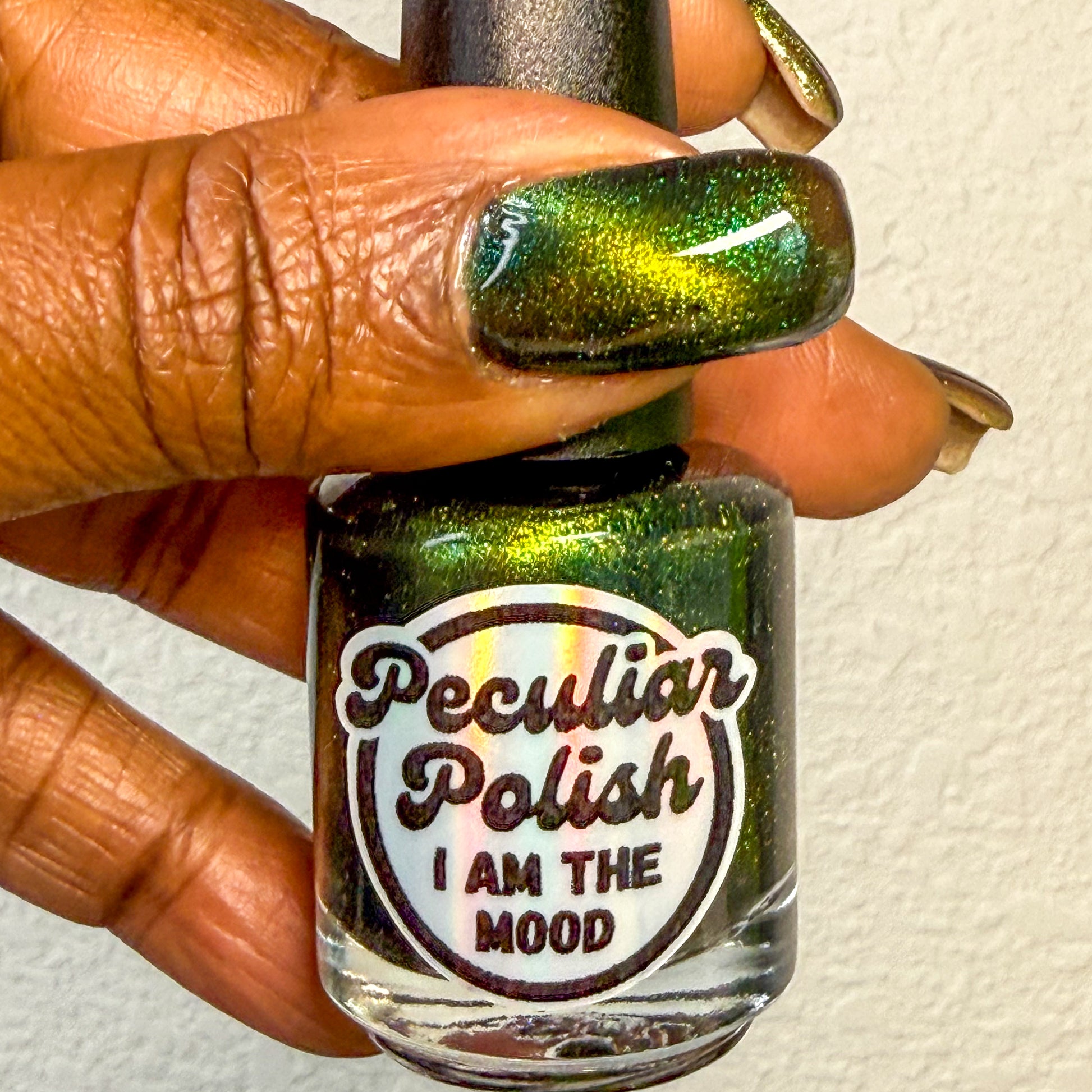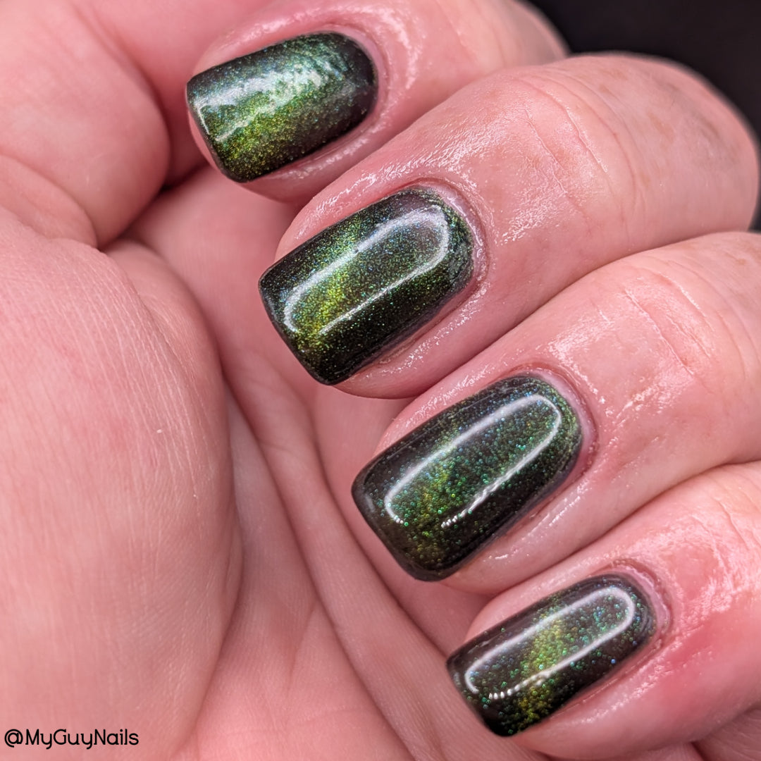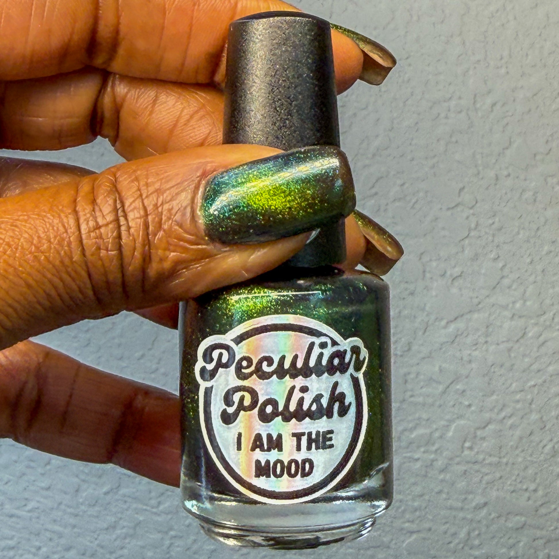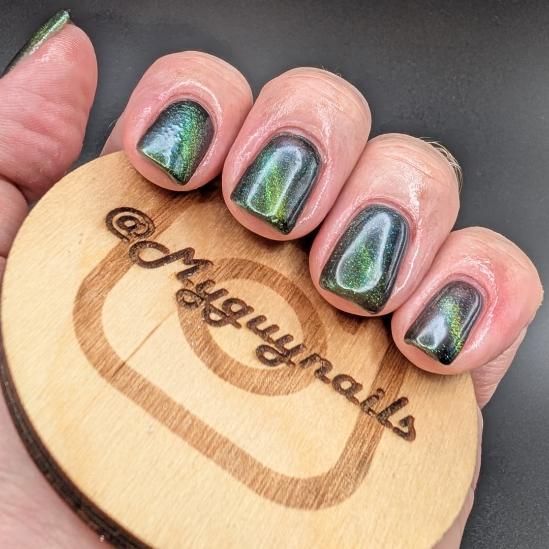 I am the mood is a dark green to blue teal shimmer swimming in a black JELLY base with a bright green magnetic. This is the only one of the collection that is a moody Jelly base. If jelly polishes aren't your thing do not worry a black base coat will fix that and you can still wear this beautiful polish without nail line.