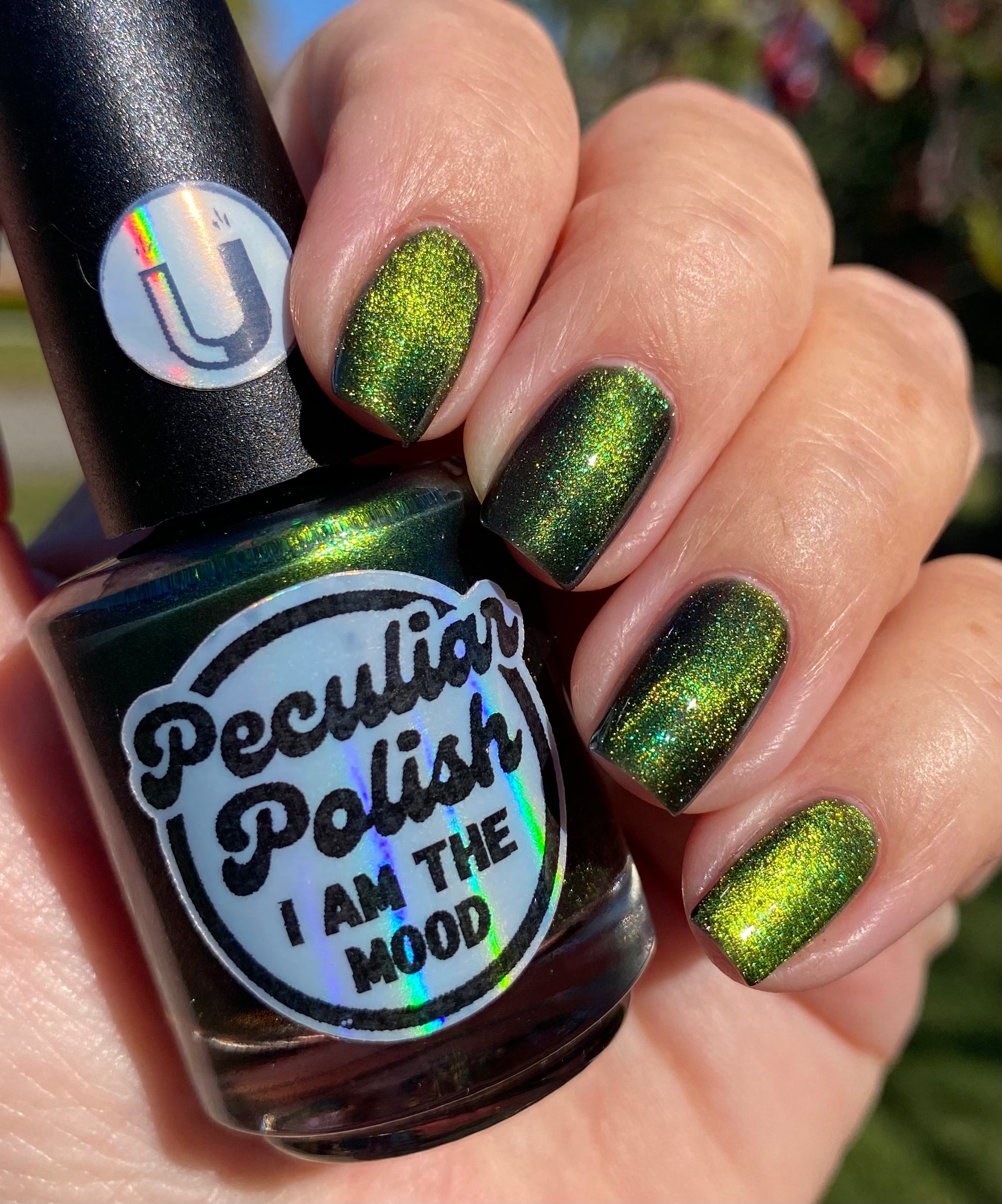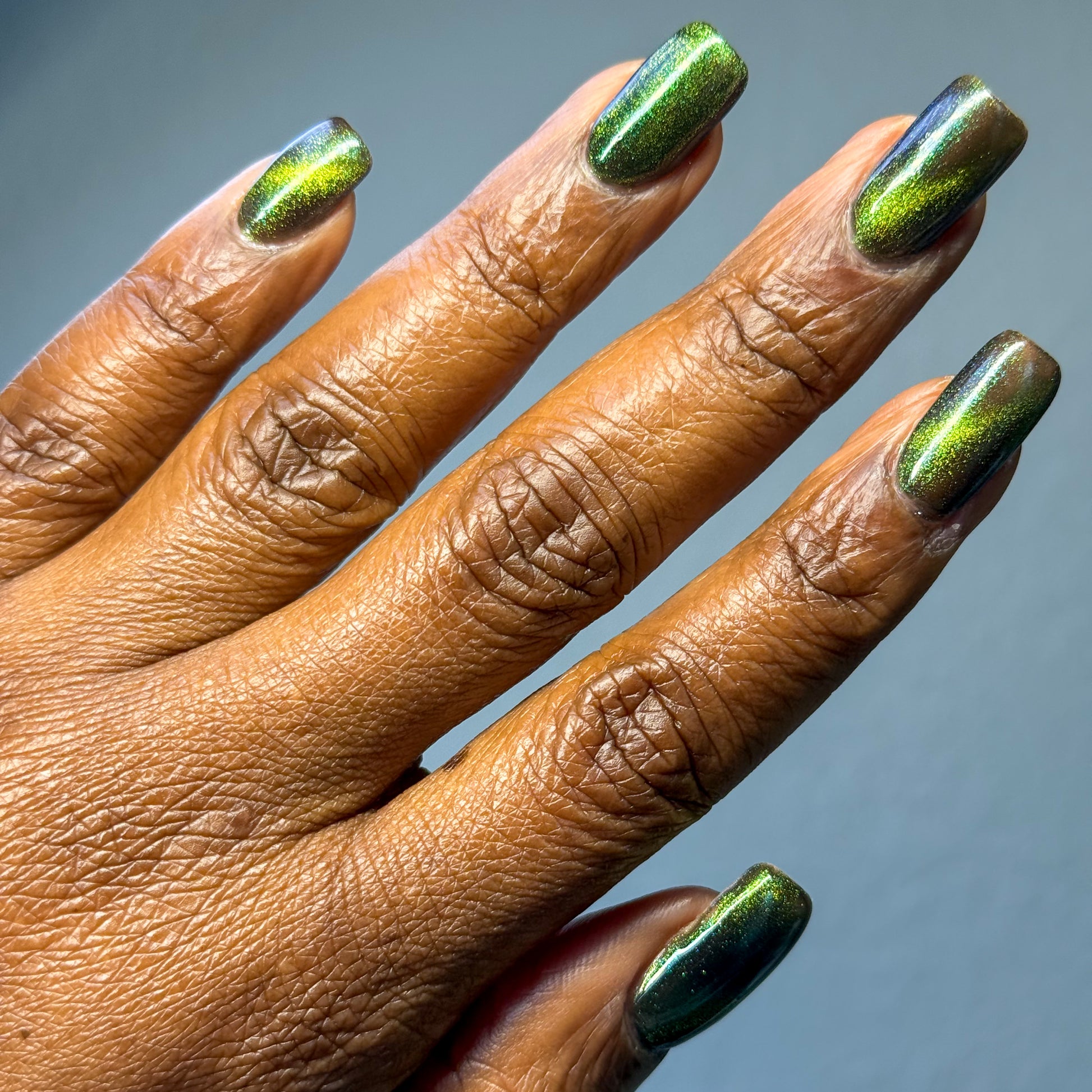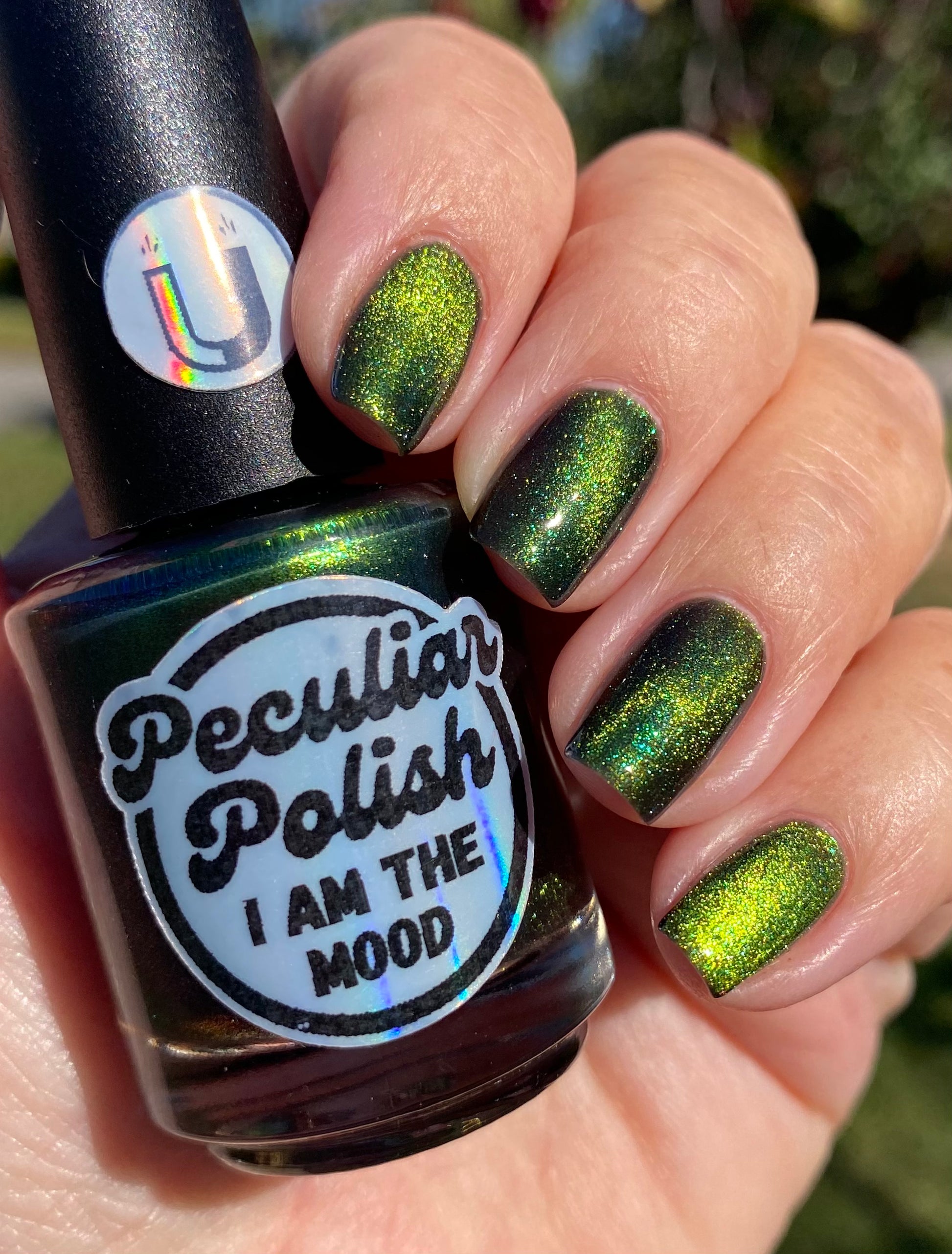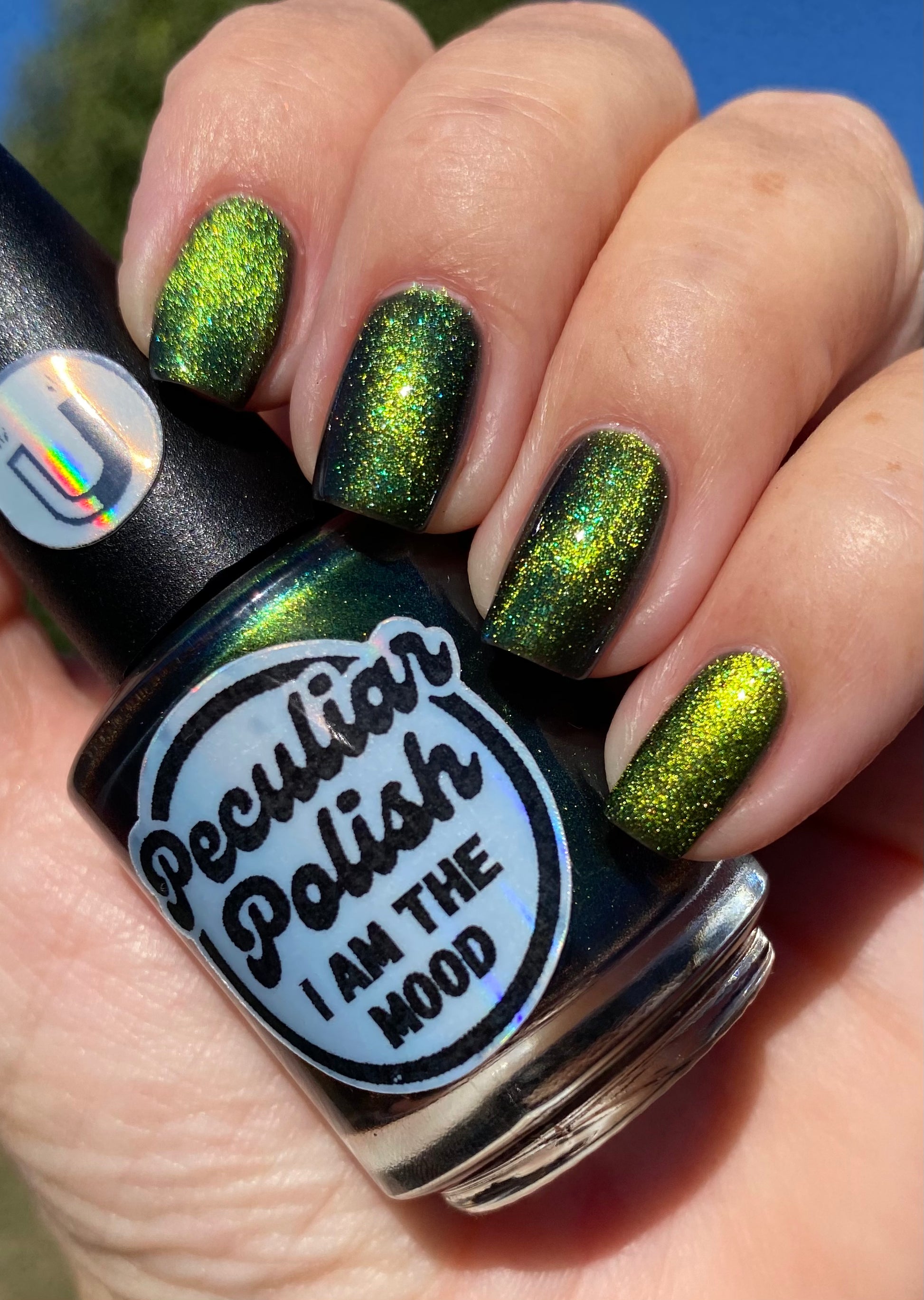I am the mood is a dark green to blue teal shimmer swimming in a black JELLY base with a bright green magnetic. This is the only one of the collection that is a moody Jelly base. If jelly polishes aren't your thing do not worry a black base coat will fix that and you can still wear this beautiful polish without nail line.