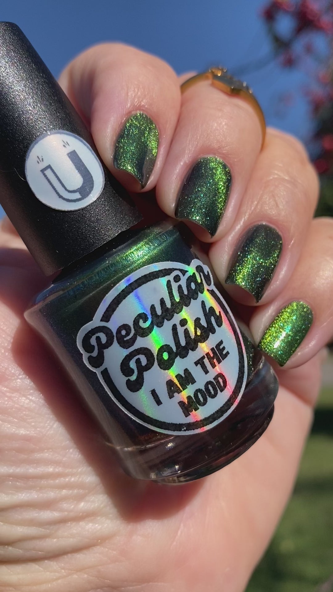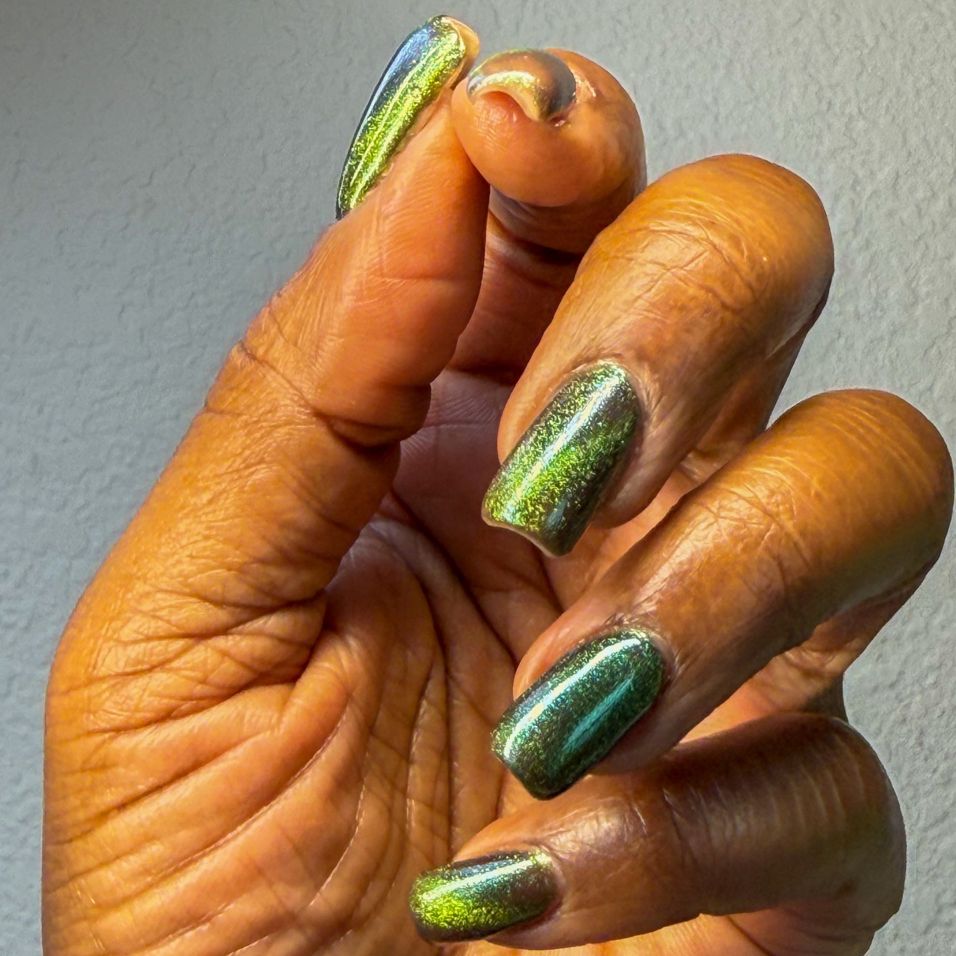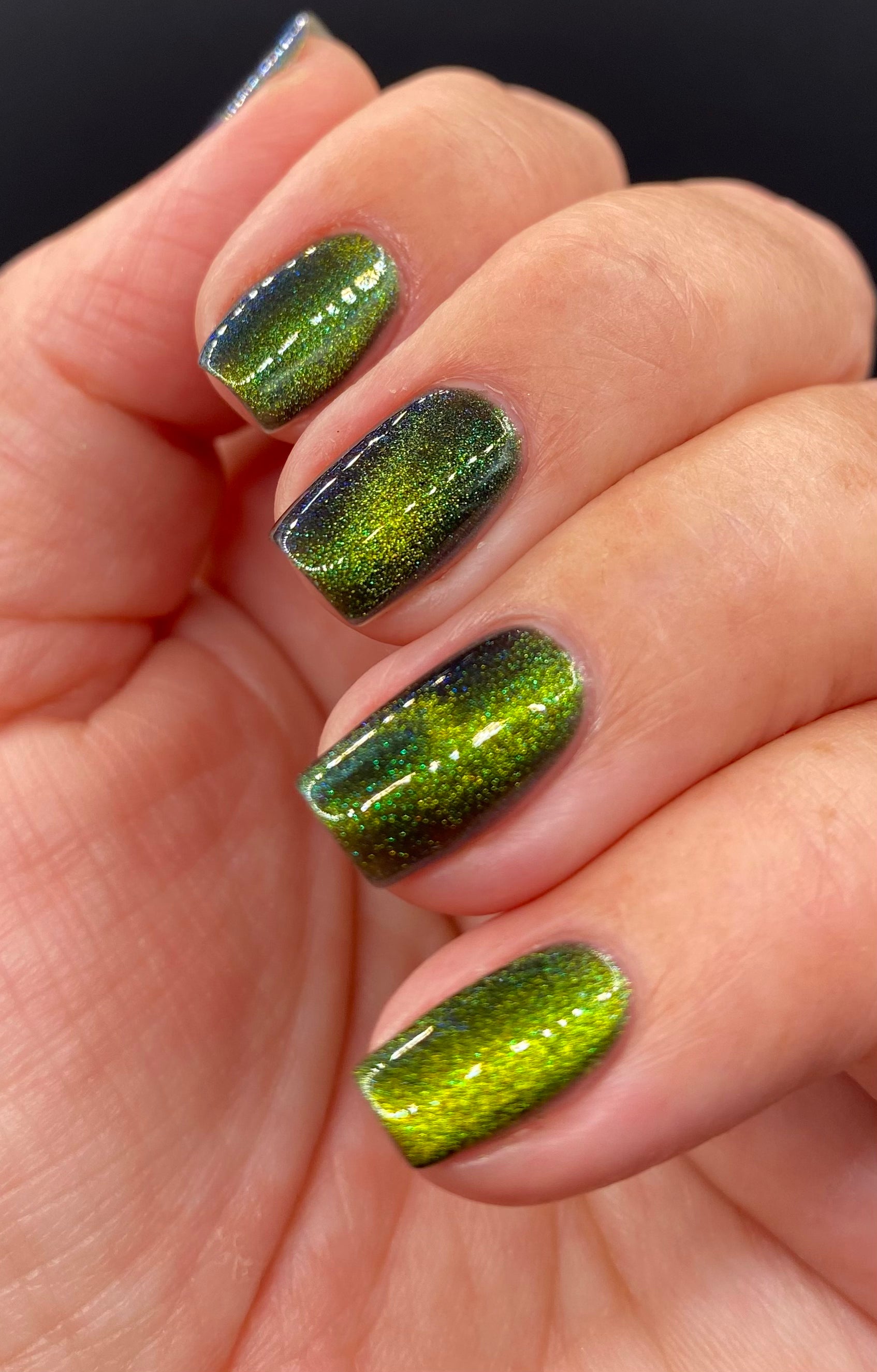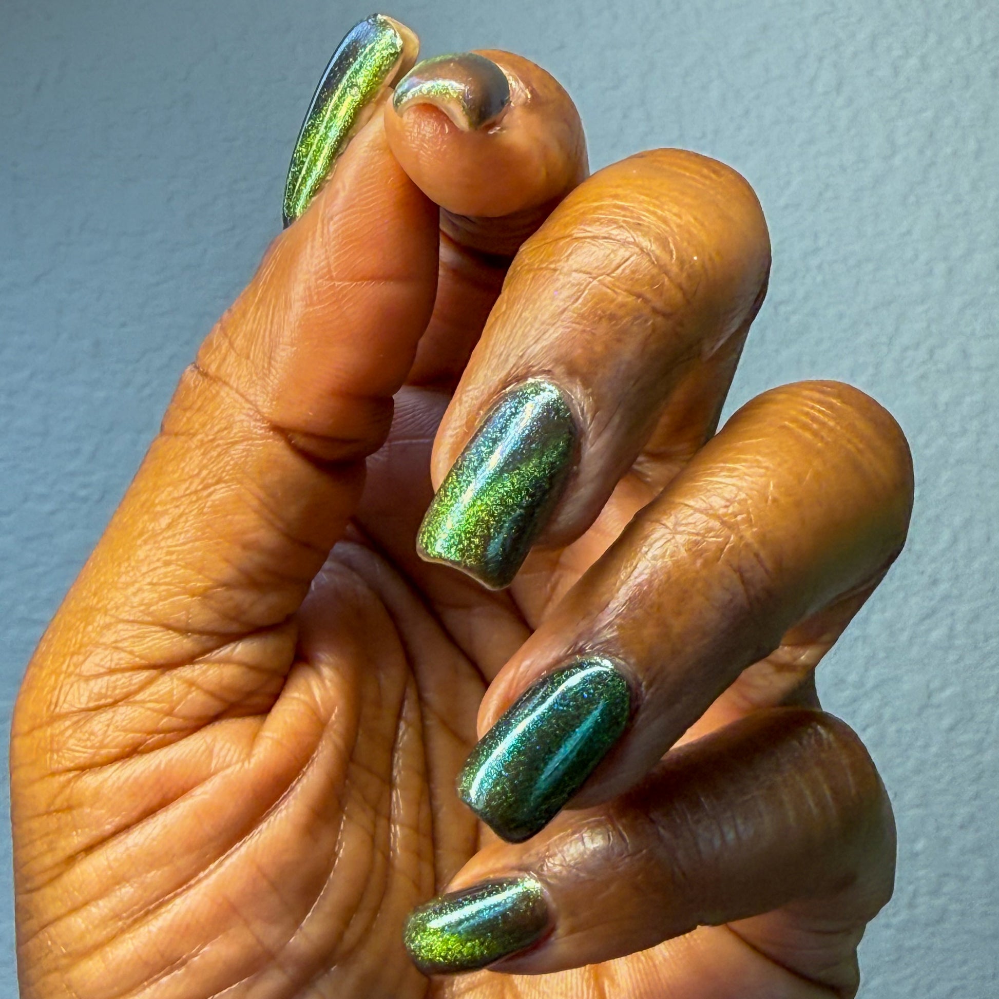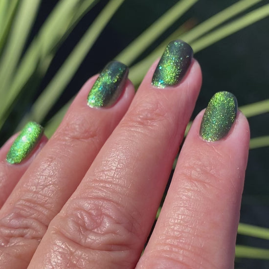 I am the mood is a dark green to blue teal shimmer swimming in a black JELLY base with a bright green magnetic. This is the only one of the collection that is a moody Jelly base. If jelly polishes aren't your thing do not worry a black base coat will fix that and you can still wear this beautiful polish without nail line.
