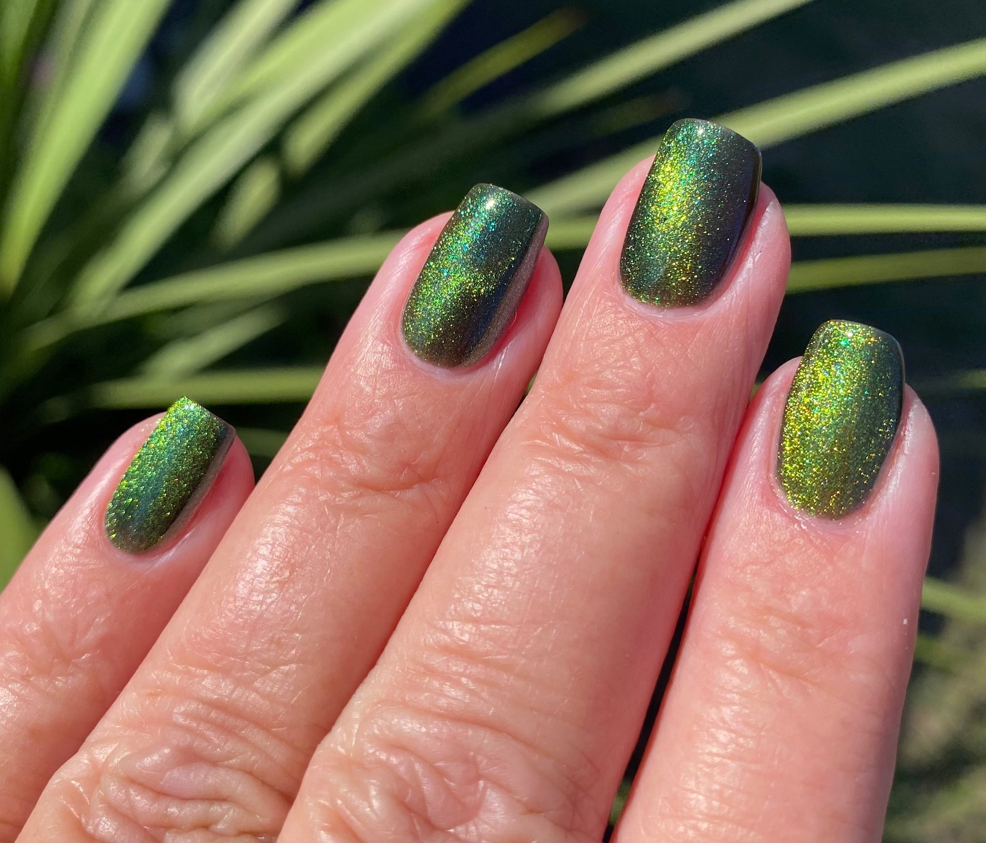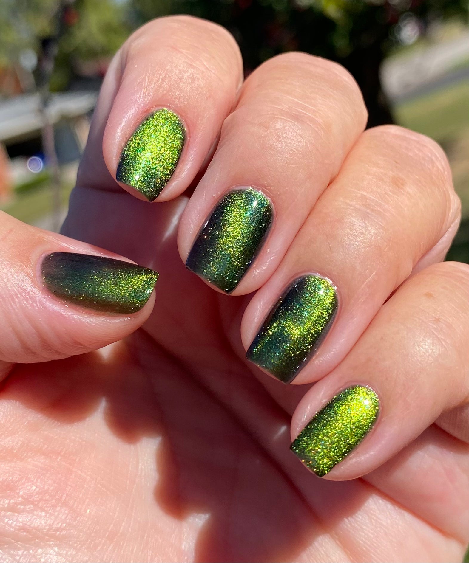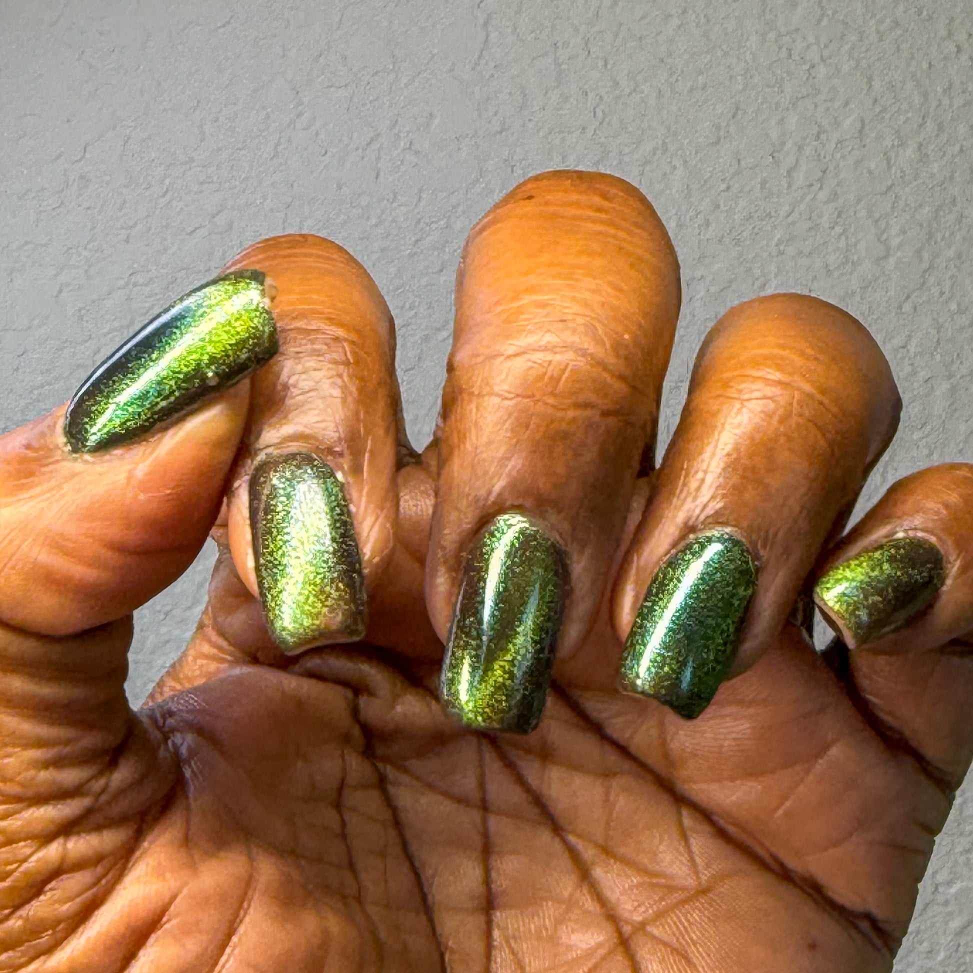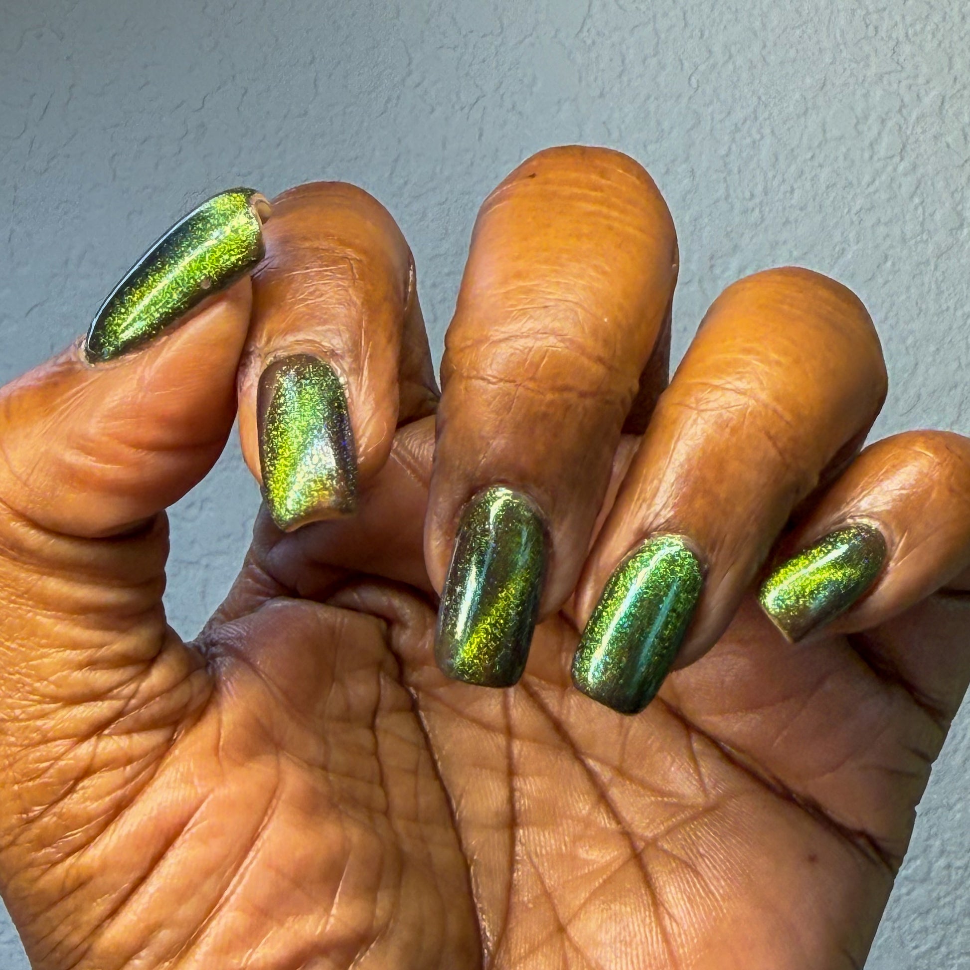 I am the mood is a dark green to blue teal shimmer swimming in a black JELLY base with a bright green magnetic. This is the only one of the collection that is a moody Jelly base. If jelly polishes aren't your thing do not worry a black base coat will fix that and you can still wear this beautiful polish without nail line.
