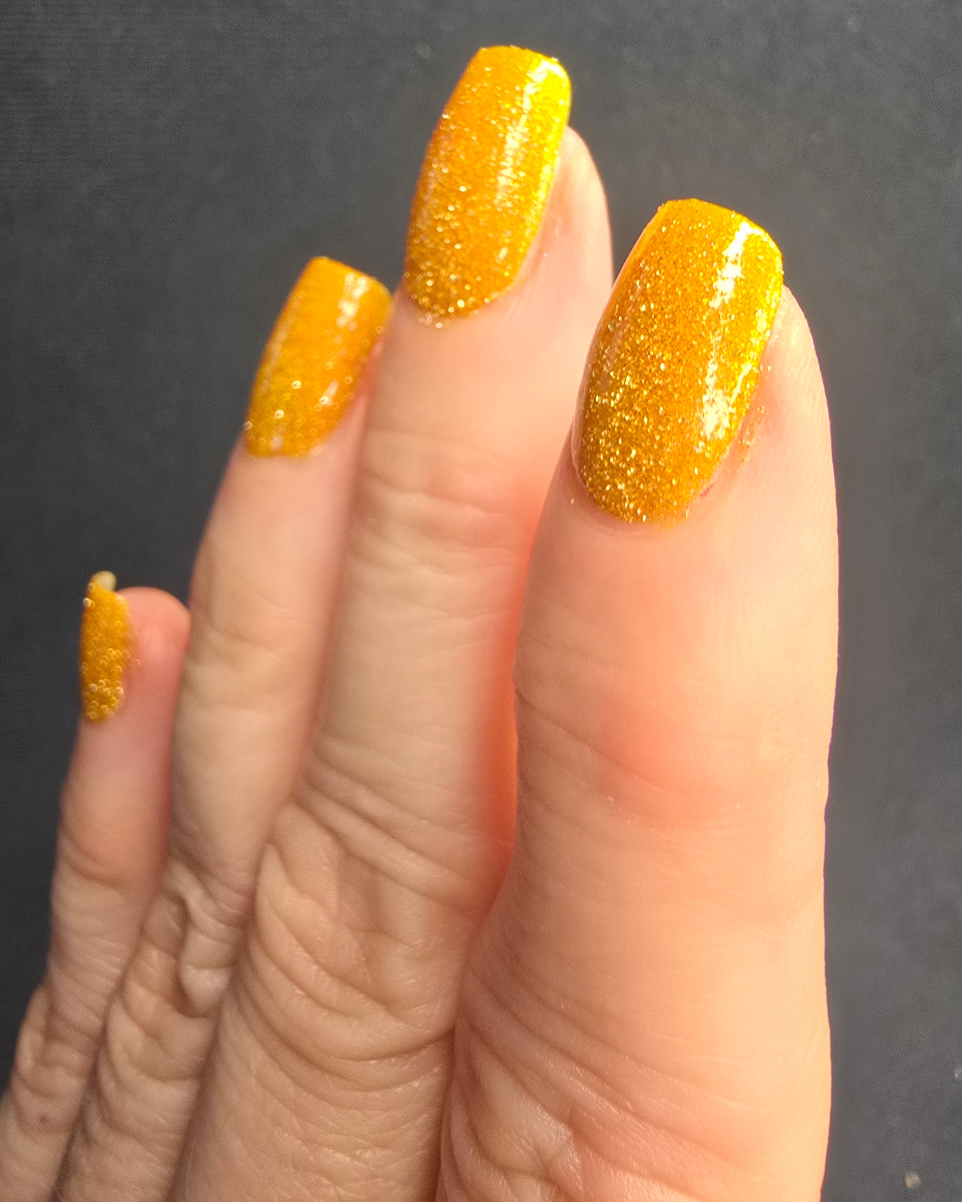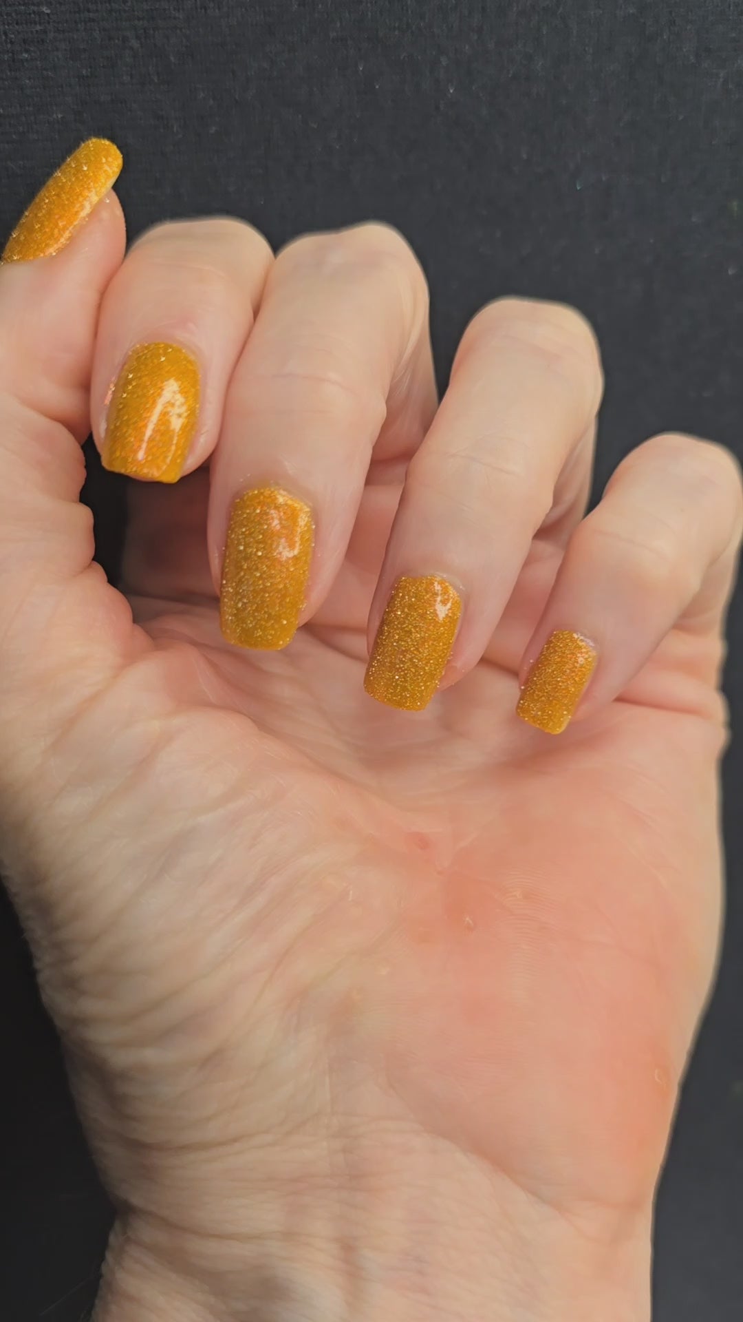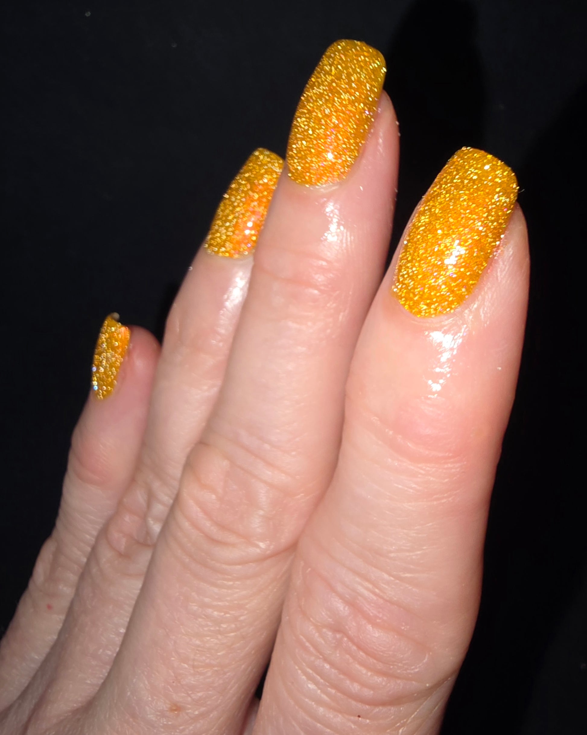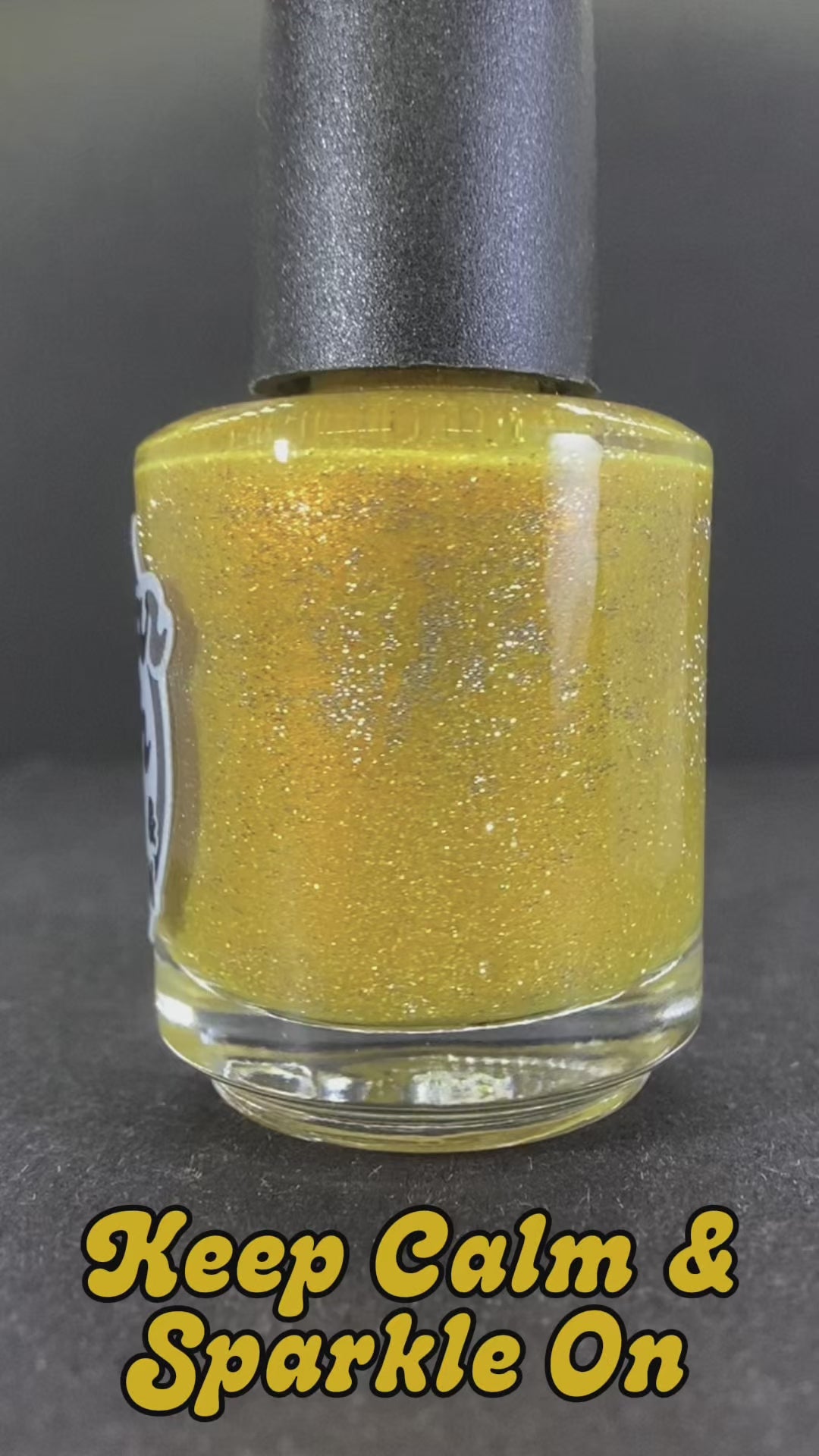Keep Calm and Sparkle on is an orange jelly base. This base is more tinted than the collection siblings. There is reddish yellow/orange reflective glitter and a copper red aurora shimmer. $13.50