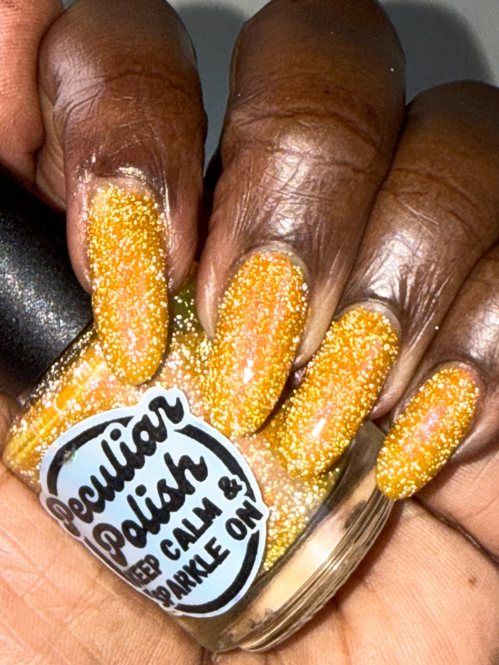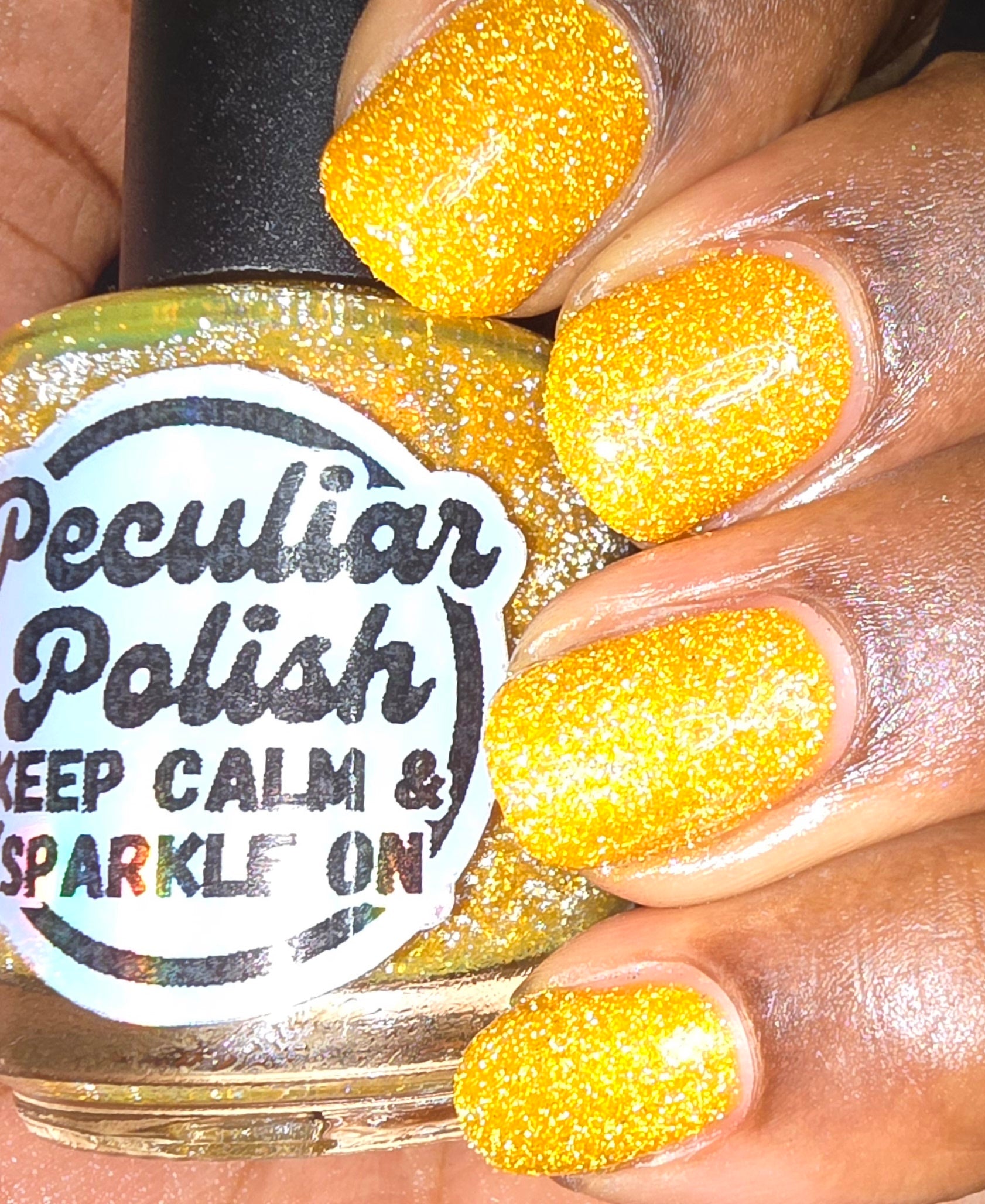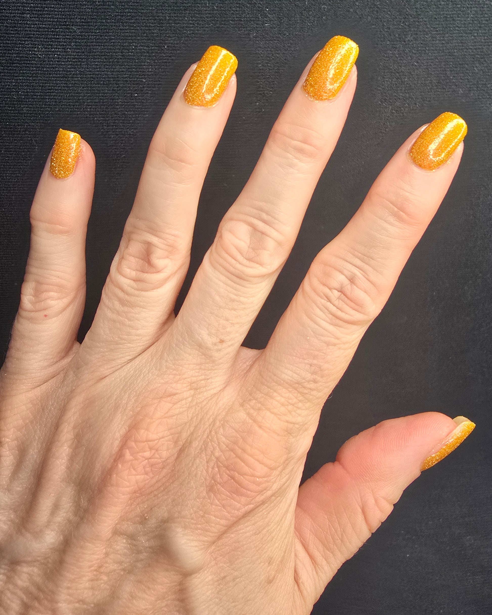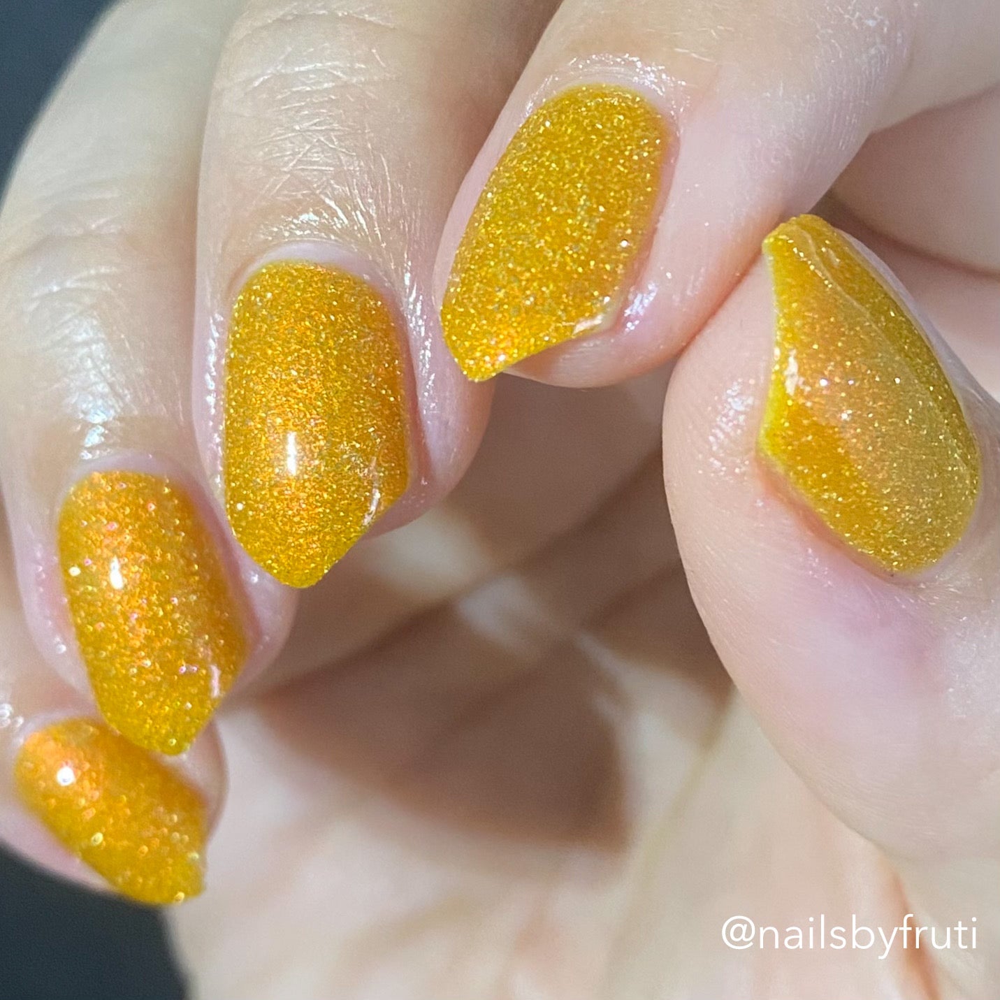 Keep Calm and Sparkle on is an orange jelly base. This base is more tinted than the collection siblings. There is reddish yellow/orange reflective glitter and a copper red aurora shimmer. $13.50