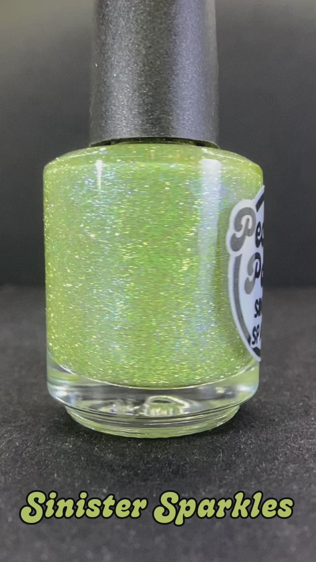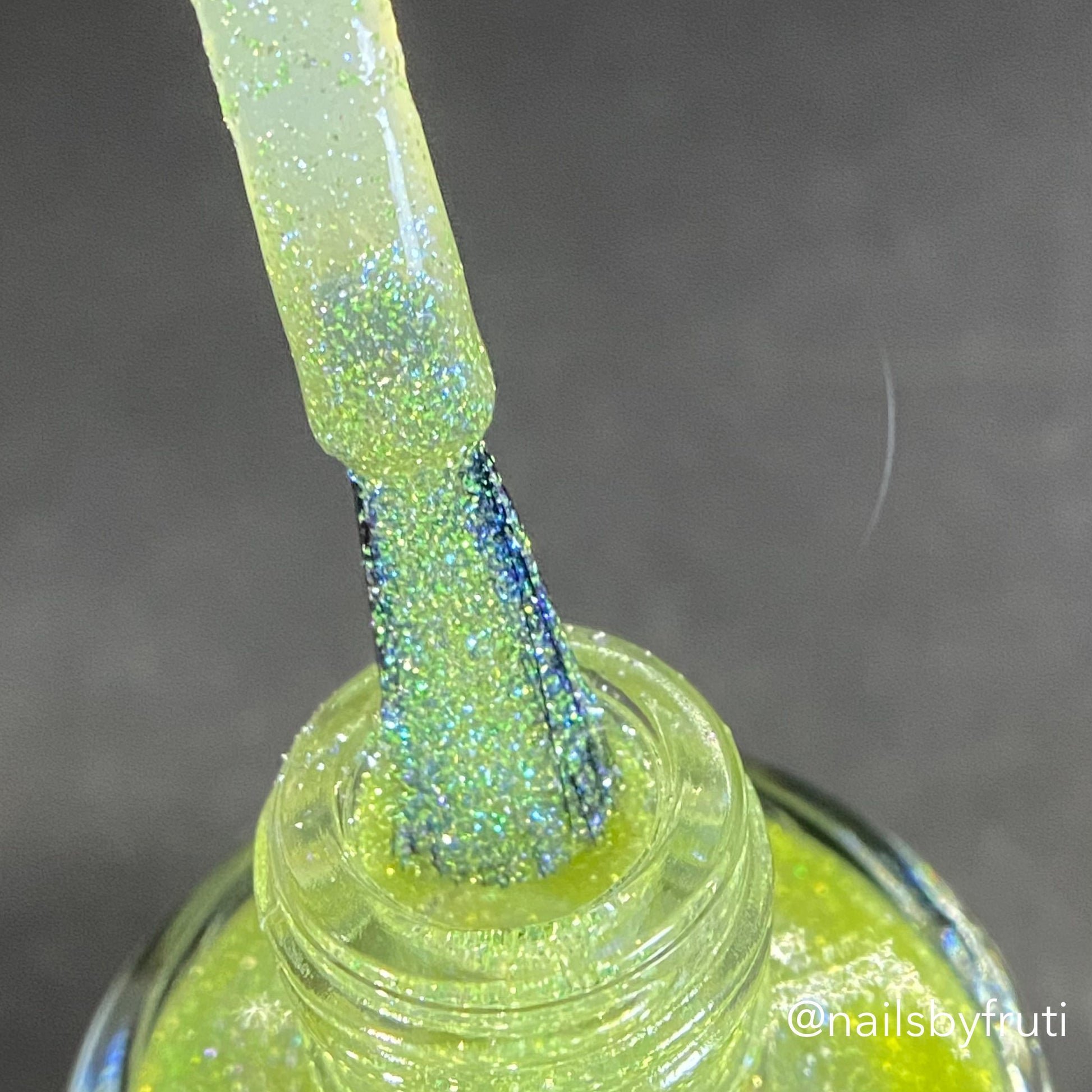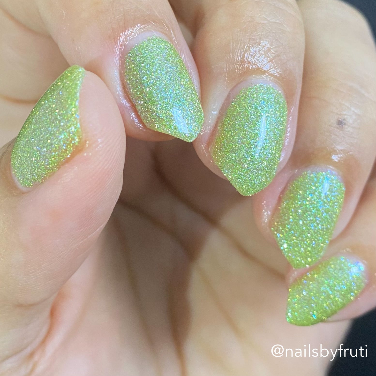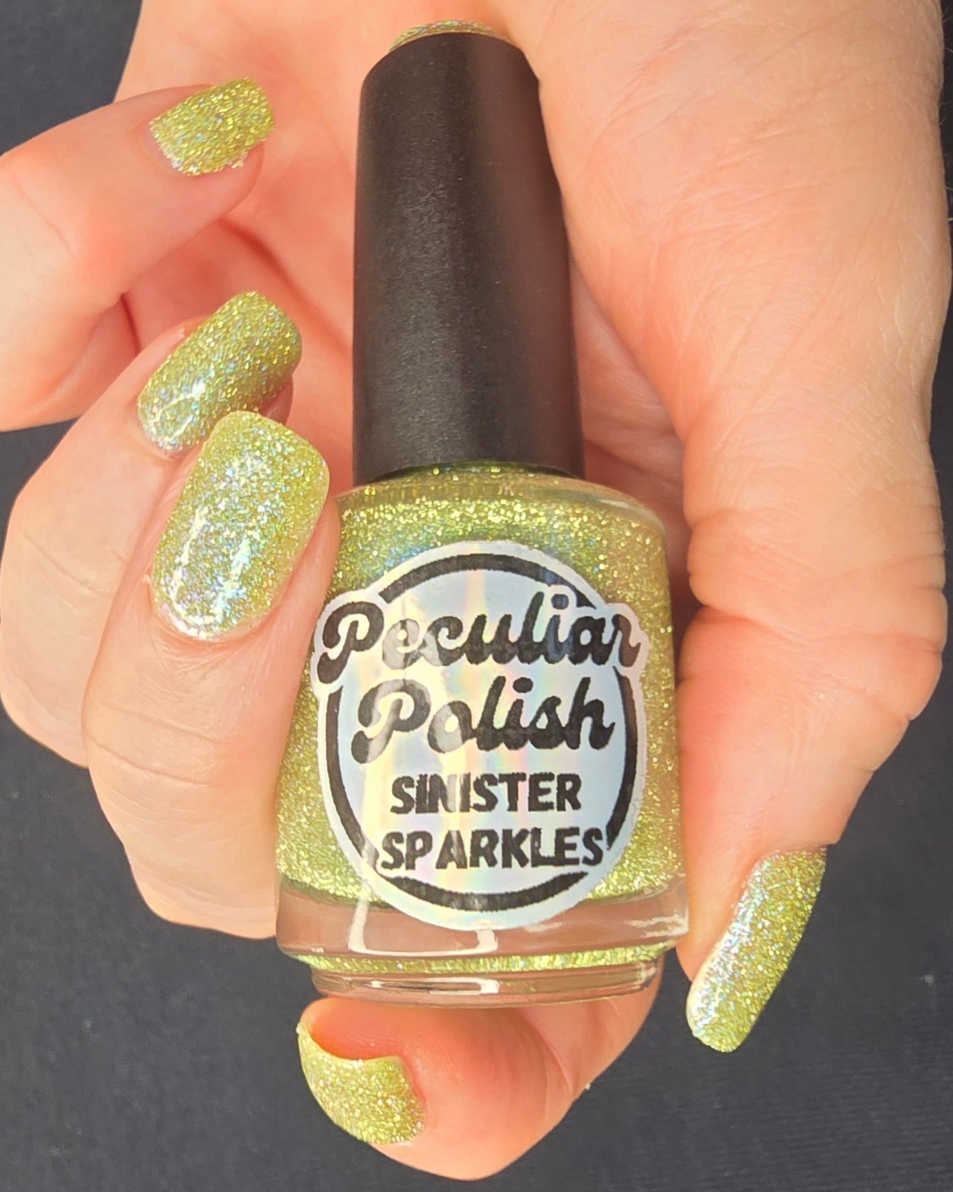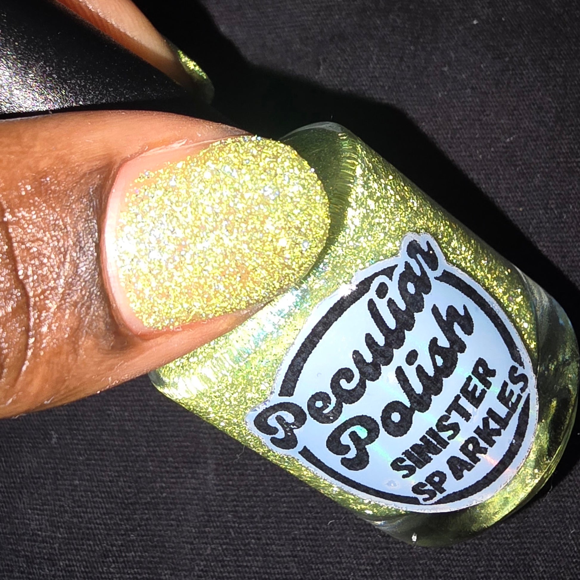 Sinister Sparkles is a very lightly tinted green base with a lime green reflective glitter being the star of the show! It also has a blue aurora shimmer that is seen as purple at extreme angles.