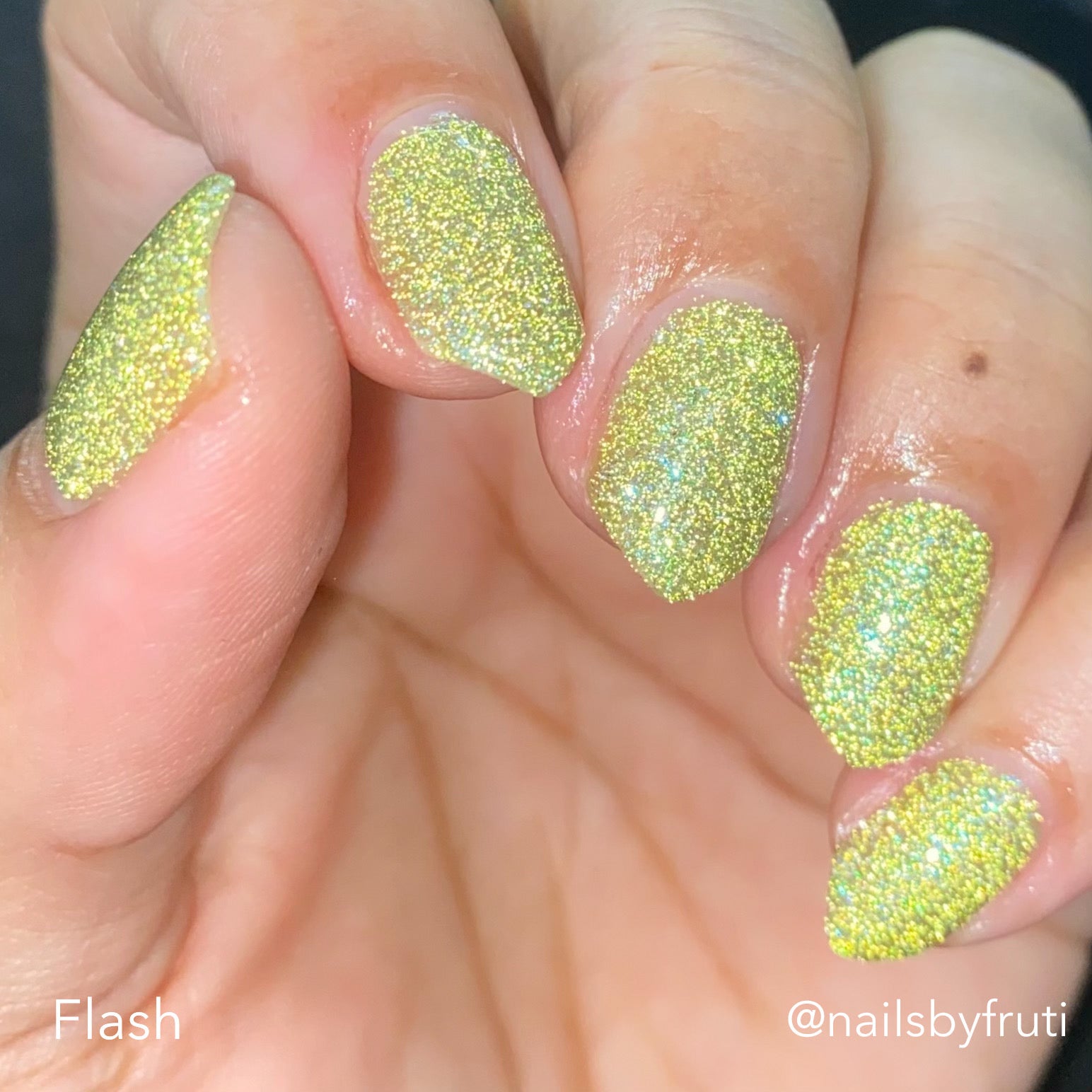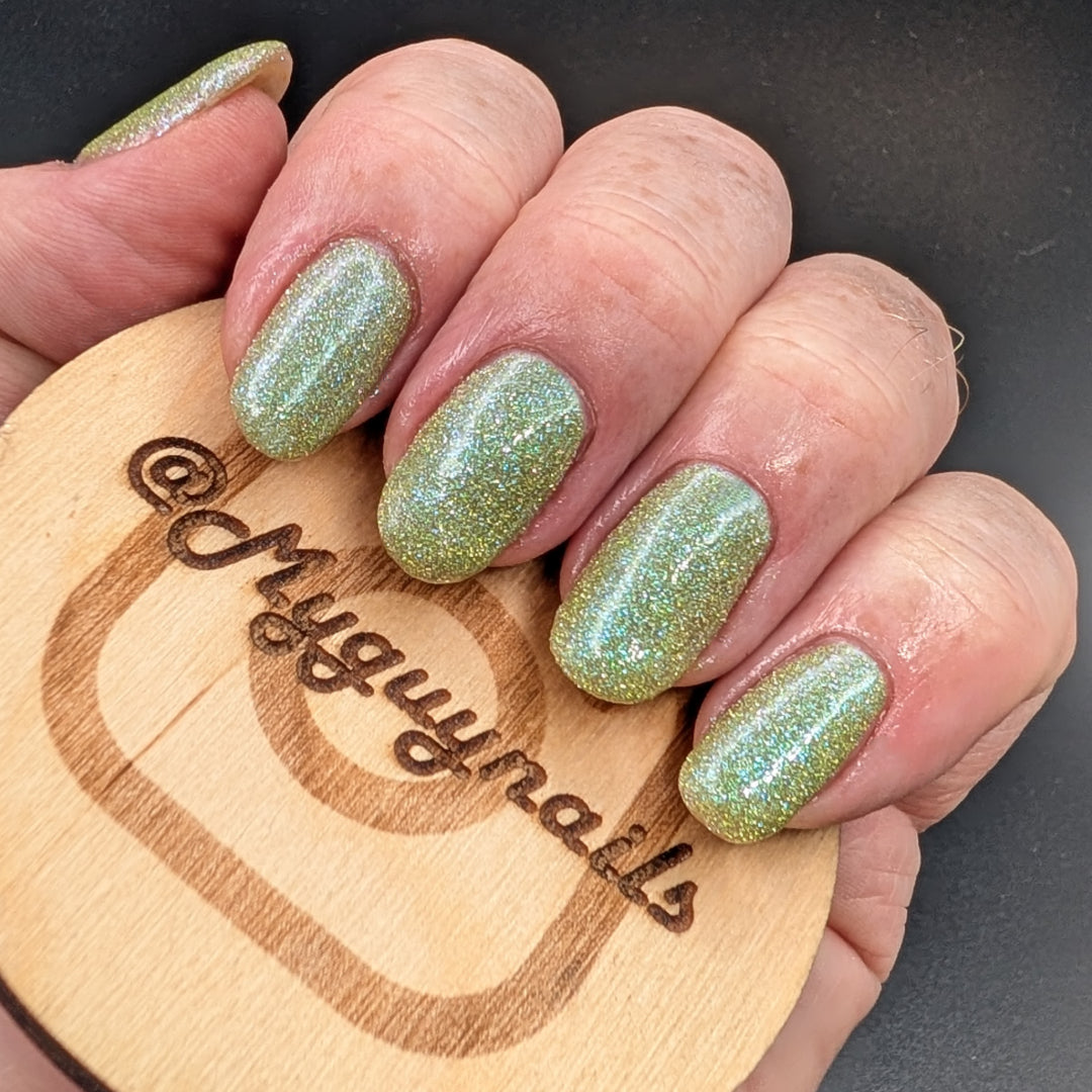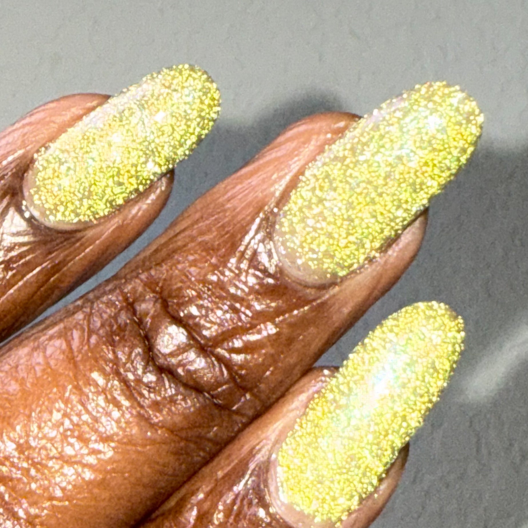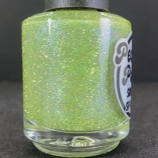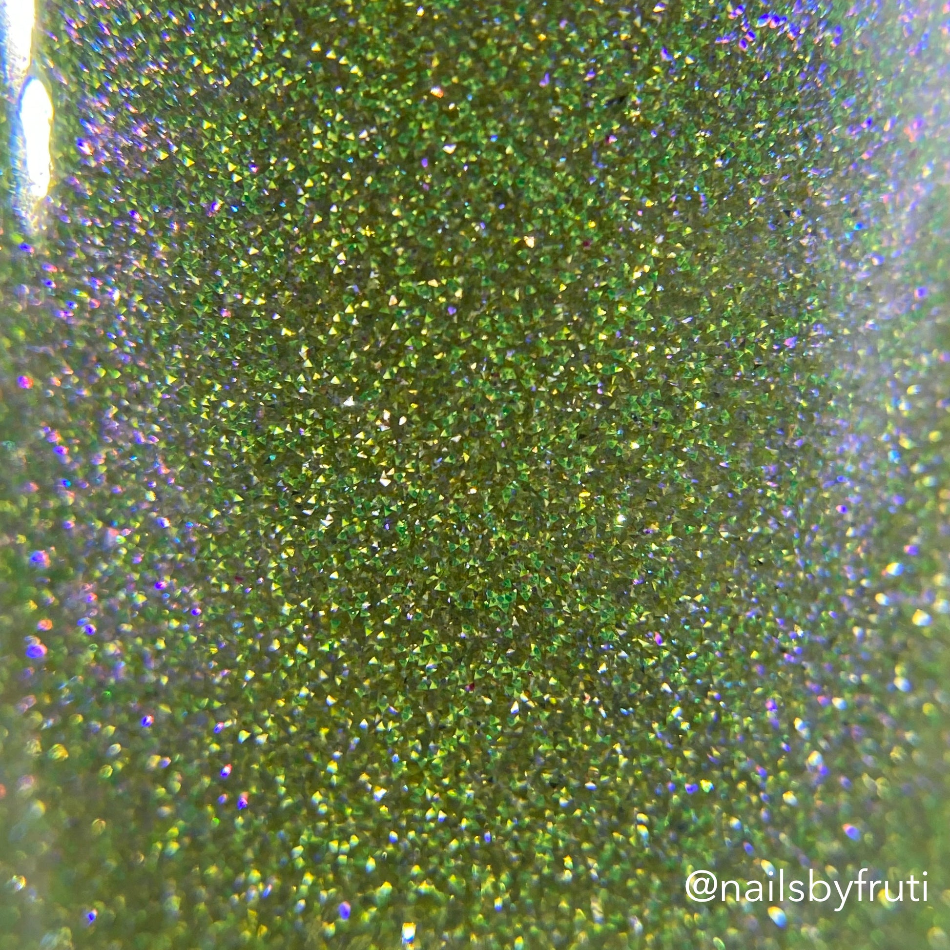 Sinister Sparkles is a very lightly tinted green base with a lime green reflective glitter being the star of the show! It also has a blue aurora shimmer that is seen as purple at extreme angles.
