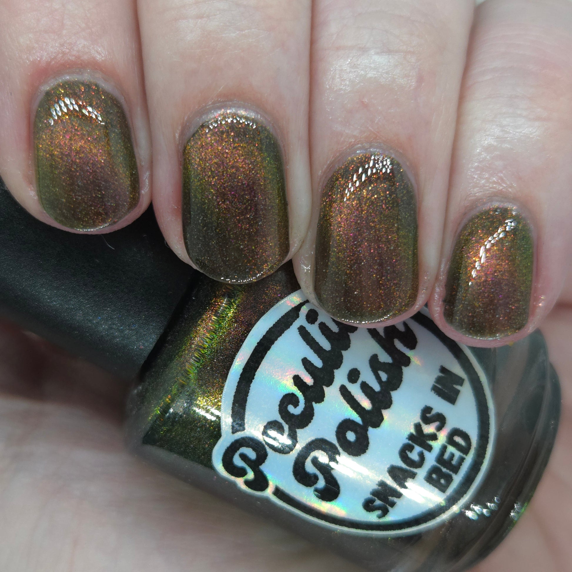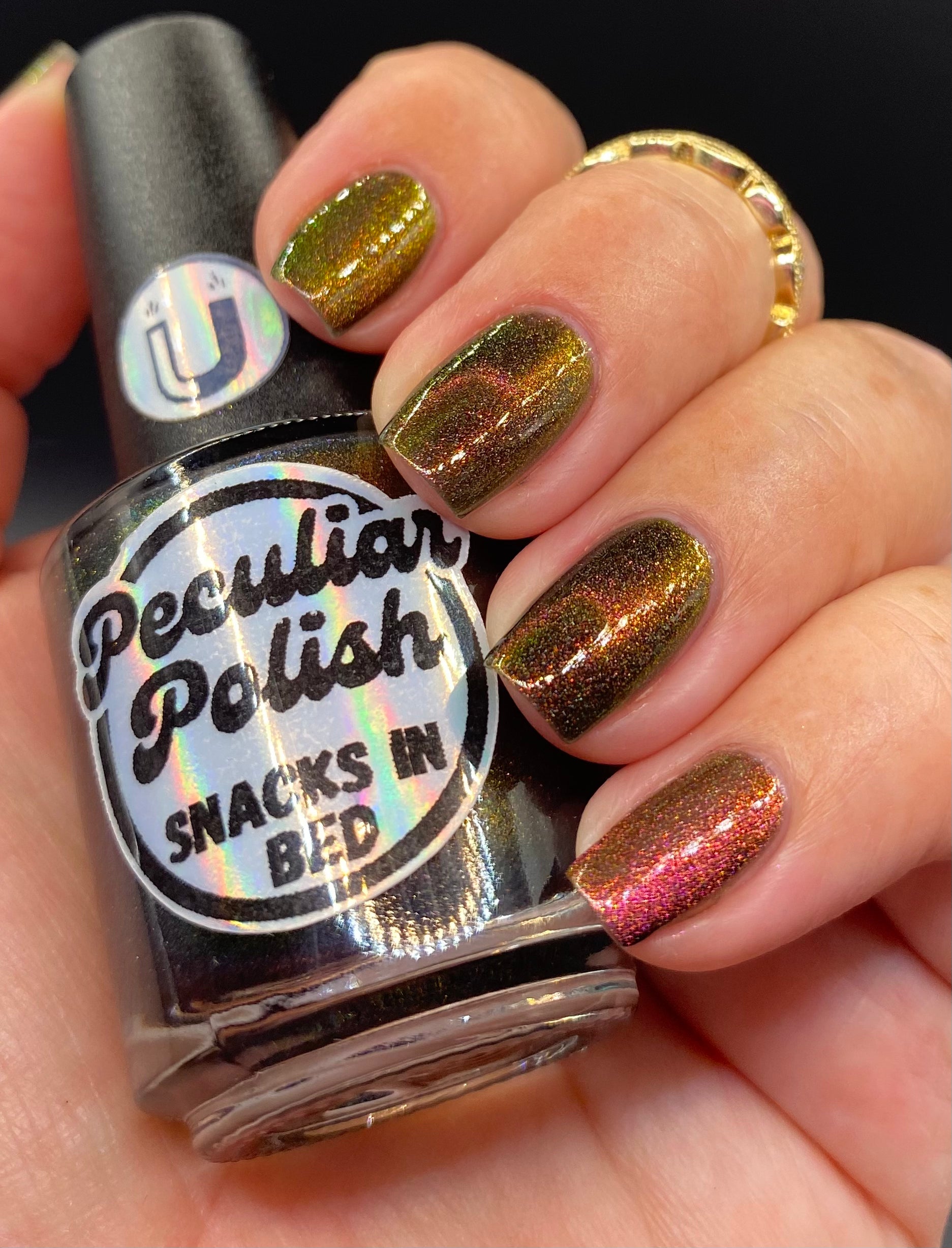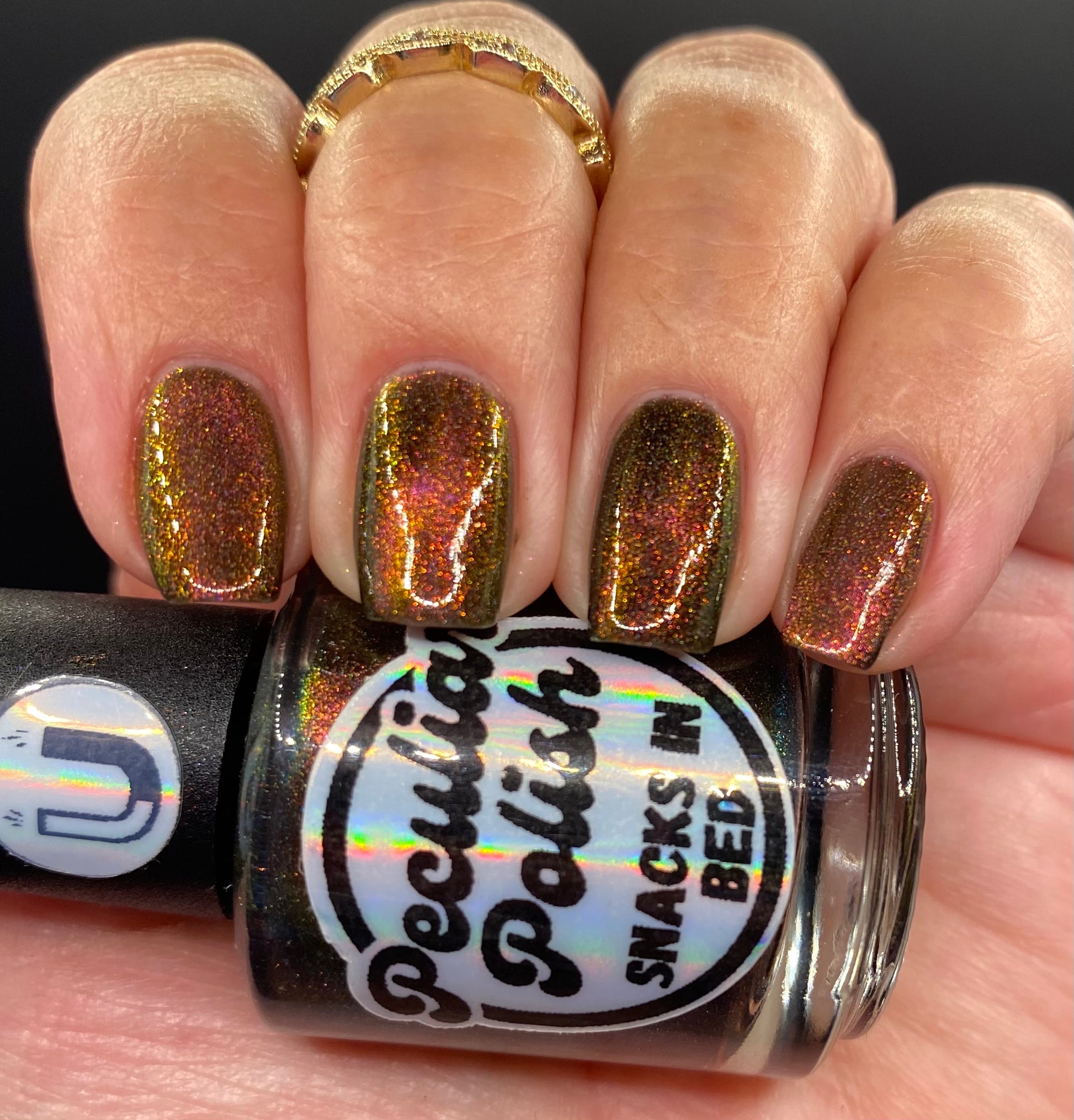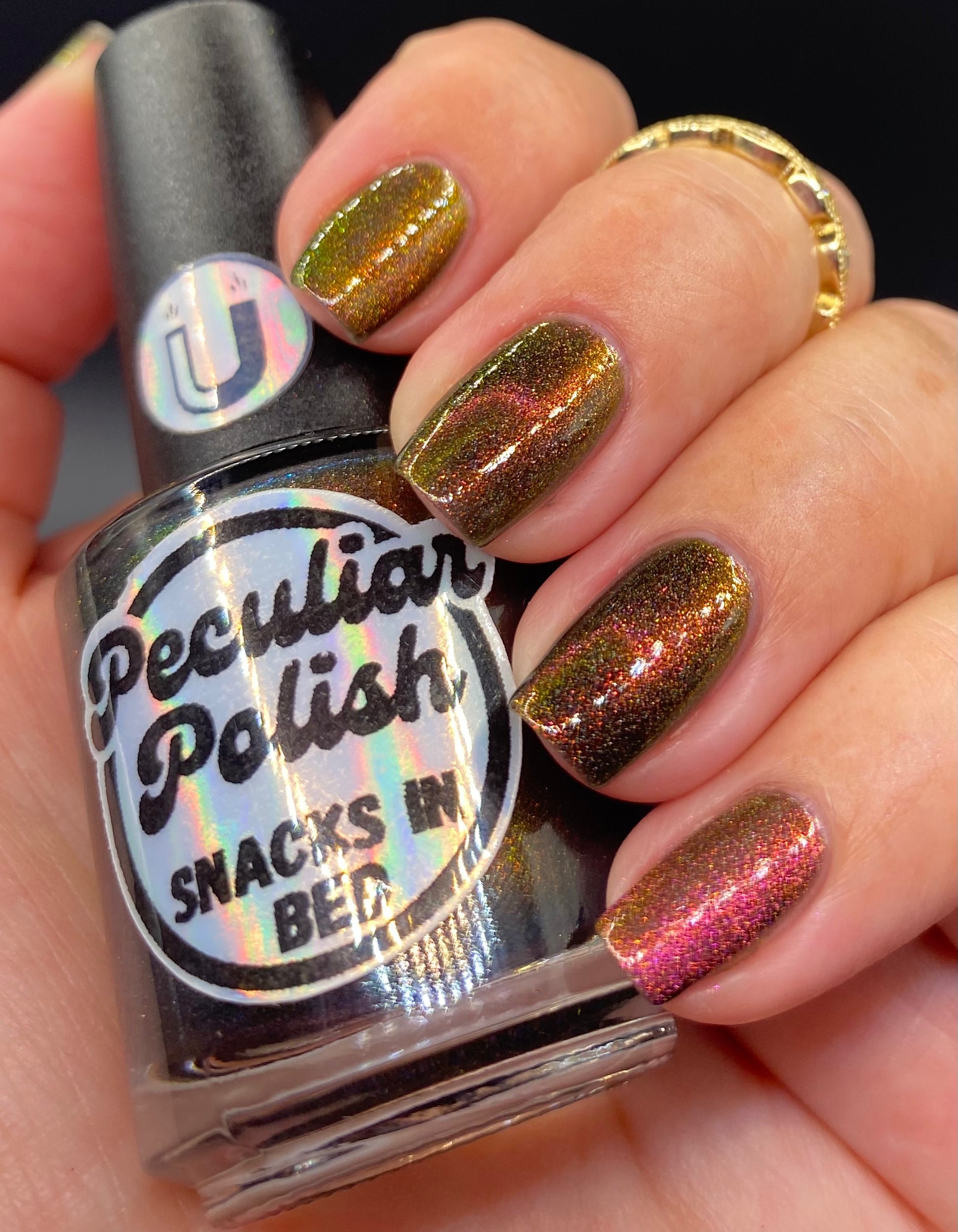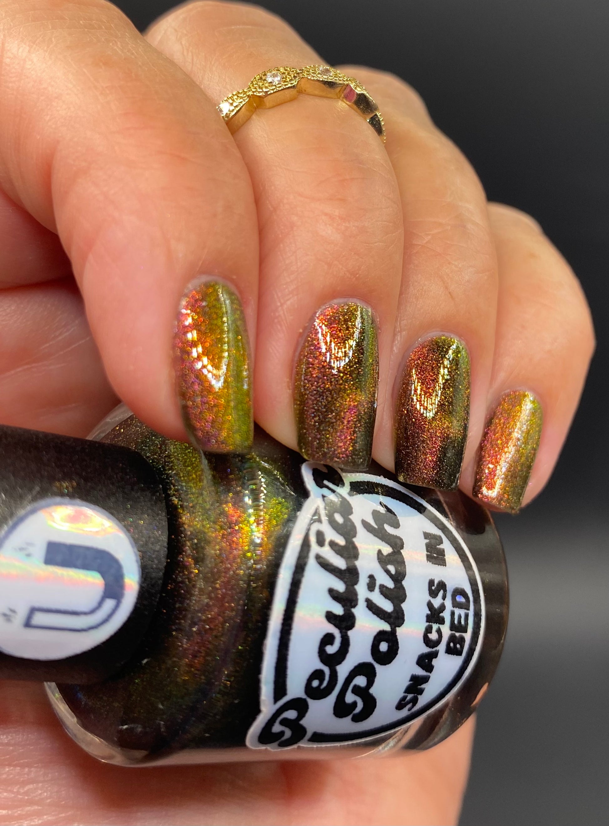 Snacks in bed reminds me of sparkly Cheeto dust over a multi-chrome polish. This grungy polish lovers dream is a green-orange-gold shifting shimmer swimming in a black crelly base with a red to gold magnetic, green at extreme angles. Is this the prugly of the collection? I guess beauty is in the eye of the beholder!