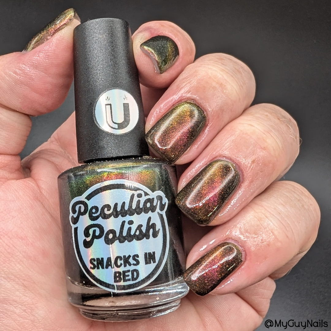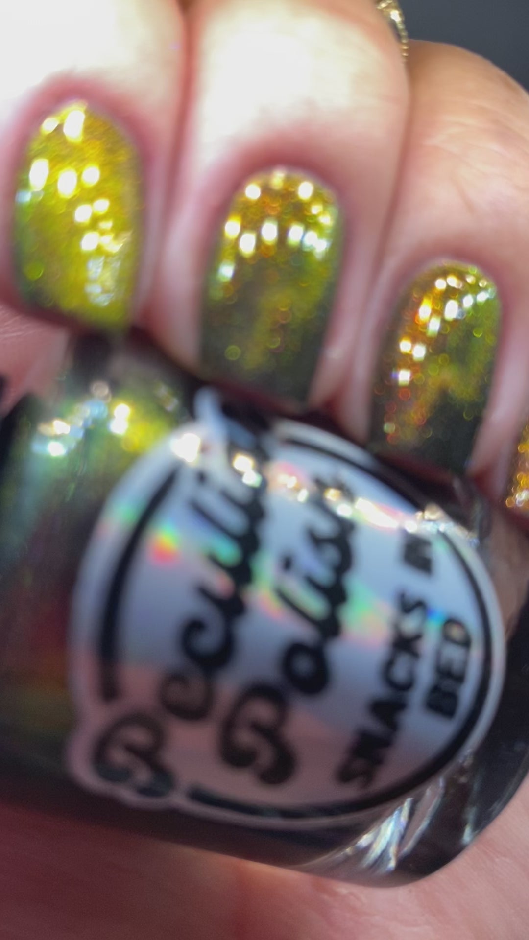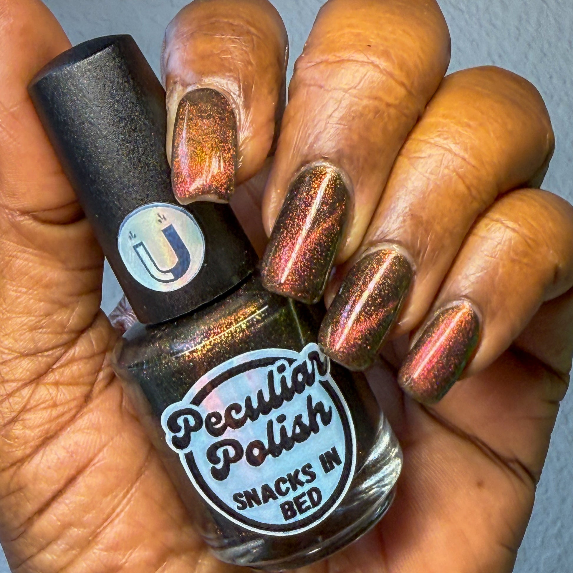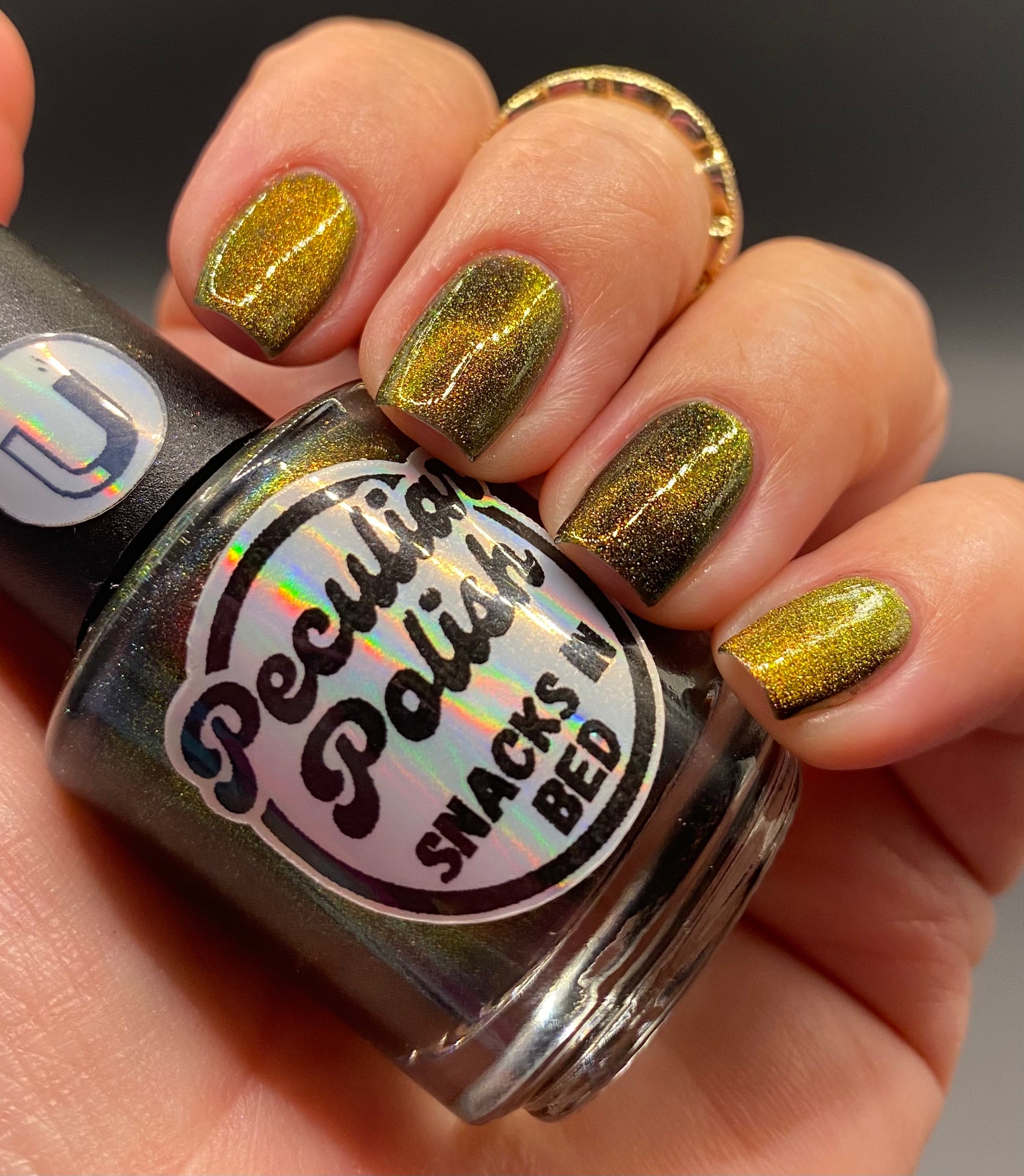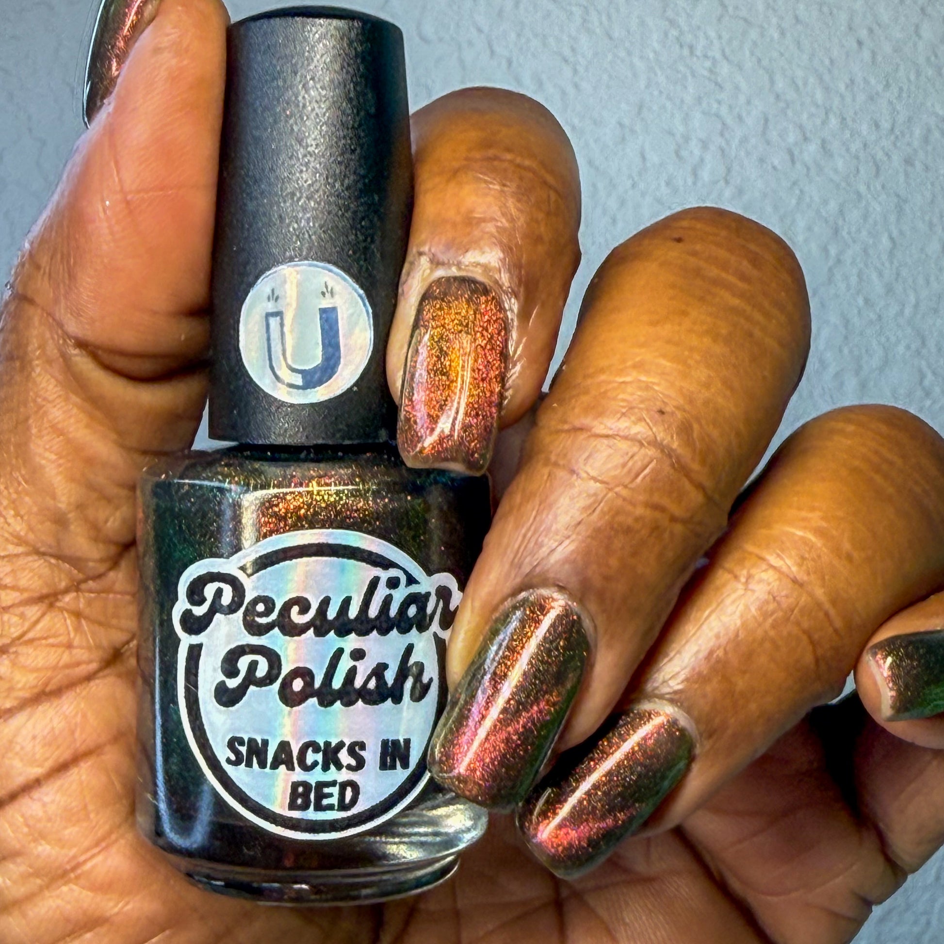 Snacks in bed reminds me of sparkly Cheeto dust over a multi-chrome polish. This grungy polish lovers dream is a green-orange-gold shifting shimmer swimming in a black crelly base with a red to gold magnetic, green at extreme angles. Is this the prugly of the collection? I guess beauty is in the eye of the beholder!
