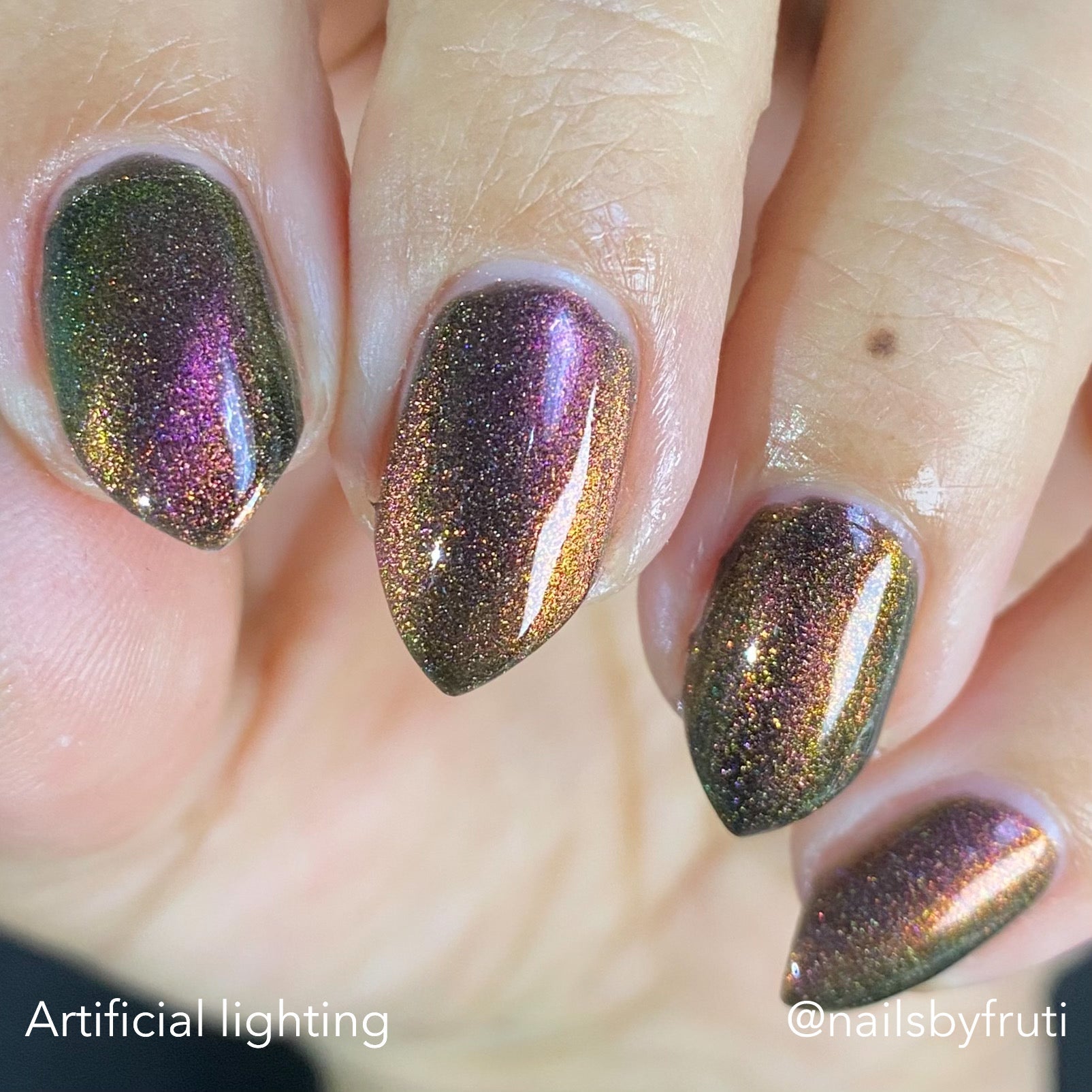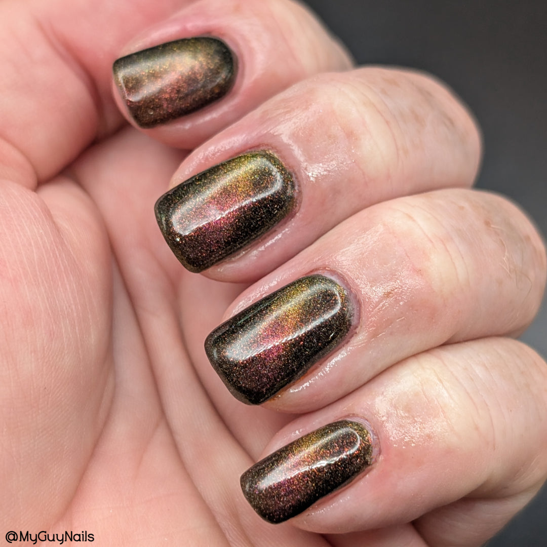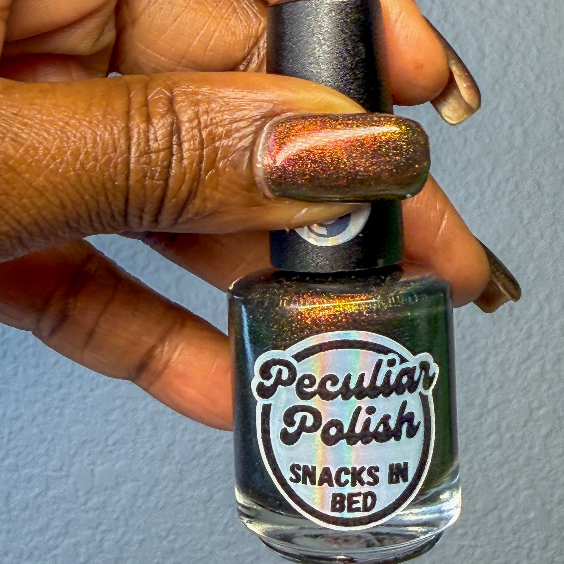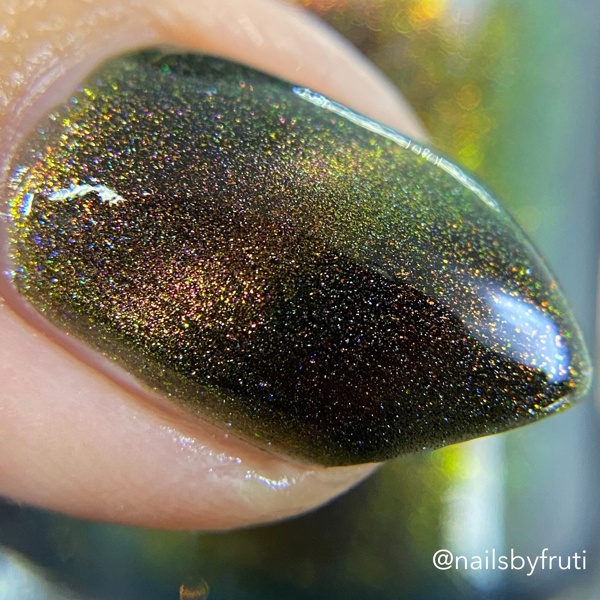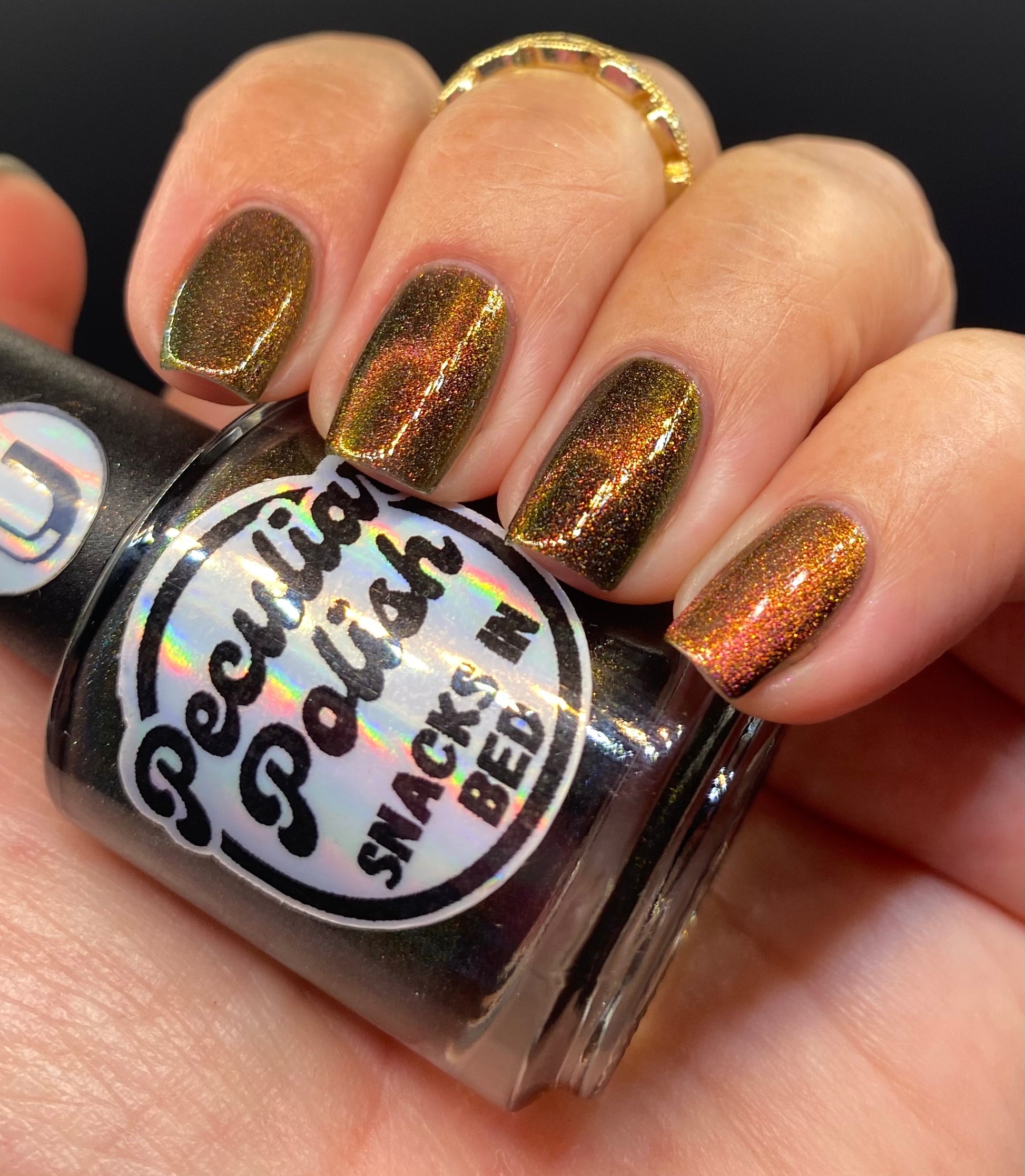 Snacks in bed reminds me of sparkly Cheeto dust over a multi-chrome polish. This grungy polish lovers dream is a green-orange-gold shifting shimmer swimming in a black crelly base with a red to gold magnetic, green at extreme angles. Is this the prugly of the collection? I guess beauty is in the eye of the beholder!