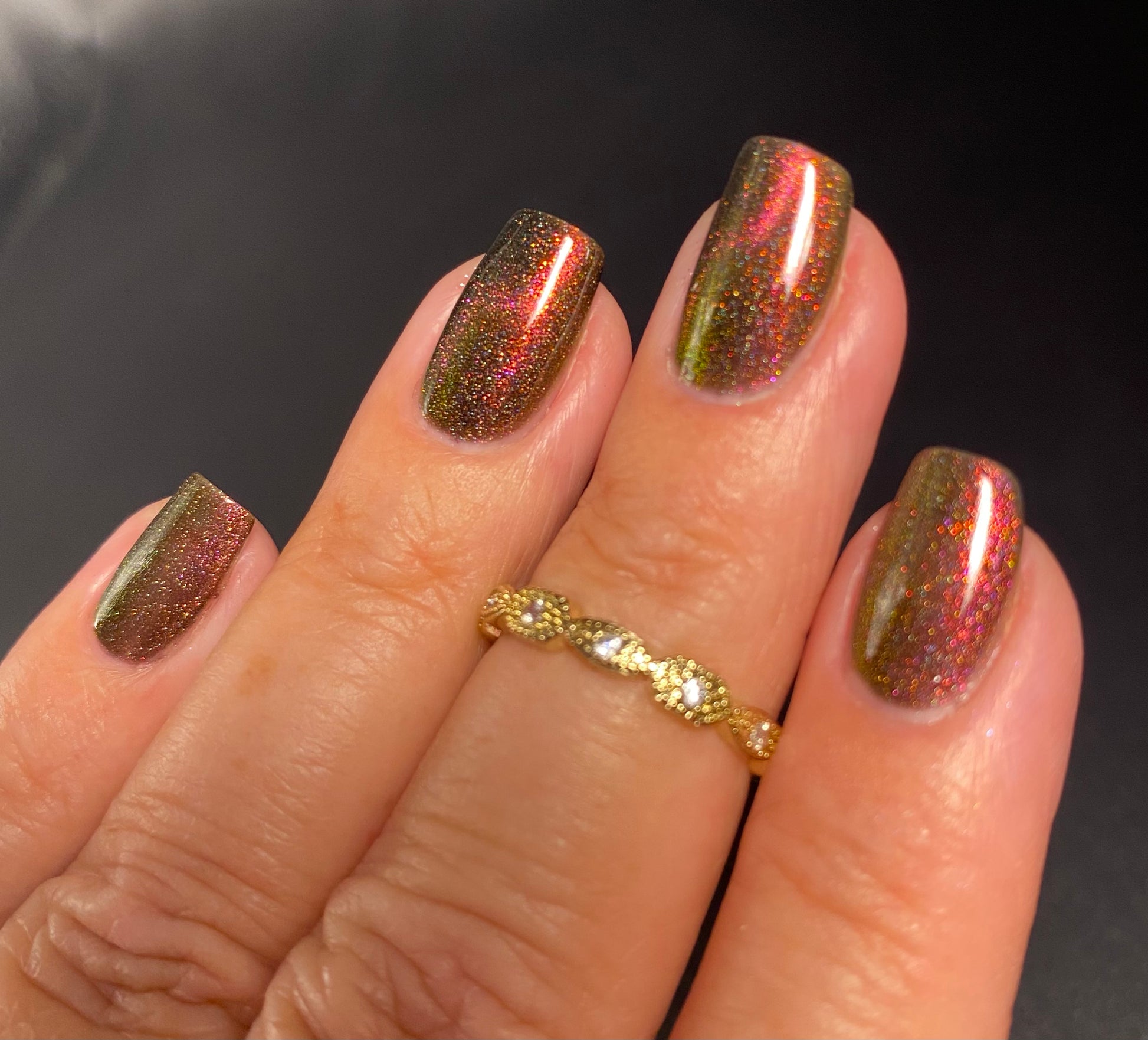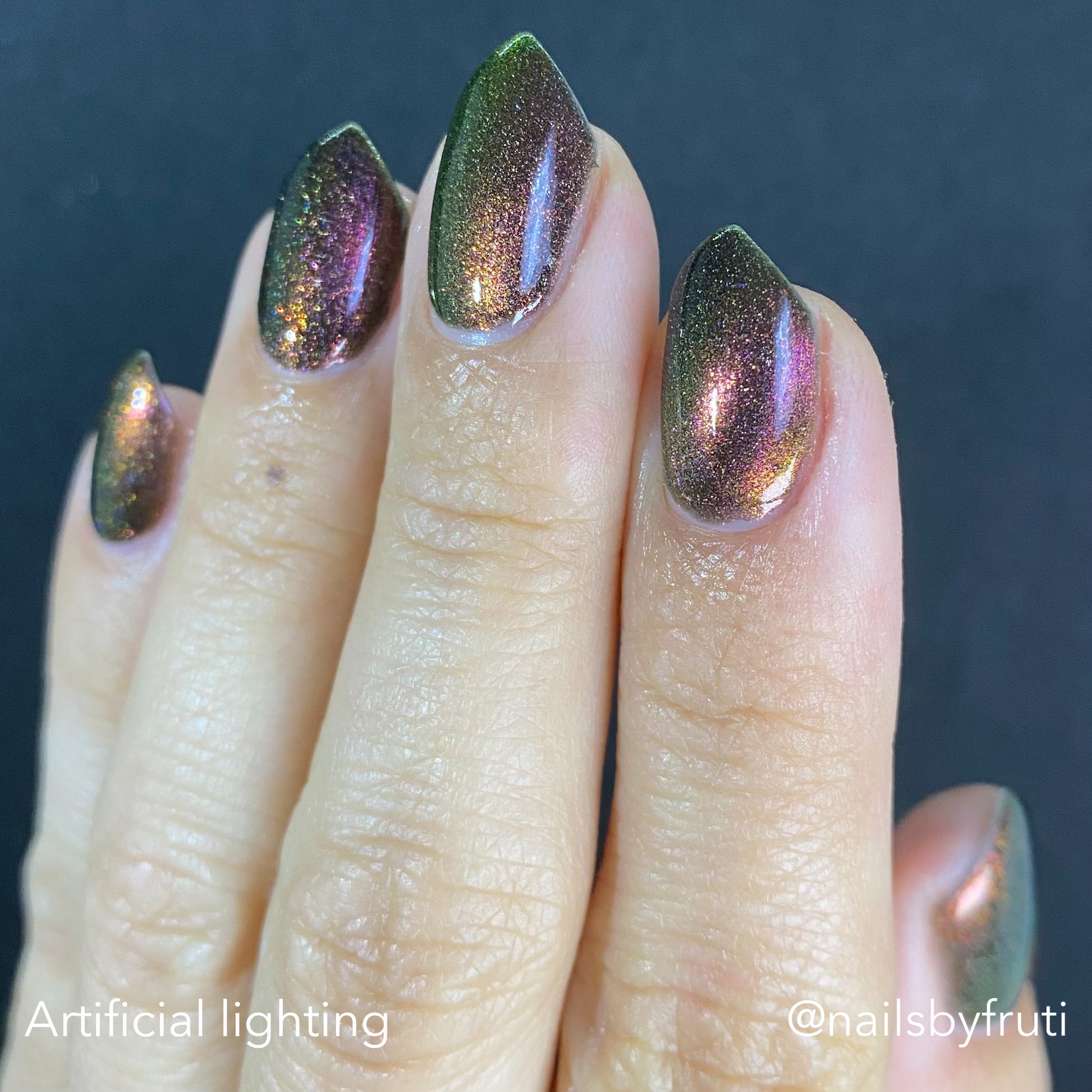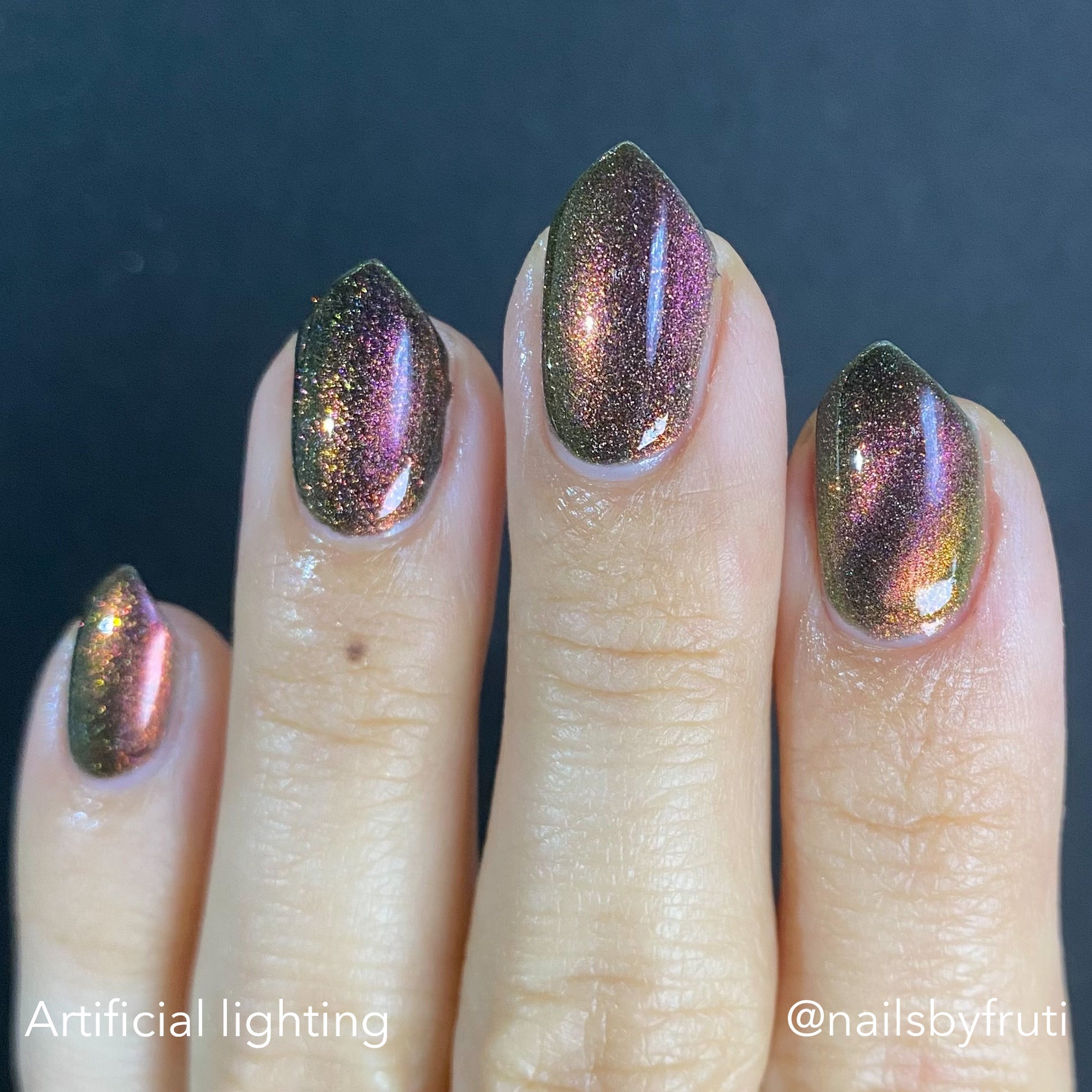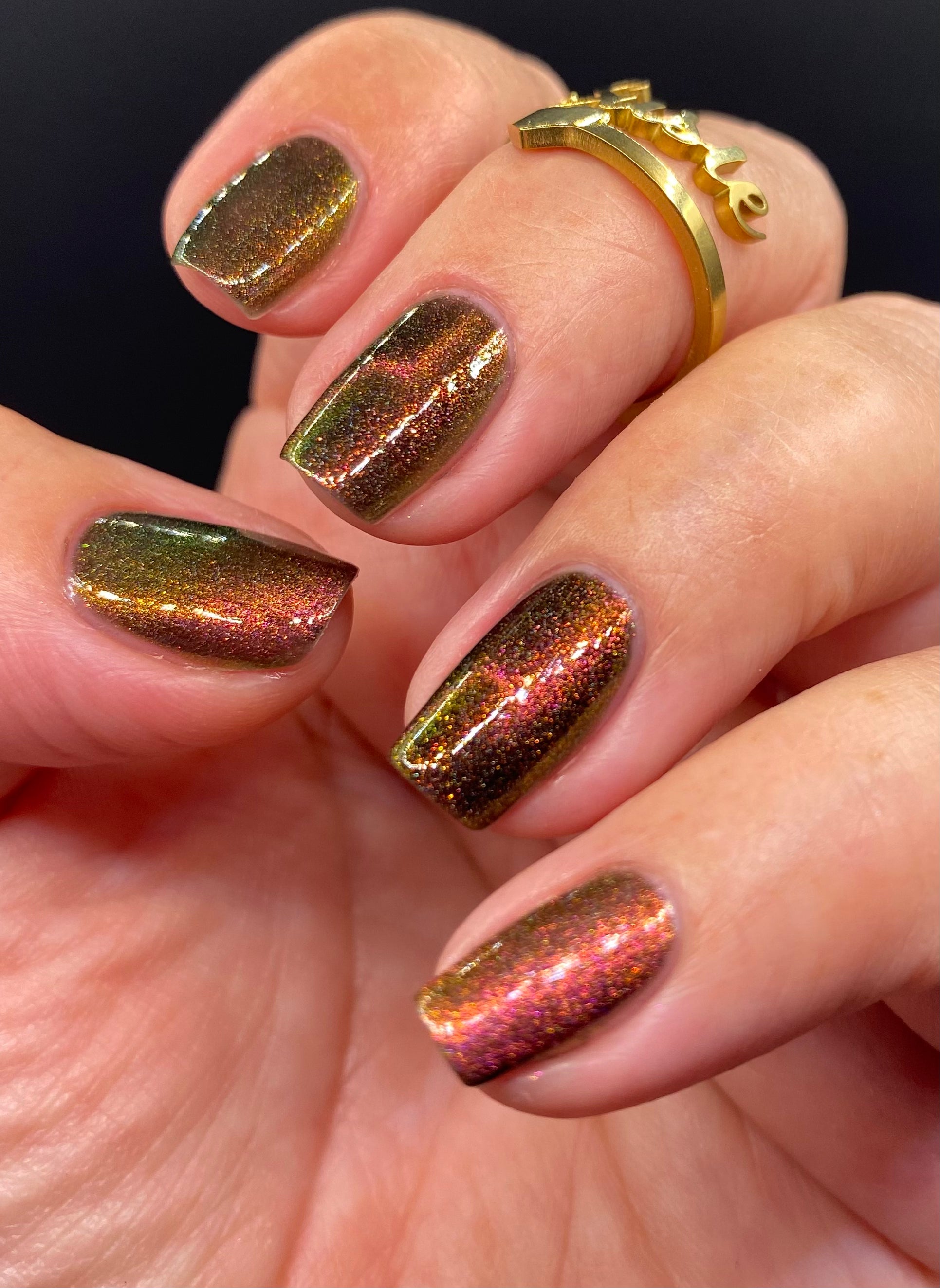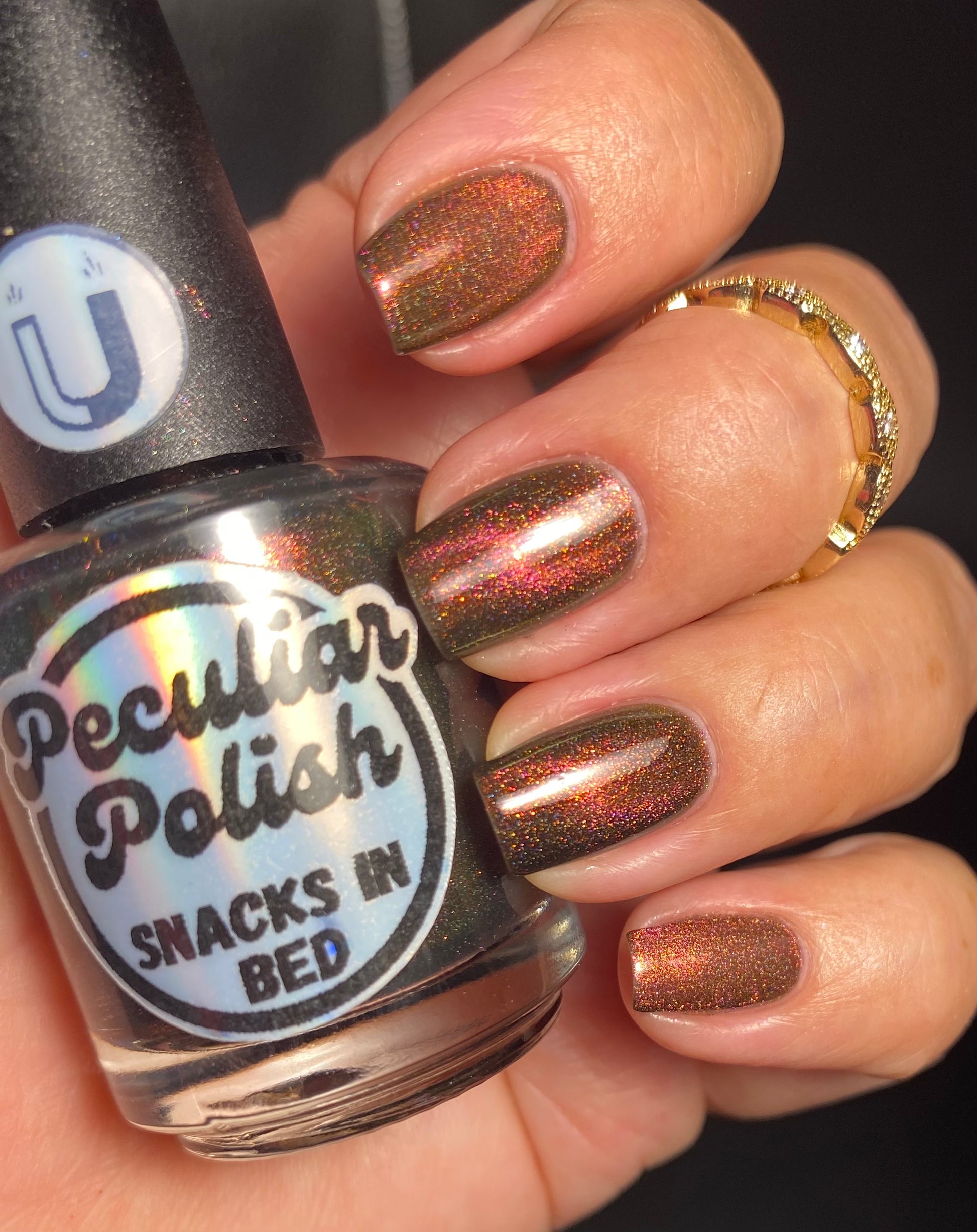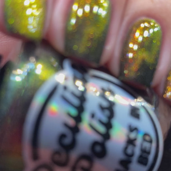 Snacks in bed reminds me of sparkly Cheeto dust over a multi-chrome polish. This grungy polish lovers dream is a green-orange-gold shifting shimmer swimming in a black crelly base with a red to gold magnetic, green at extreme angles. Is this the prugly of the collection? I guess beauty is in the eye of the beholder!