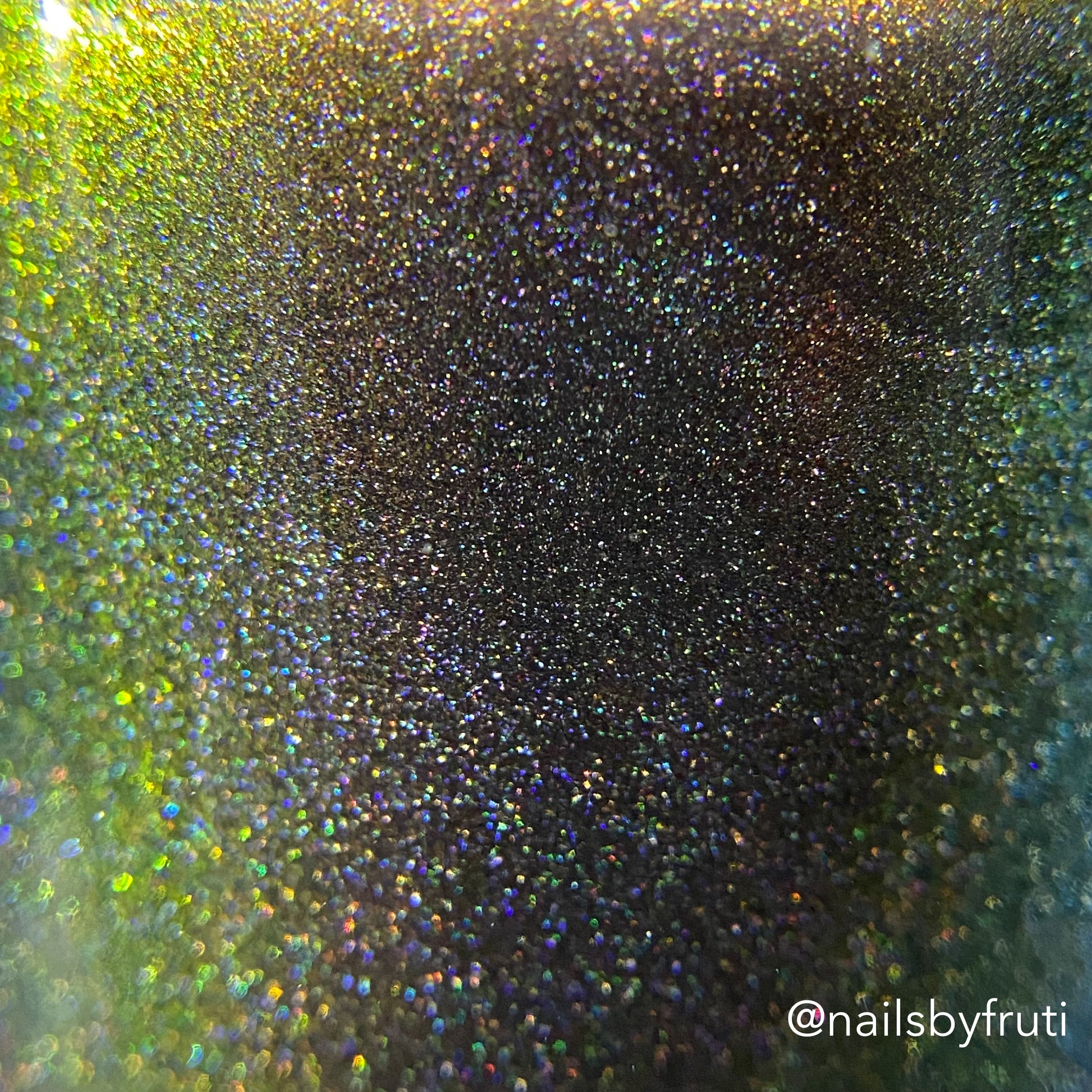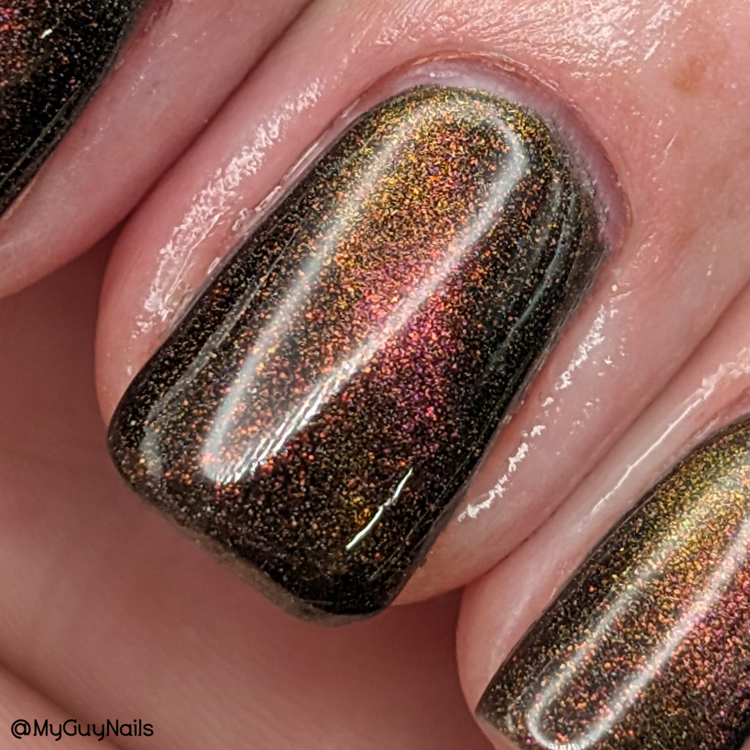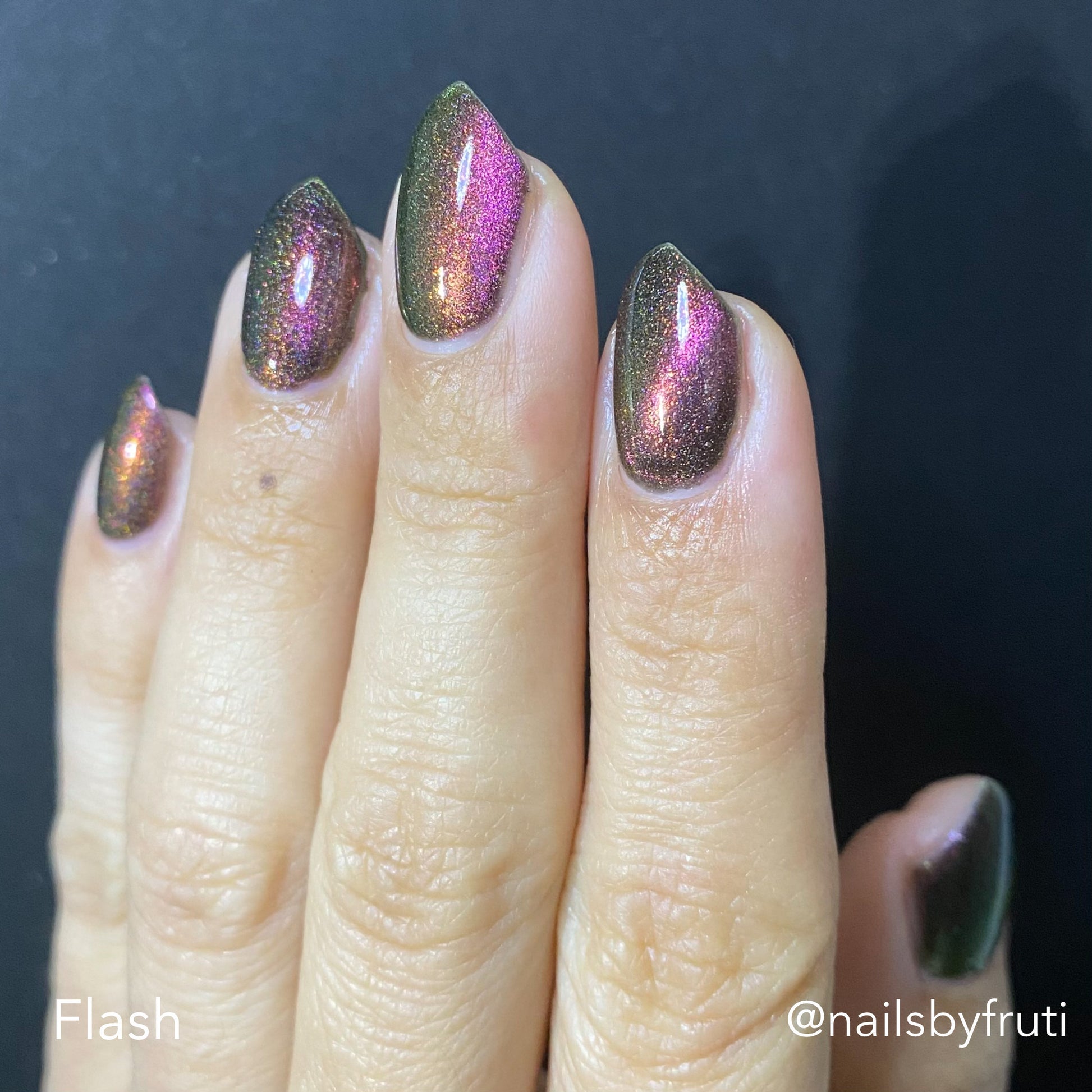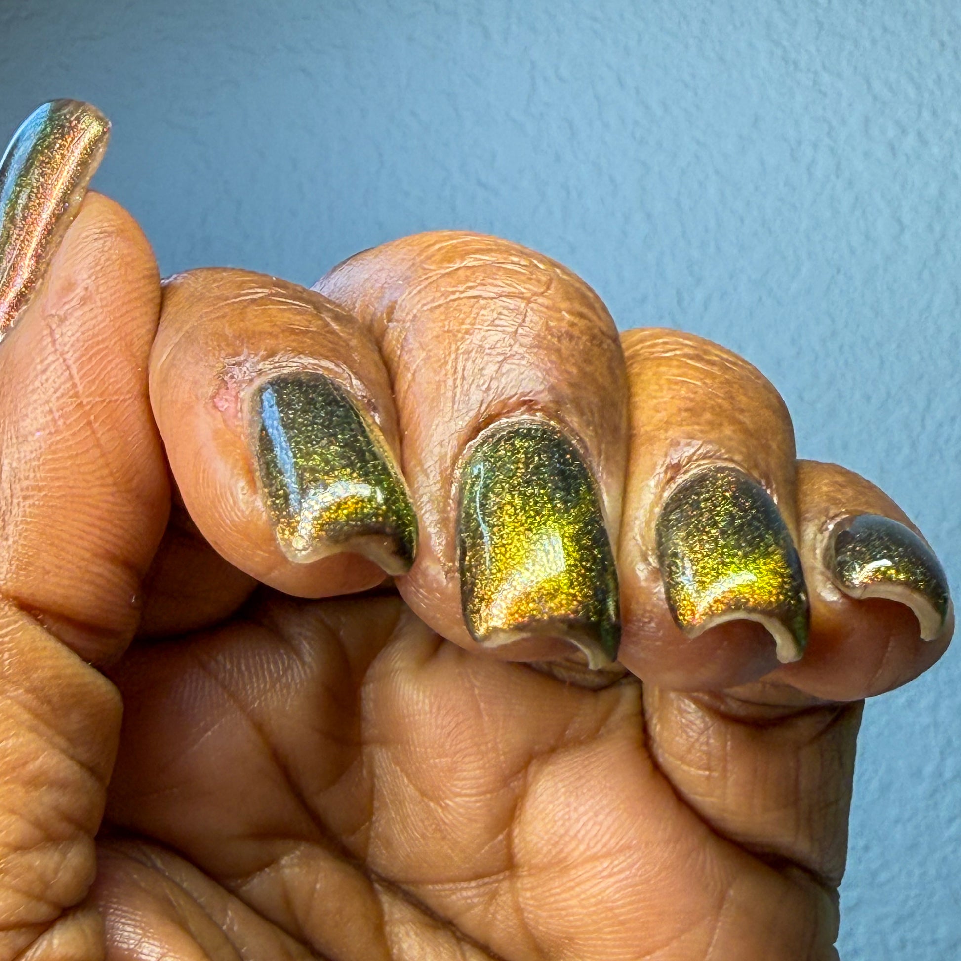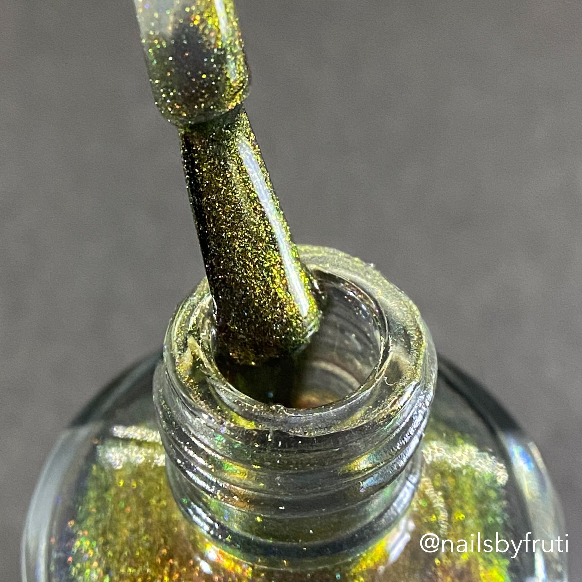 Snacks in bed reminds me of sparkly Cheeto dust over a multi-chrome polish. This grungy polish lovers dream is a green-orange-gold shifting shimmer swimming in a black crelly base with a red to gold magnetic, green at extreme angles. Is this the prugly of the collection? I guess beauty is in the eye of the beholder!