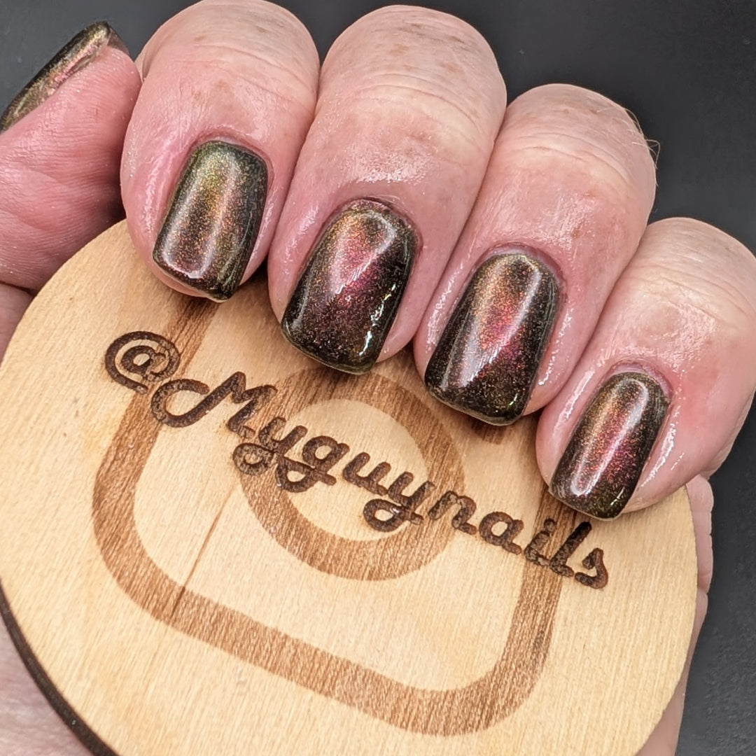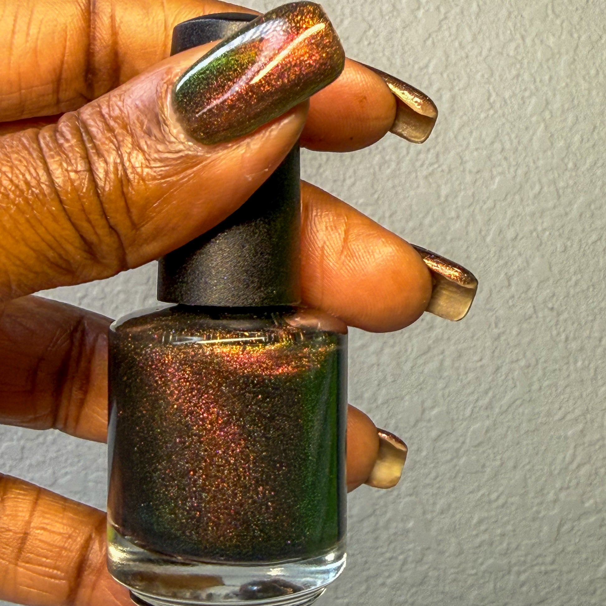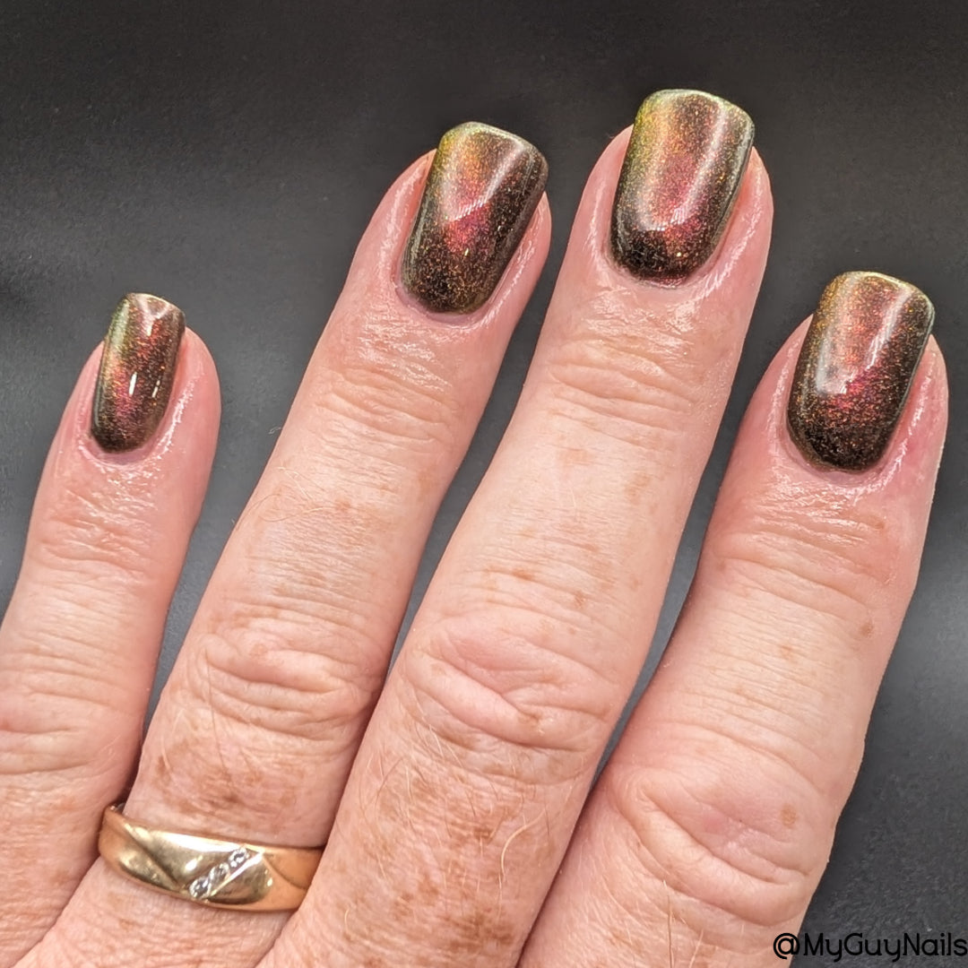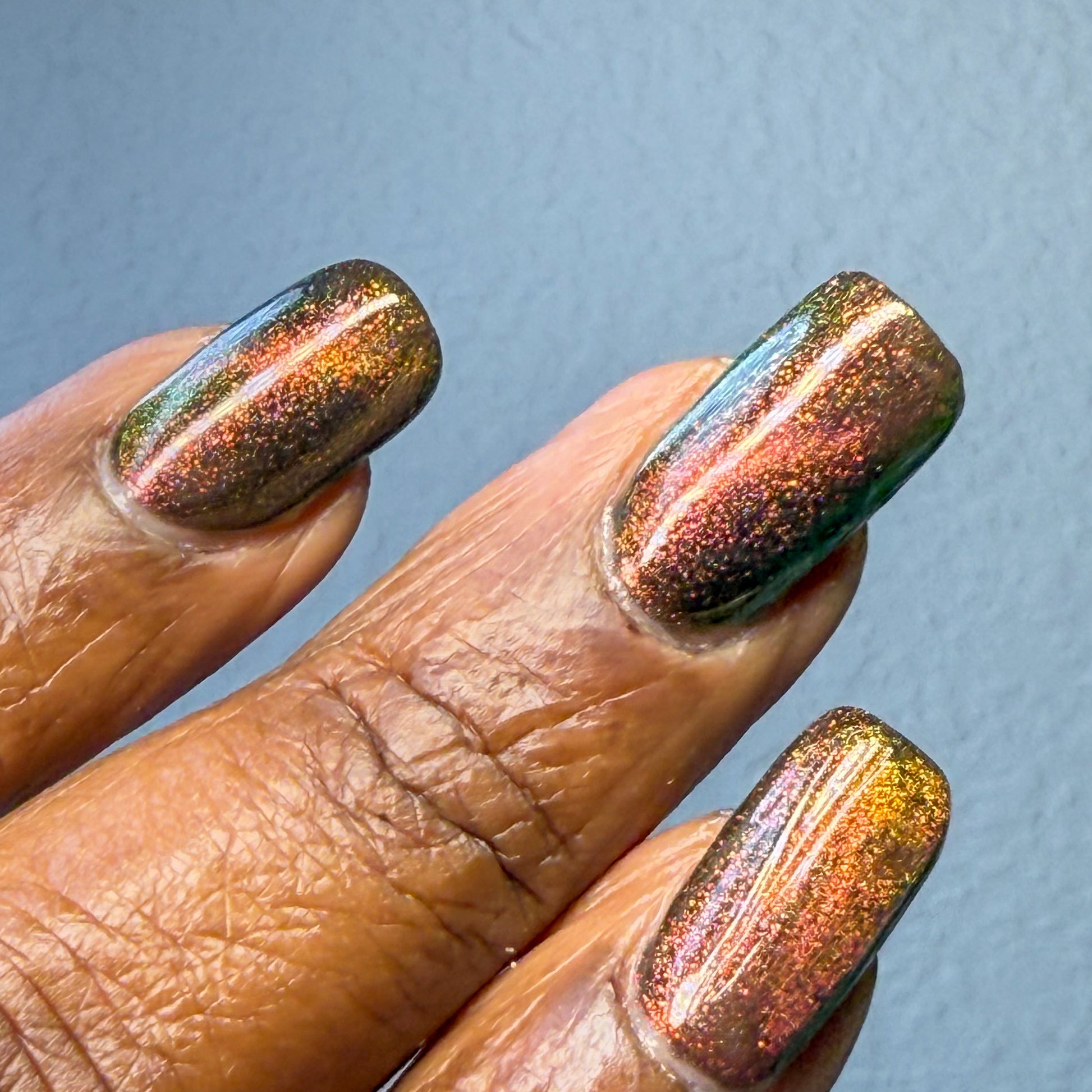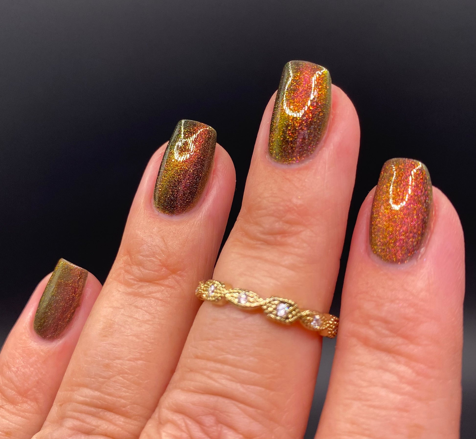 Snacks in bed reminds me of sparkly Cheeto dust over a multi-chrome polish. This grungy polish lovers dream is a green-orange-gold shifting shimmer swimming in a black crelly base with a red to gold magnetic, green at extreme angles. Is this the prugly of the collection? I guess beauty is in the eye of the beholder!