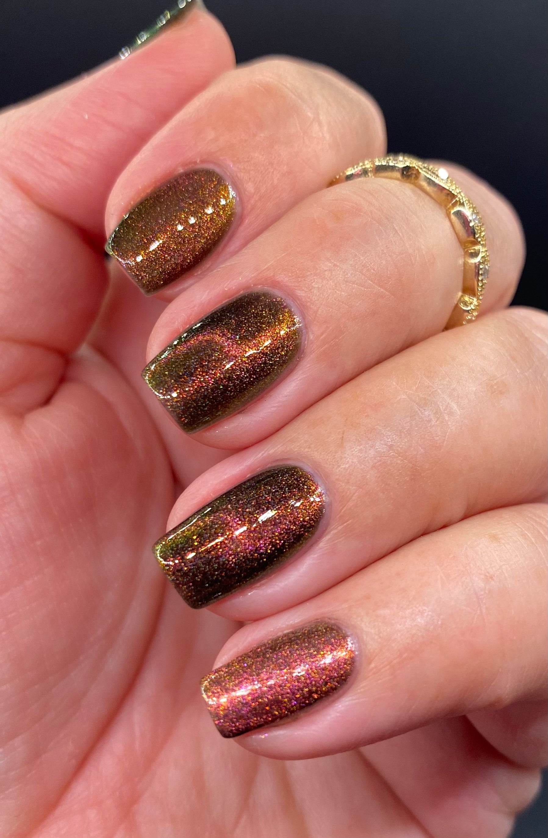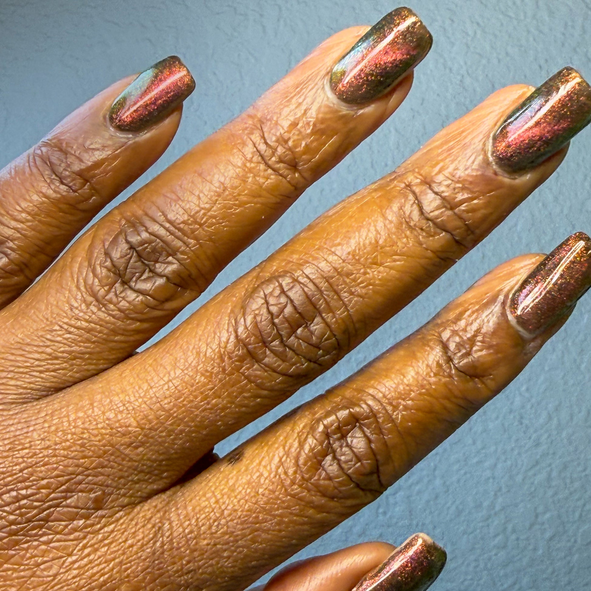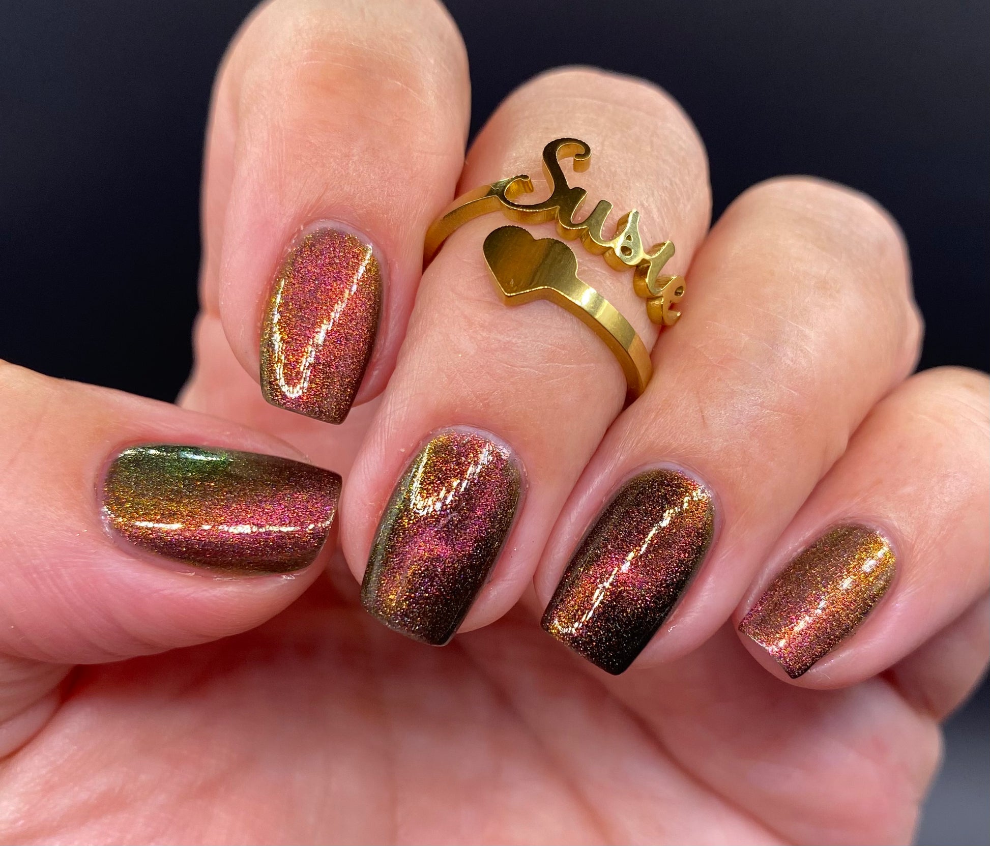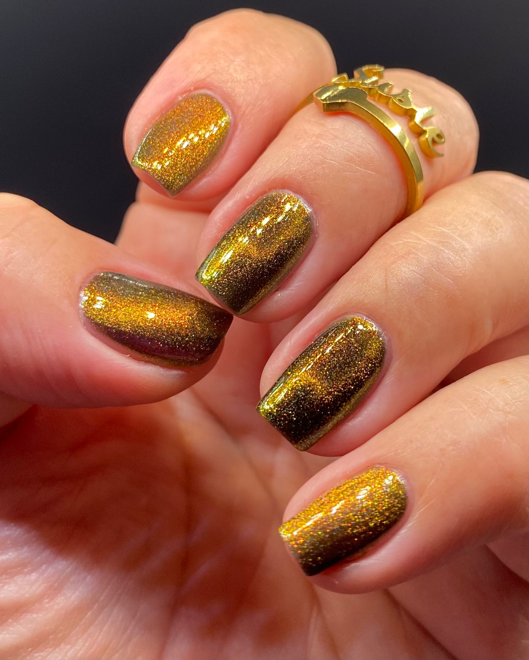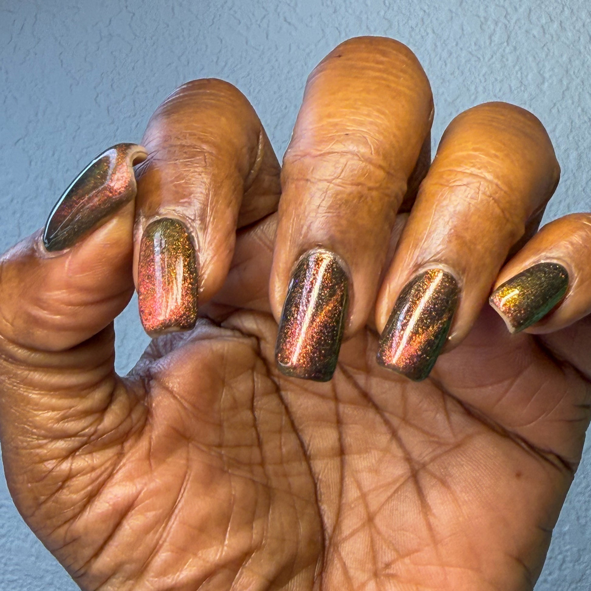 Snacks in bed reminds me of sparkly Cheeto dust over a multi-chrome polish. This grungy polish lovers dream is a green-orange-gold shifting shimmer swimming in a black crelly base with a red to gold magnetic, green at extreme angles. Is this the prugly of the collection? I guess beauty is in the eye of the beholder!