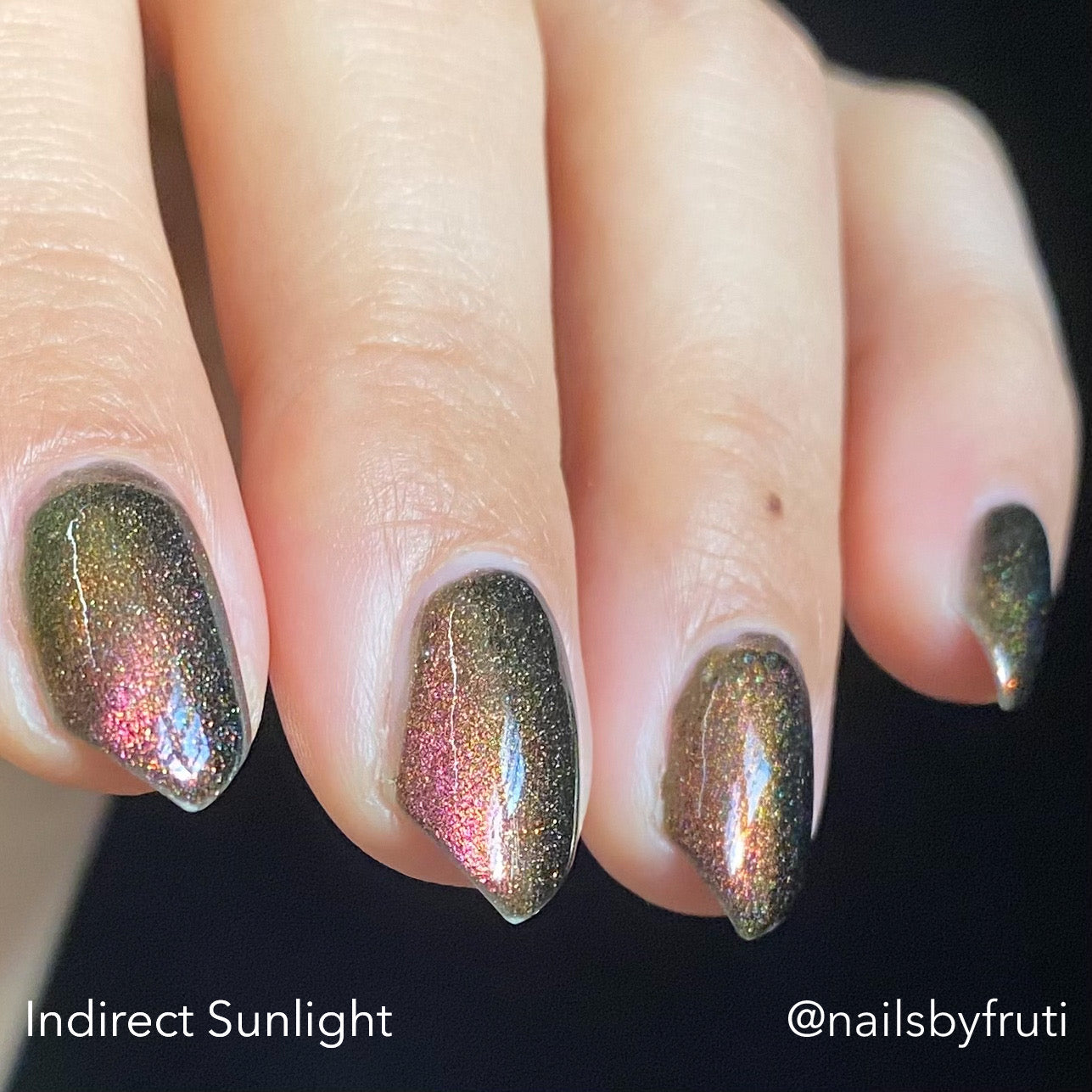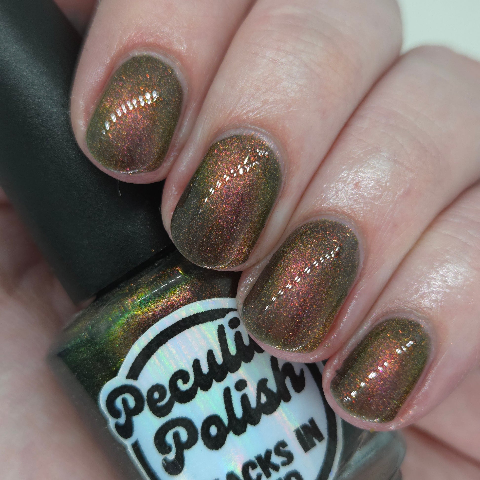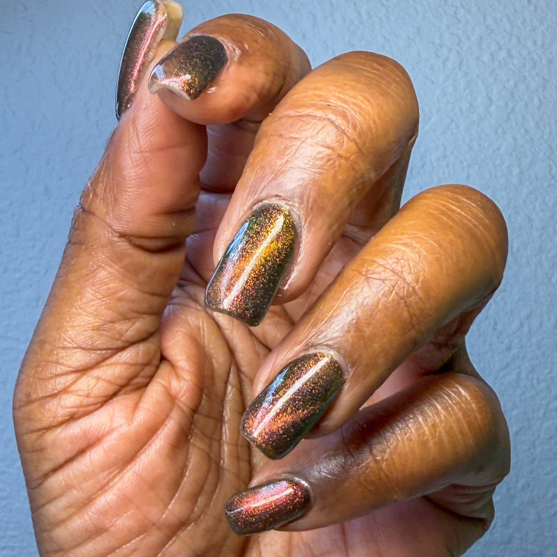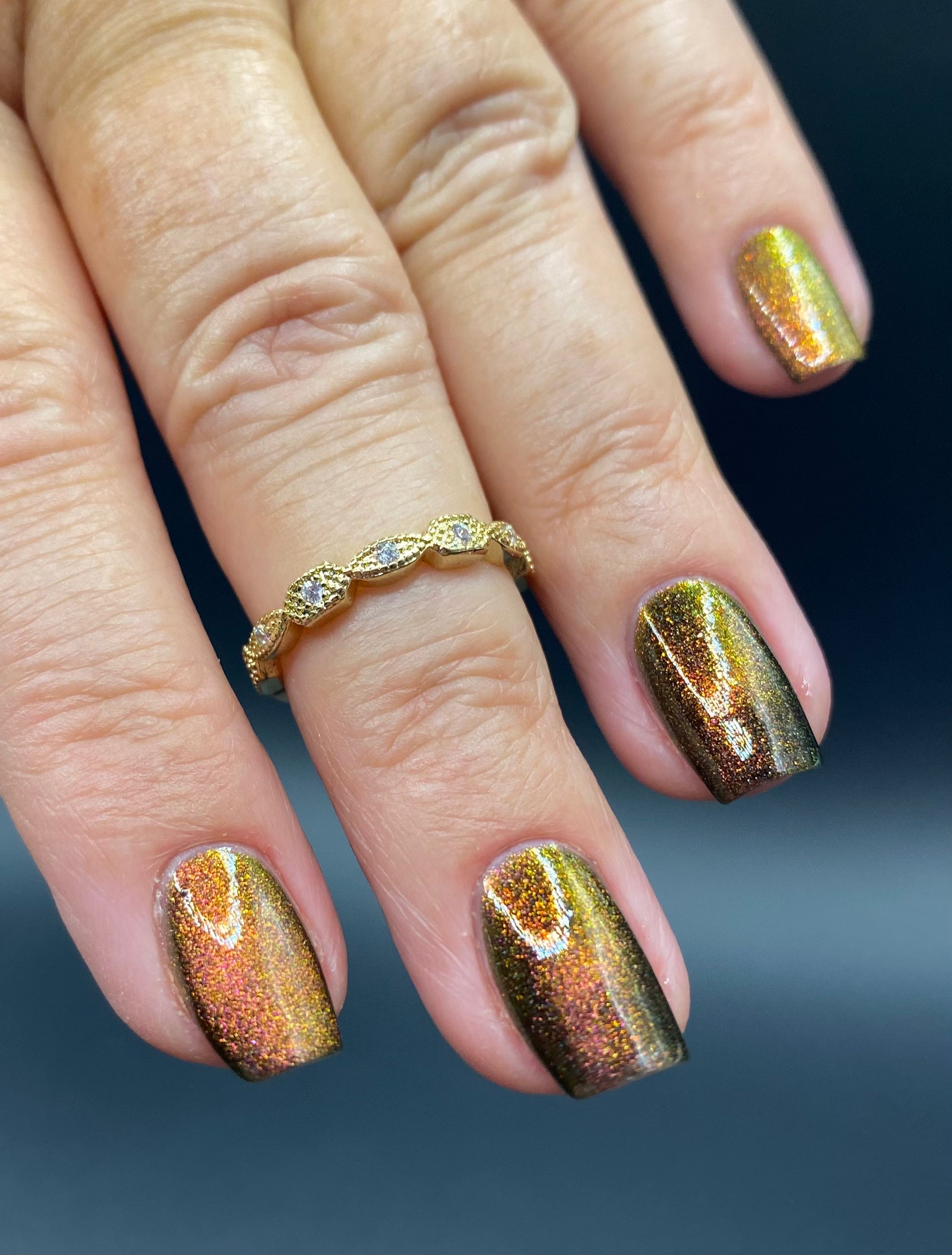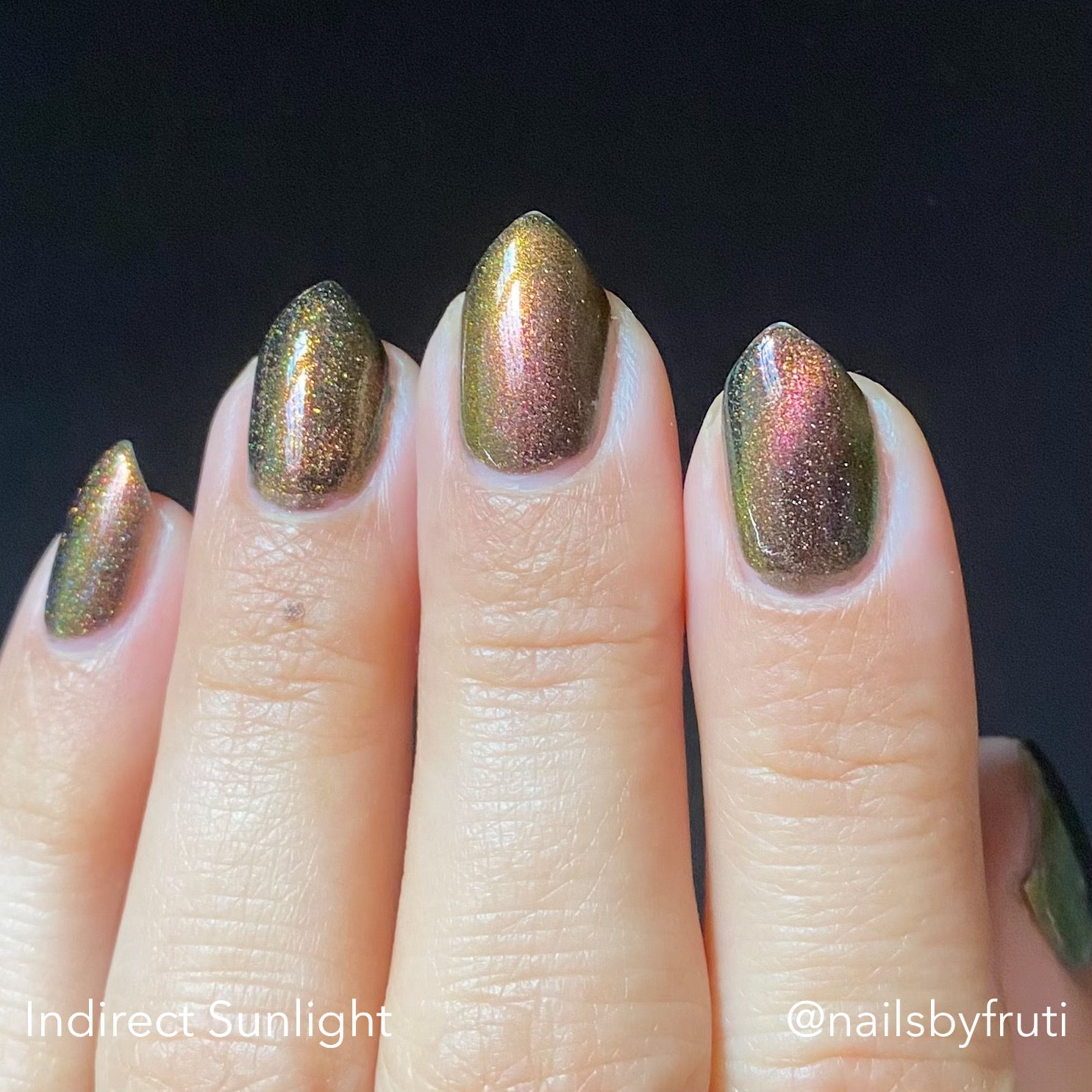 Snacks in bed reminds me of sparkly Cheeto dust over a multi-chrome polish. This grungy polish lovers dream is a green-orange-gold shifting shimmer swimming in a black crelly base with a red to gold magnetic, green at extreme angles. Is this the prugly of the collection? I guess beauty is in the eye of the beholder!