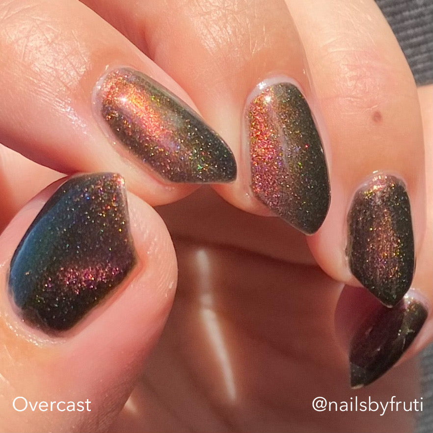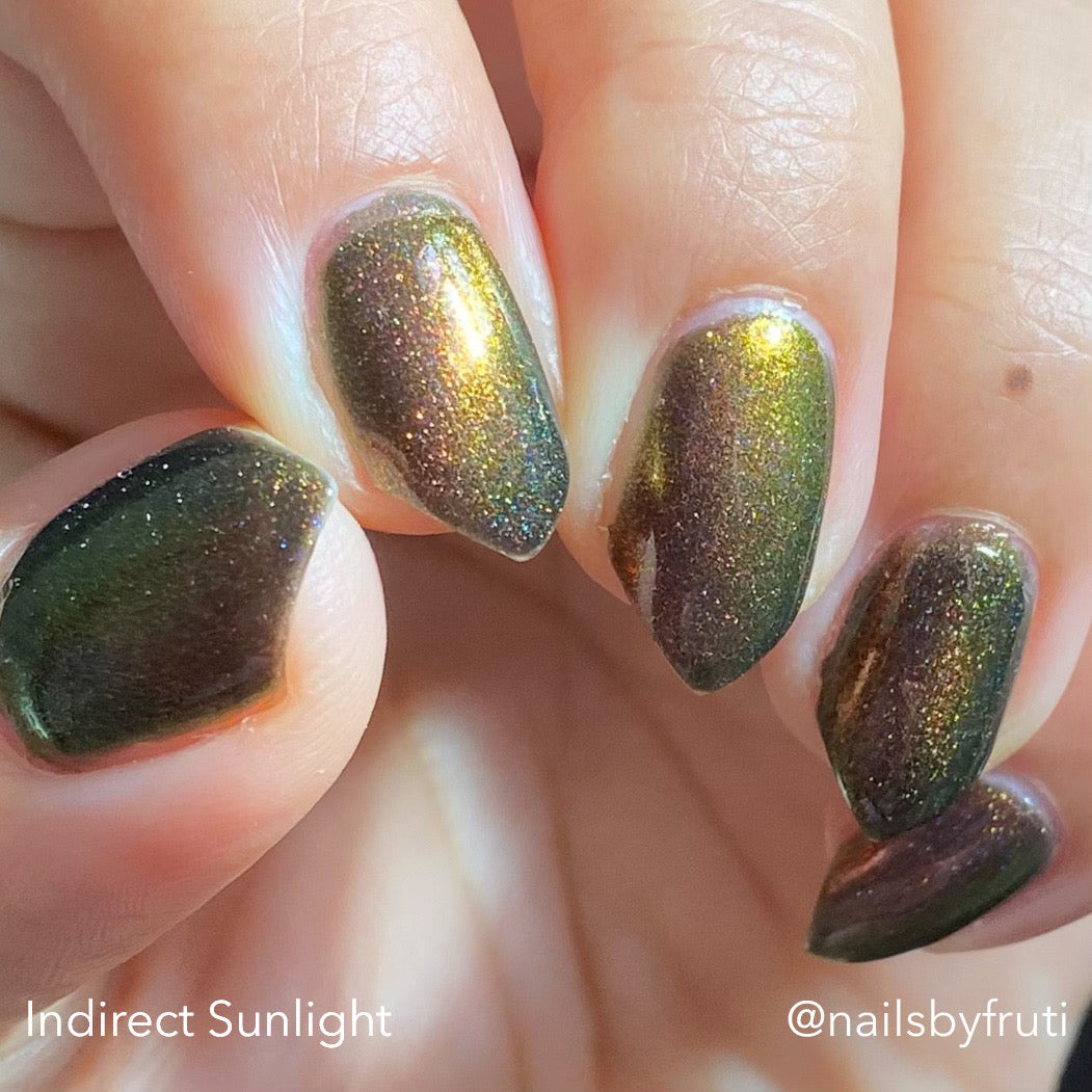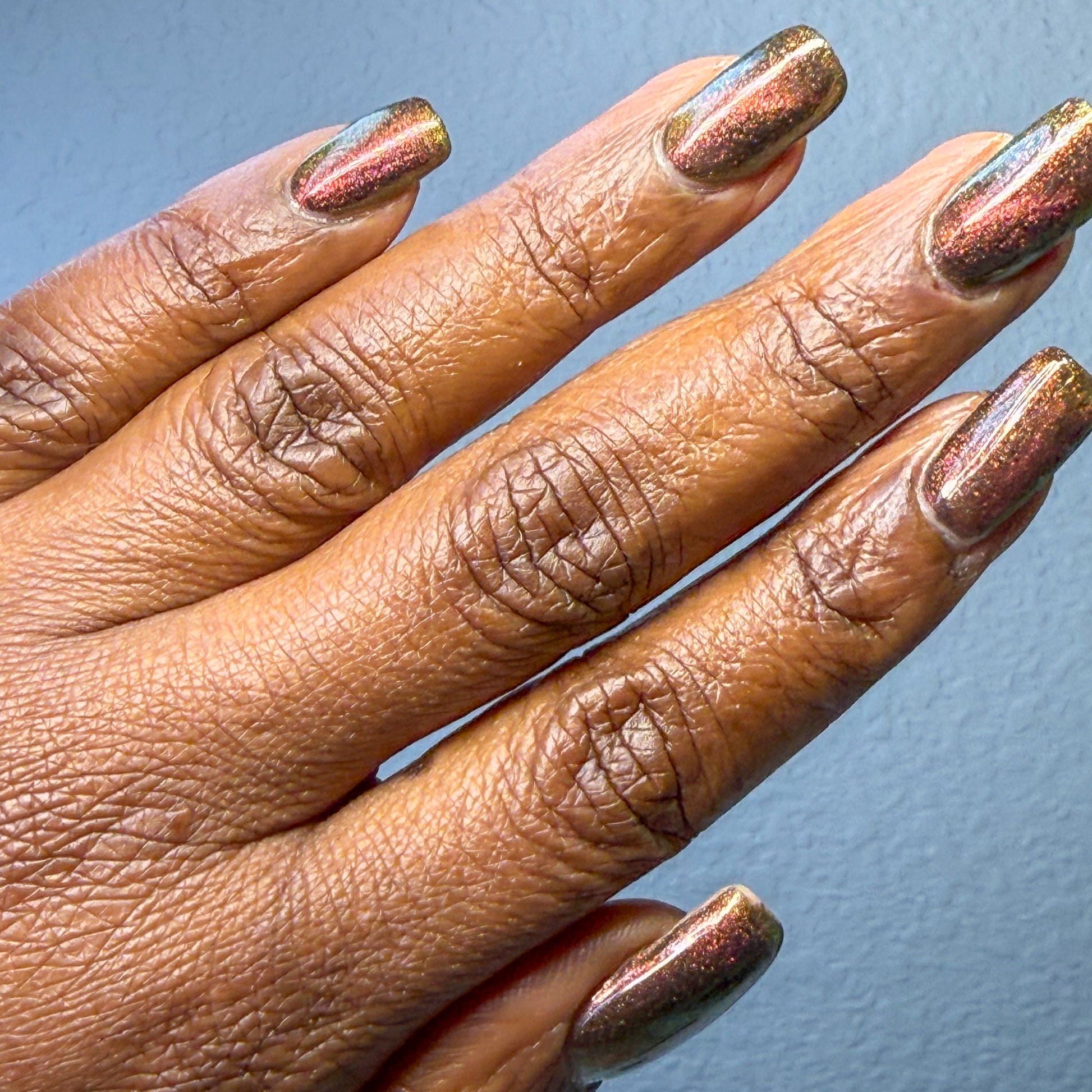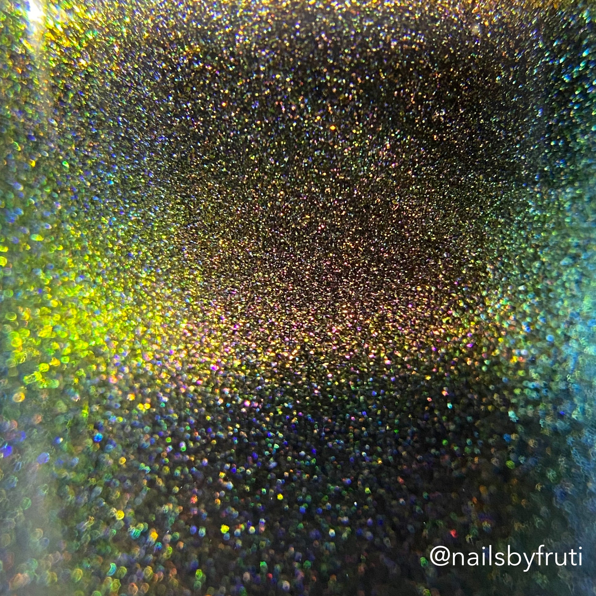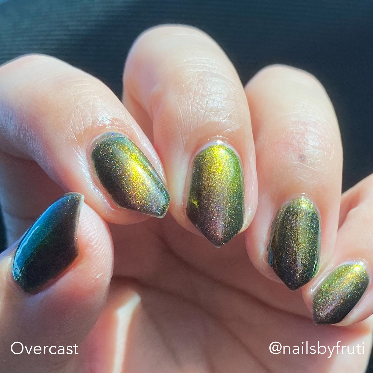 Snacks in bed reminds me of sparkly Cheeto dust over a multi-chrome polish. This grungy polish lovers dream is a green-orange-gold shifting shimmer swimming in a black crelly base with a red to gold magnetic, green at extreme angles. Is this the prugly of the collection? I guess beauty is in the eye of the beholder!