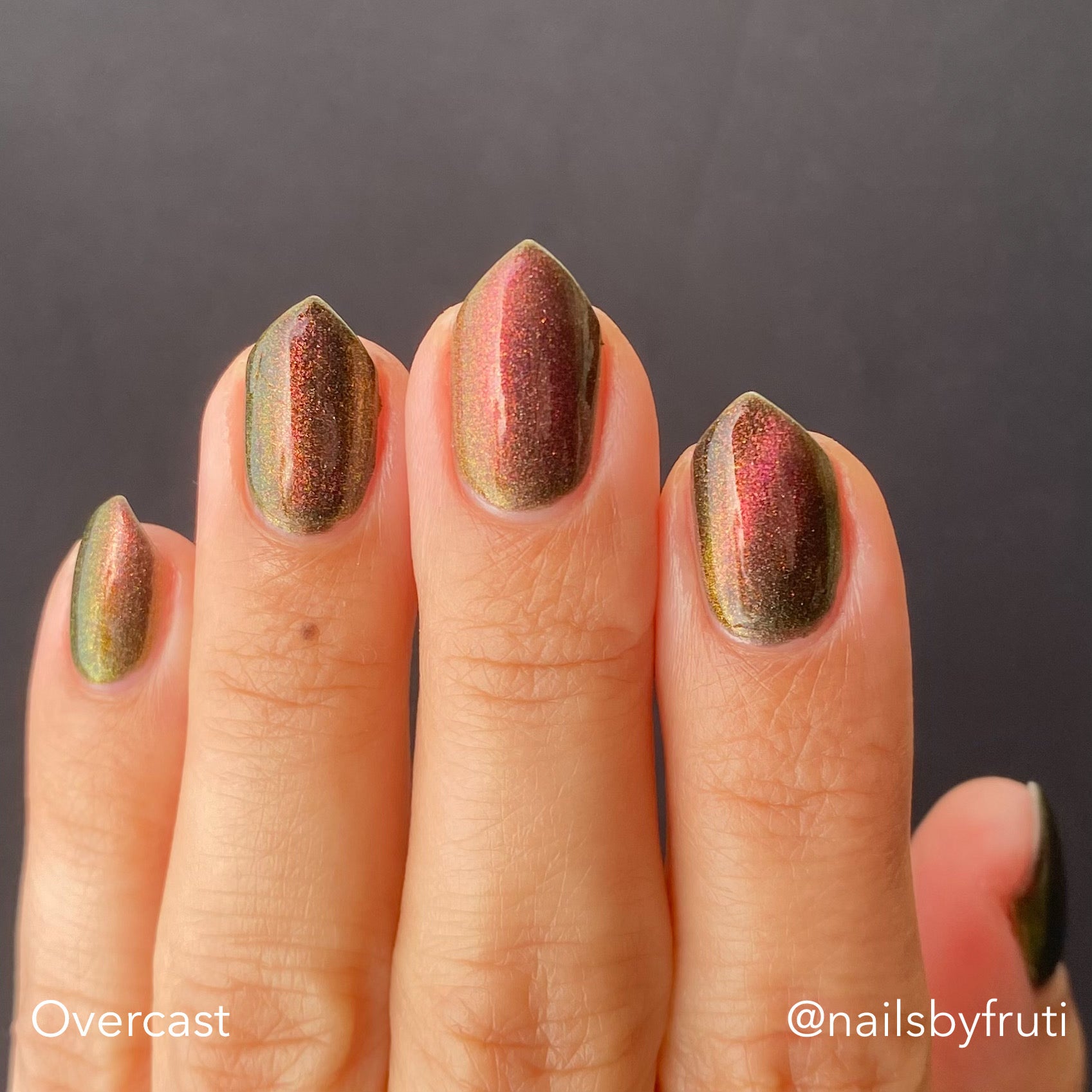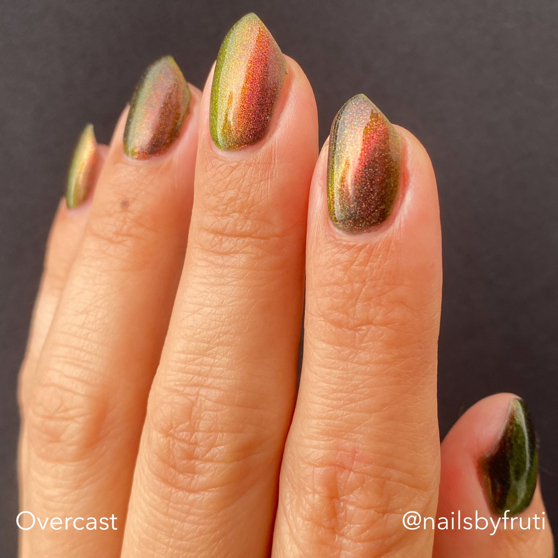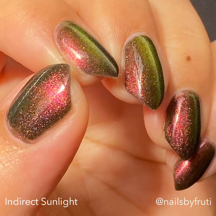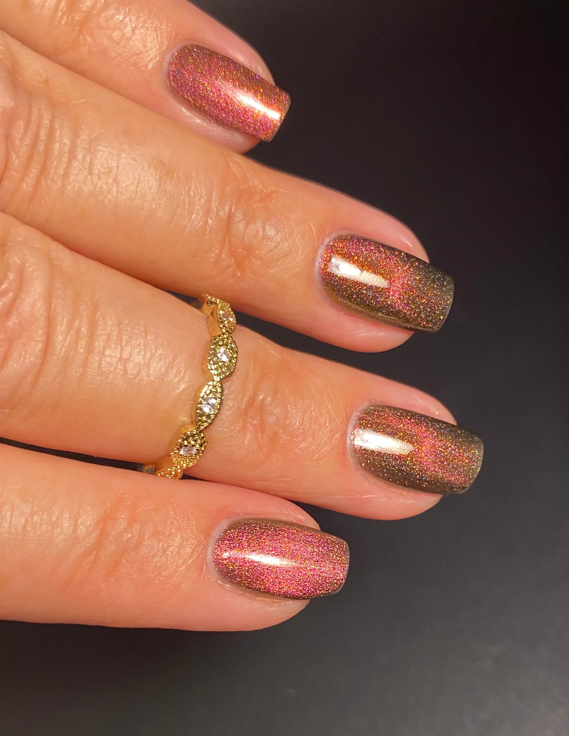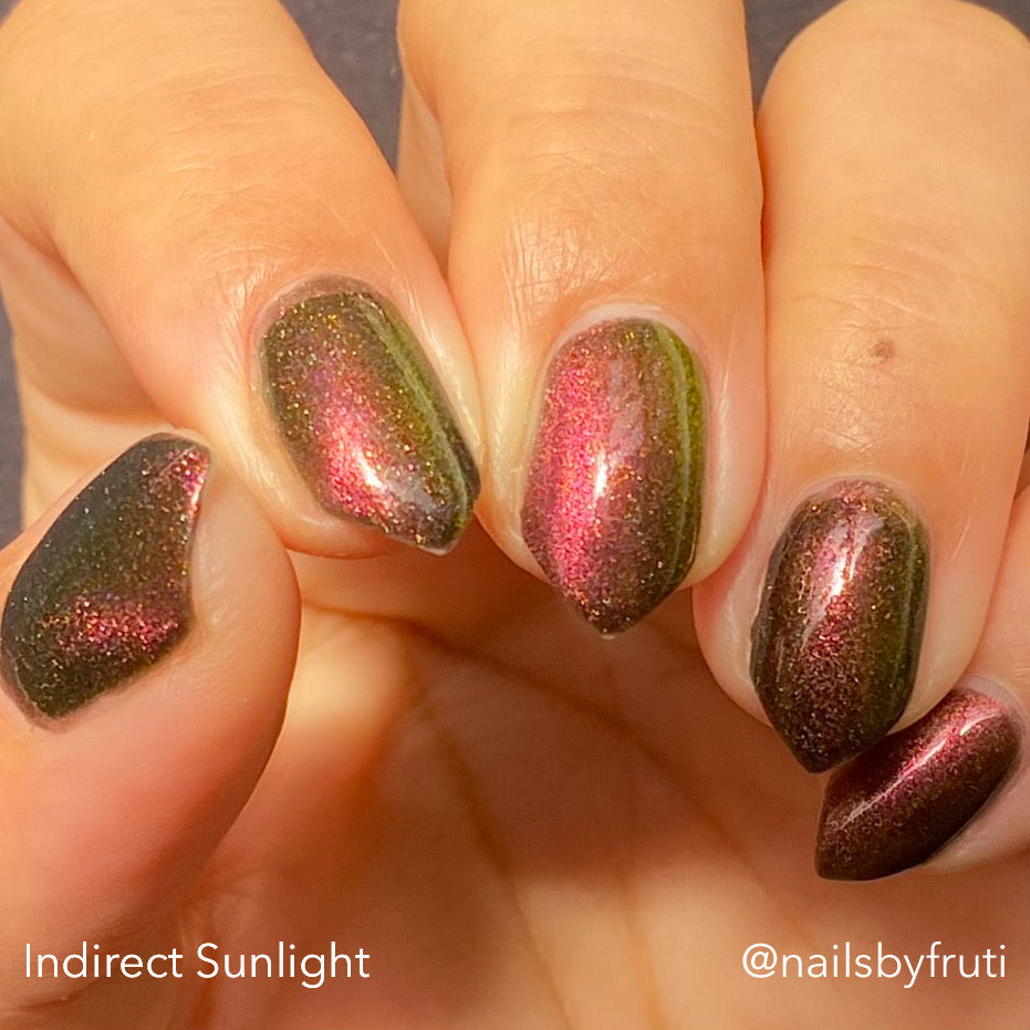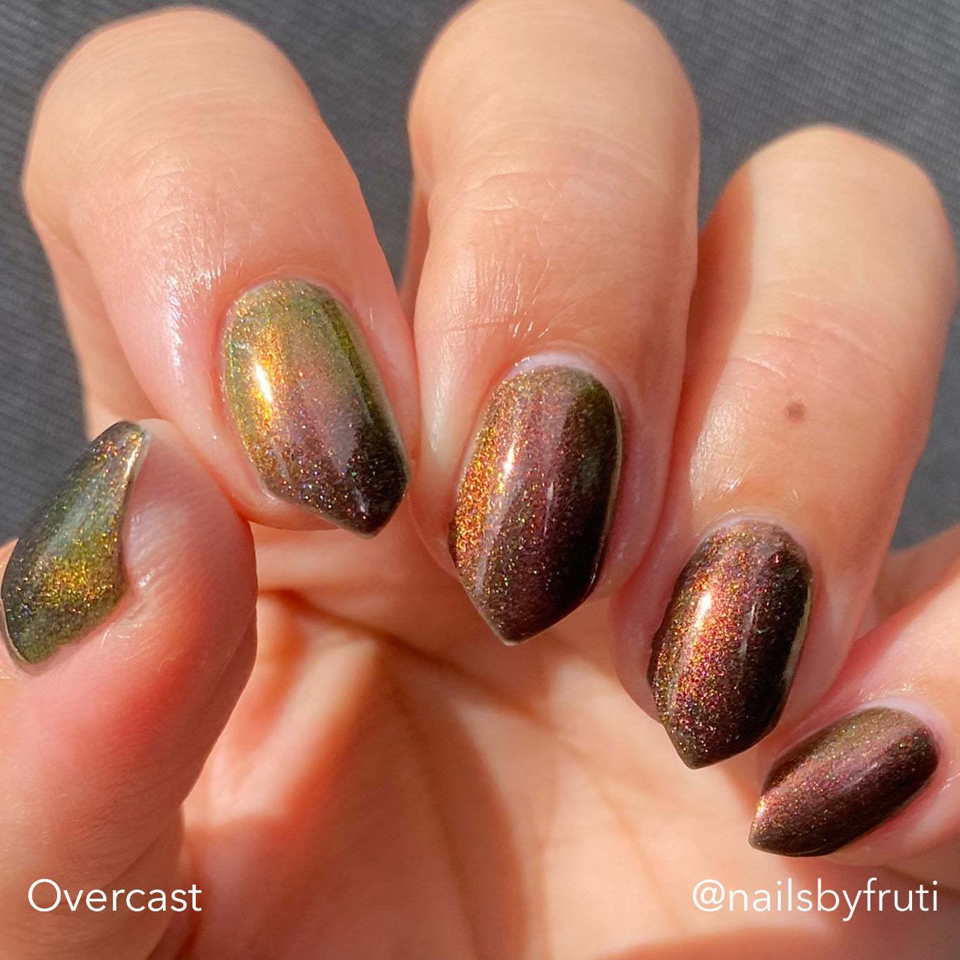 Snacks in bed reminds me of sparkly Cheeto dust over a multi-chrome polish. This grungy polish lovers dream is a green-orange-gold shifting shimmer swimming in a black crelly base with a red to gold magnetic, green at extreme angles. Is this the prugly of the collection? I guess beauty is in the eye of the beholder!