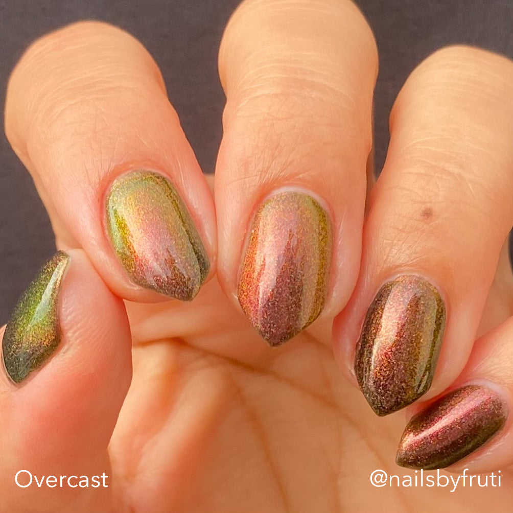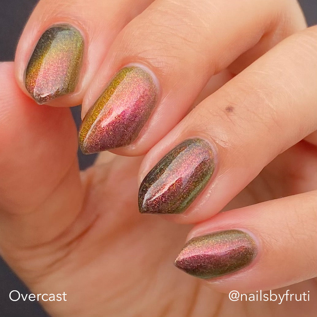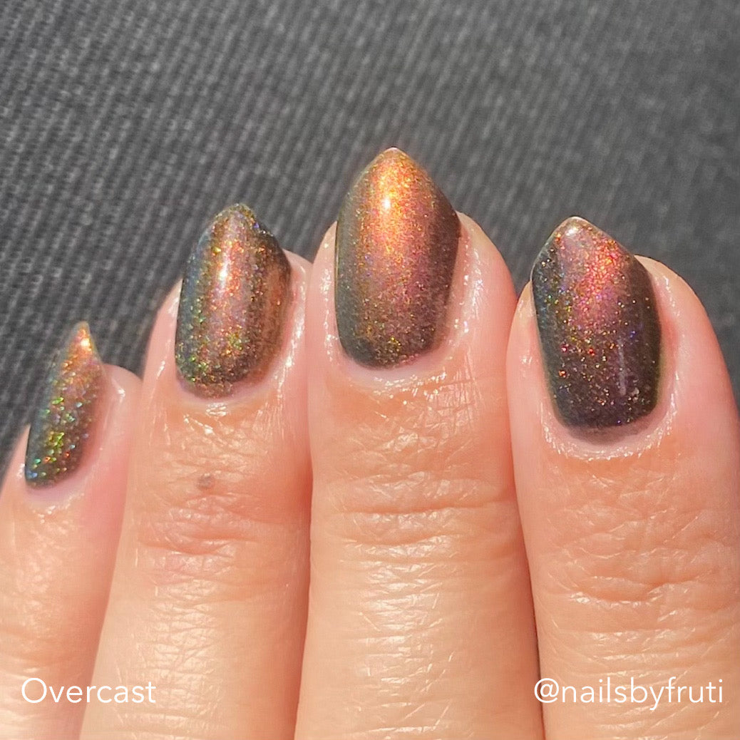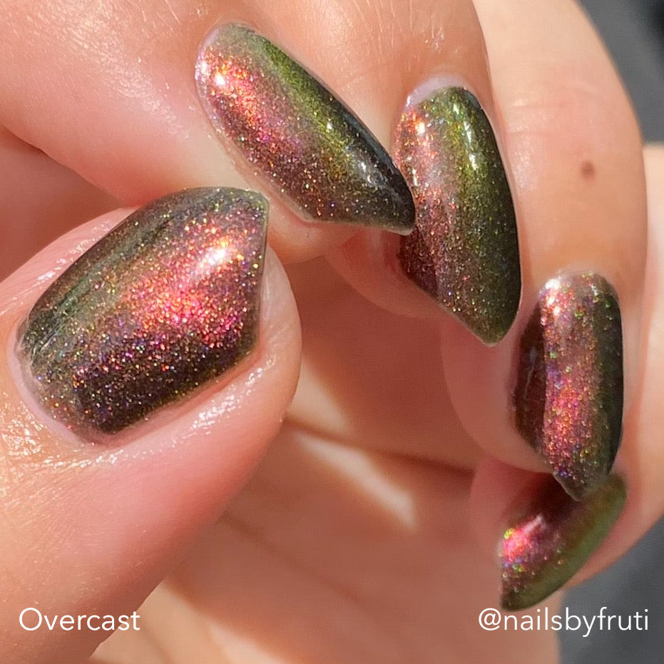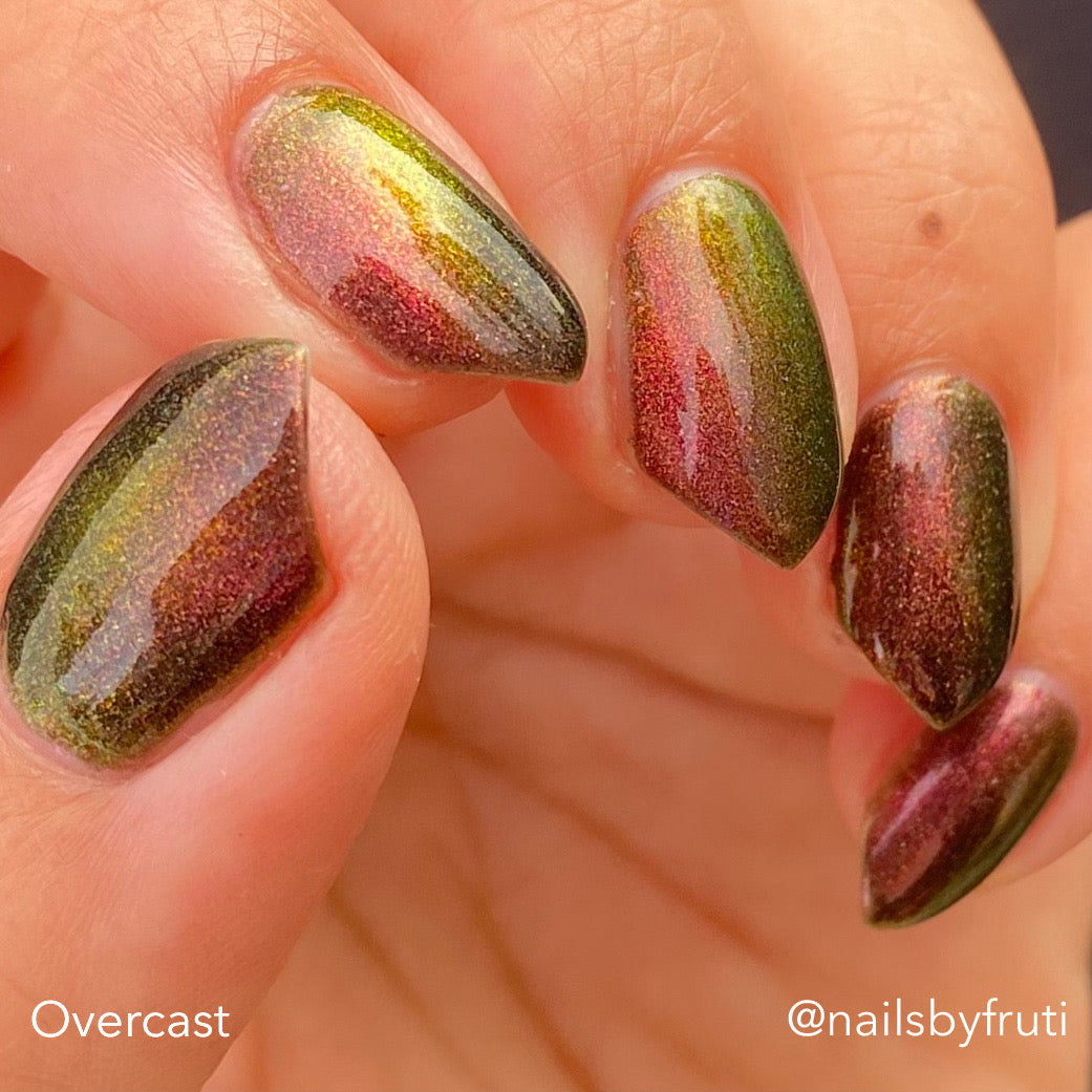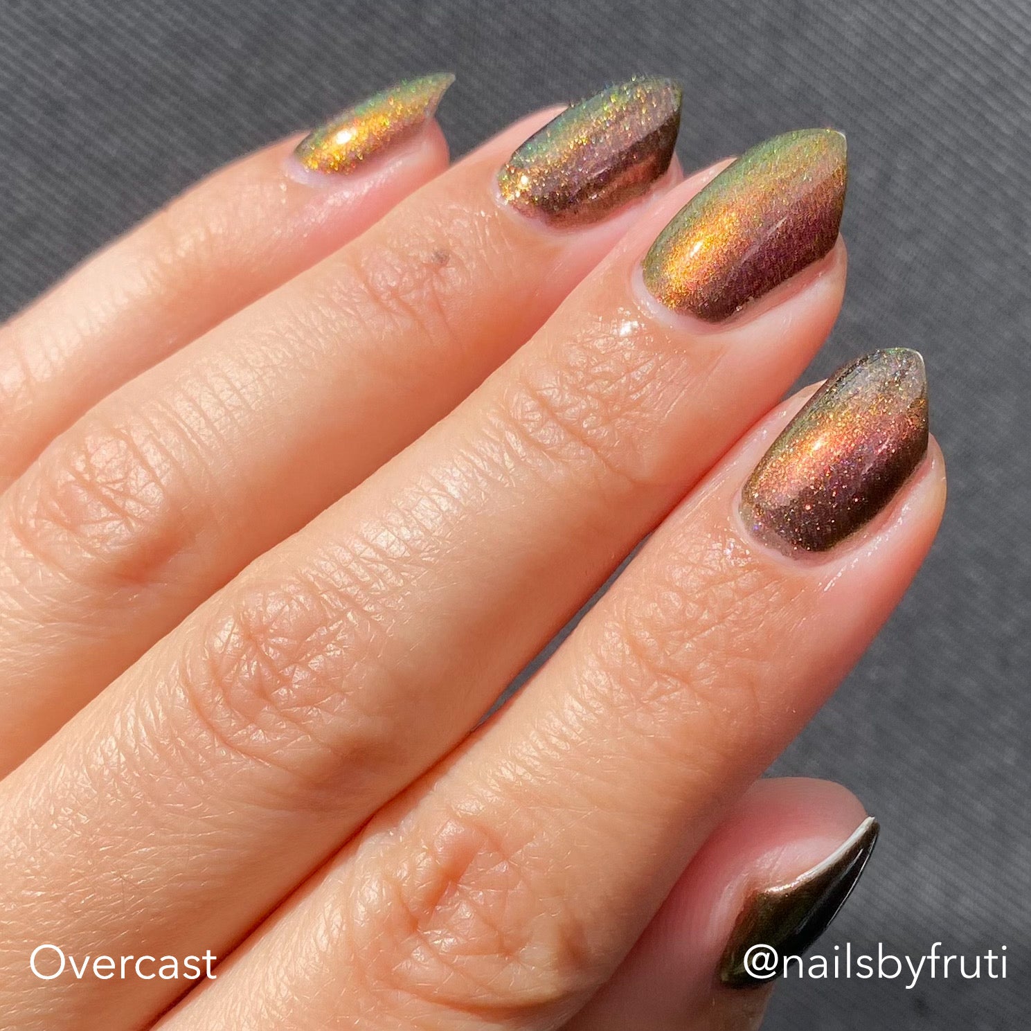 Snacks in bed reminds me of sparkly Cheeto dust over a multi-chrome polish. This grungy polish lovers dream is a green-orange-gold shifting shimmer swimming in a black crelly base with a red to gold magnetic, green at extreme angles. Is this the prugly of the collection? I guess beauty is in the eye of the beholder!