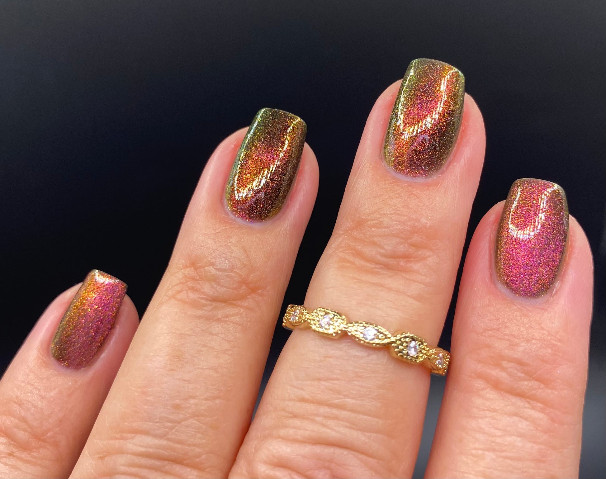 4: Use a quick dry top coat (with the magnet) such as our Fast, Hard & Shiny top coat to seal in that effect you have chosen (cat eye, velvet, lightning bolt, ect) and work 1 finger at a time. Our top coat dries incredibly fast so using the magnet with the top coat ensures your effect of choice stays.